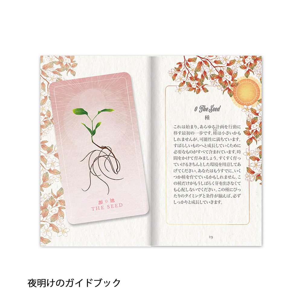 個々のカードは飛躍と休息のふた通りのリーディングができ、2冊のガイドブックが付属します。具体的な目的を目指して頑張っているのであれば「夜明け」、まずは心を健康にしたいと考えているのであれば「夕暮れ」のガイドブックを開きましょう。自然界からの導きを受け取ることができるでしょう。