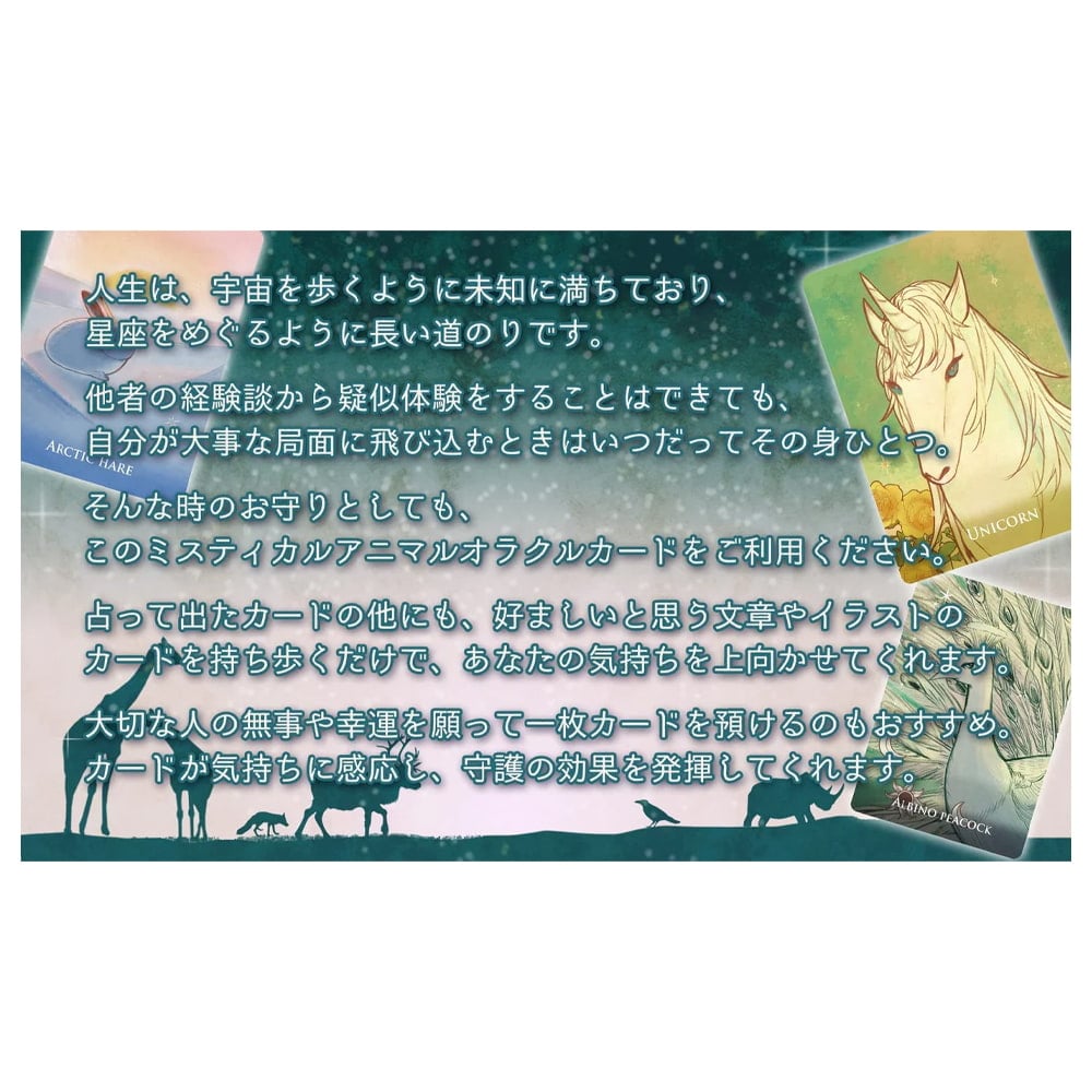 人生は、宇宙を歩くように未知に満ちており、星座をめぐるように長い道のりです。他者の経験談から疑似体験をすることはできても、自分が大事な局面に飛び込むときはいつだってその身ひとつ。そんな時のお守りとしても、このミスティカルアニマルオラクルカードを利用することができます。カードが気持ちに感応し、守護の効果を発揮してくれるのです。このカードは、あなたを否定しません。ありのままのあなたの姿を肯定するために生まれた、動物の精霊たちのカードです。