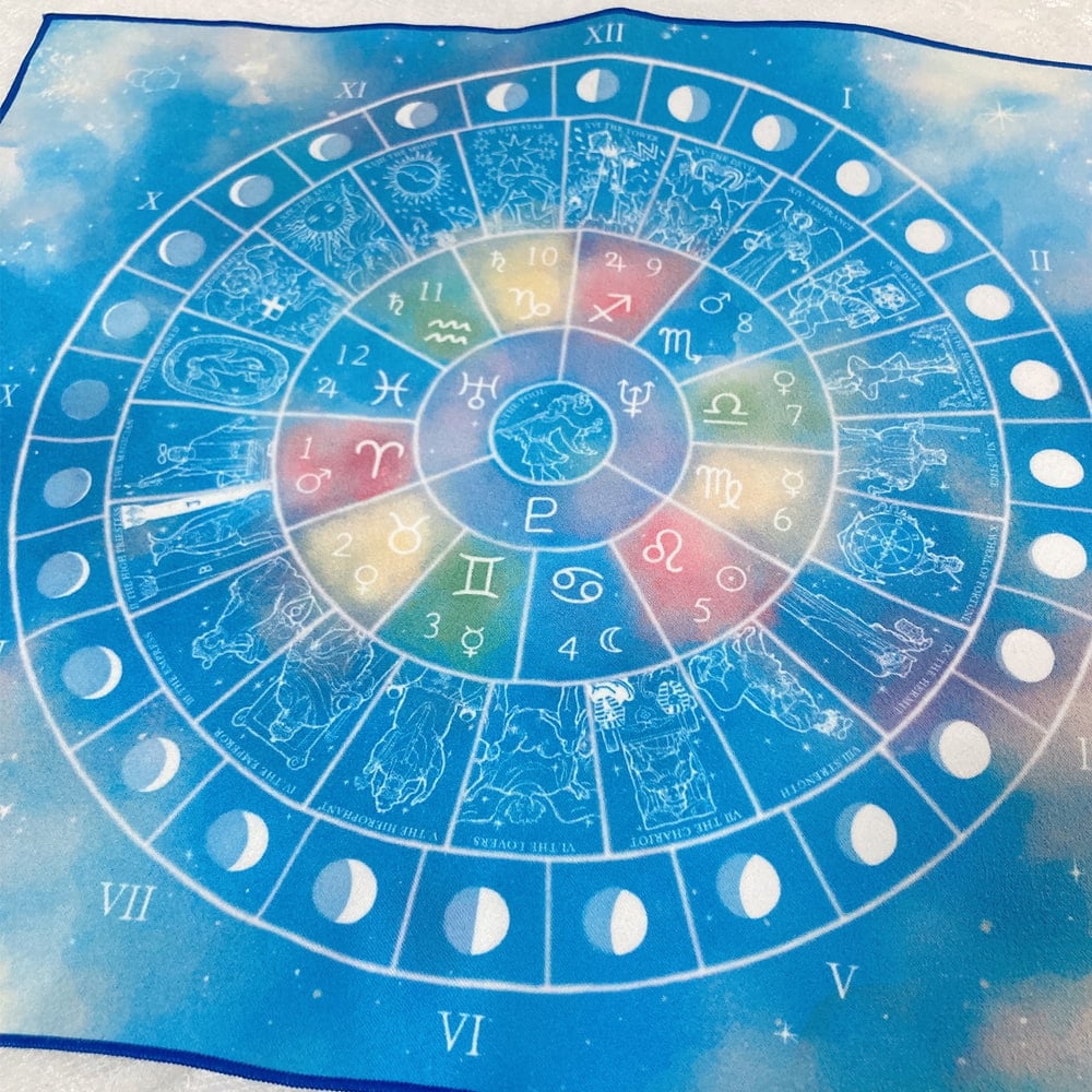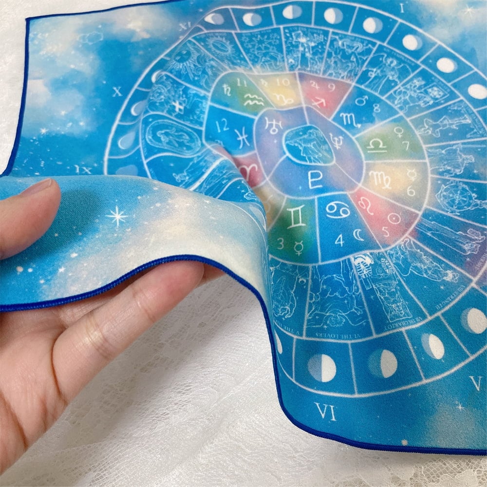 シートには星座や惑星、タロットに月の満ち欠けなどが描かれています。 ミニタロットクロス、ダウンジングシートとしても使えます。
