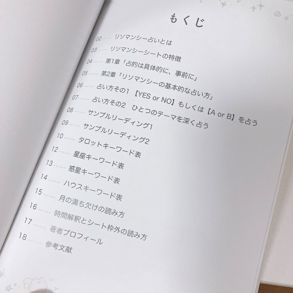 解説書は、ファンシーリソマンシーにも使えるリソマンシーの解説書です! リソマンシーがはじめてという方におすすめ。 フルカラー、写真つきでわかりやすく占い方を解説しています。 後ろのページにはメモ帳もあります。