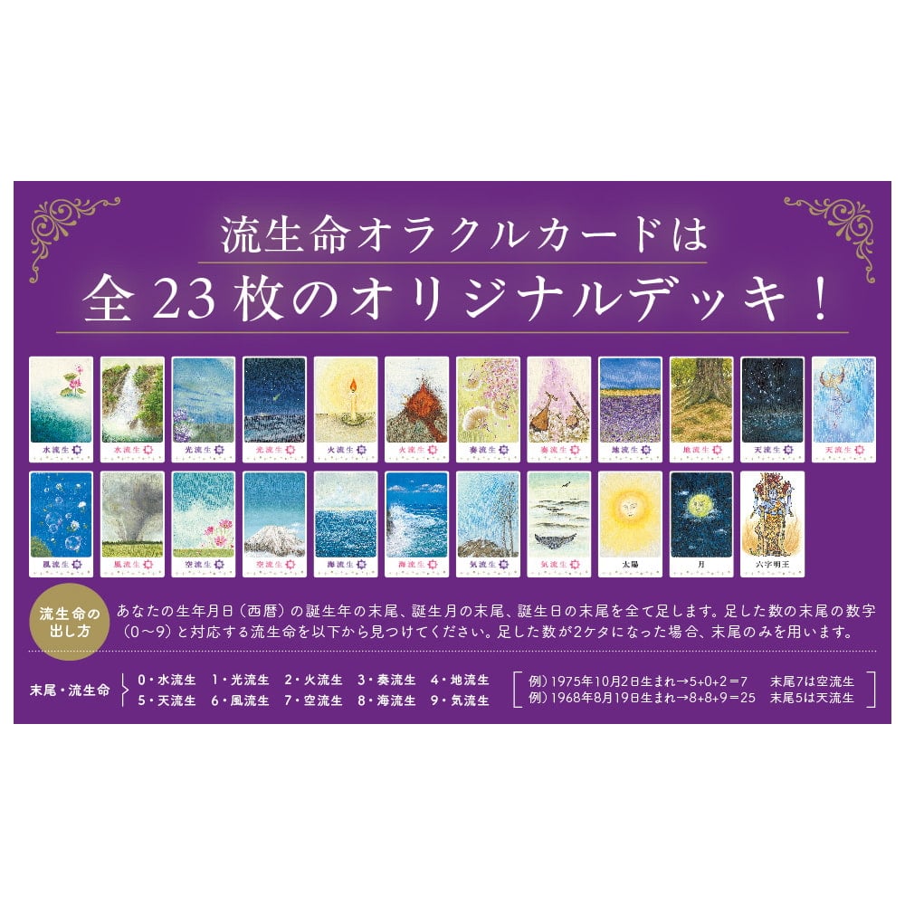 毎日、365日! カードを引くだけで運と心を整える。 大人気シリーズ「あなたの流生命」 累計220万部突破。スーパー霊能力者・下ヨシ子のベストセラー「流生命」がオリジナルオラクルカードに! 365日「流生命」によって神様からのメッセージを受け取れます。人生の流れを示す流生命は20タイプあり、流生命オラクルカードは六字明王、太陽と月を合わせた全23枚のオリジナルデッキ。カードの絵柄もオリジナル仕様となっており、仏画の森永愛倖が描いた神秘的なイラストを使用。仏様が浮かび上がる奇跡のイラストを用いたカードで「今日の運勢」「二者選択」「過去・現在・未来」「運勢の流れ」などあらゆる悩みを問いかけてみてください。また「1枚引き」「2枚引き」「3枚引き」「5枚引き」とカードの引き方もさまざまなパターンが。きっとあなたのお悩みに合わせて神様からのメッセージを受け取って、日々の運と心をしっかり整えていきましょう。