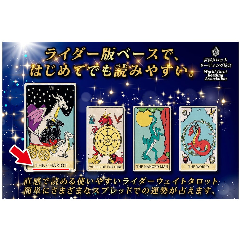 【ウェイト版準拠×ドラゴンの象徴】 伝統的な象徴配置を踏襲しつつ、ドラゴンの世界観で直感的に読めるデッキ。初心者〜上級者まで幅広く活用できます。【日本語のガイドブック付き】 各カードのキーワード&解説、基本の4スプレッド(過去現在未来/ケルト十字/リレーション/ホースシュー)を掲載。購入後すぐにリーディング開始できます