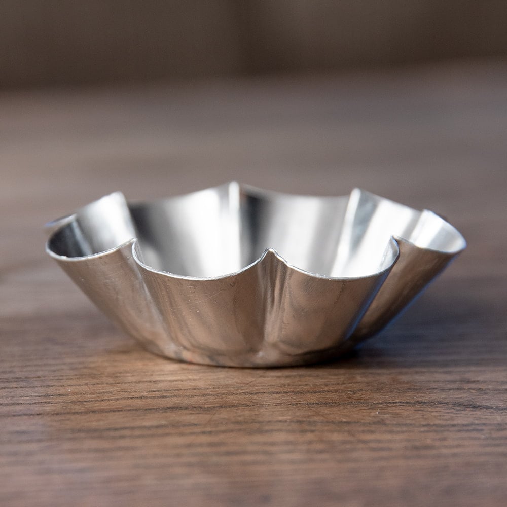 お弁当などでお惣菜を入れる時に使うアルミ箔が、そのまま固くなったような感じです。とても軽いので、醤油などを入れるにはひっくり返りそうで怖いです。お菓子作りには使わないので、アクセサリーやお菓子を入れるのに使う予定です。お花の形が可愛いですが、ひよこが欲しかったです。再入荷すると良いです。
