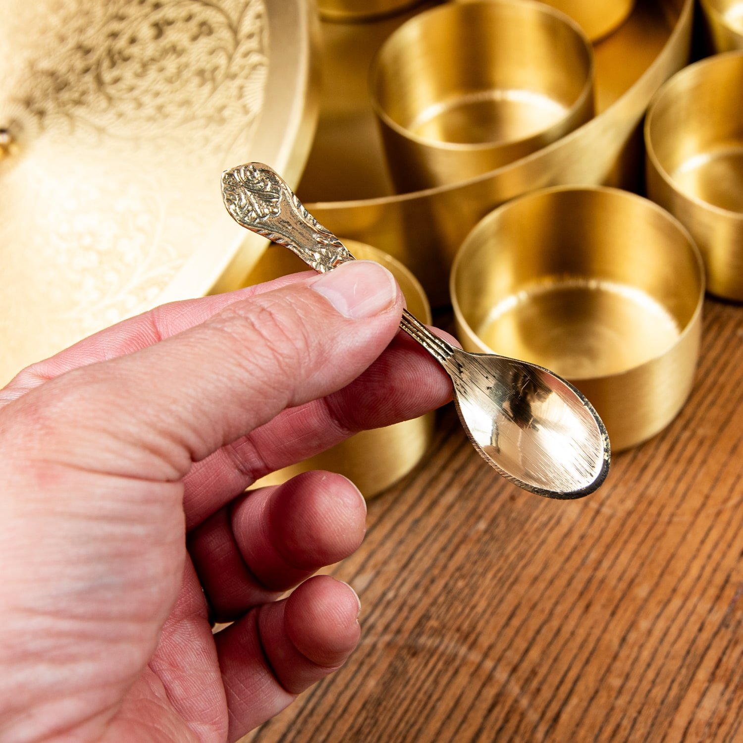 7種類のスパイスを保管できるマサラケース。使いたいスパイスをさっとスプーンで取り出せ、お手入れも楽ちんです。こちらは良質な真鍮を整形したデザイン性の優れた美しいマサラボックスです。