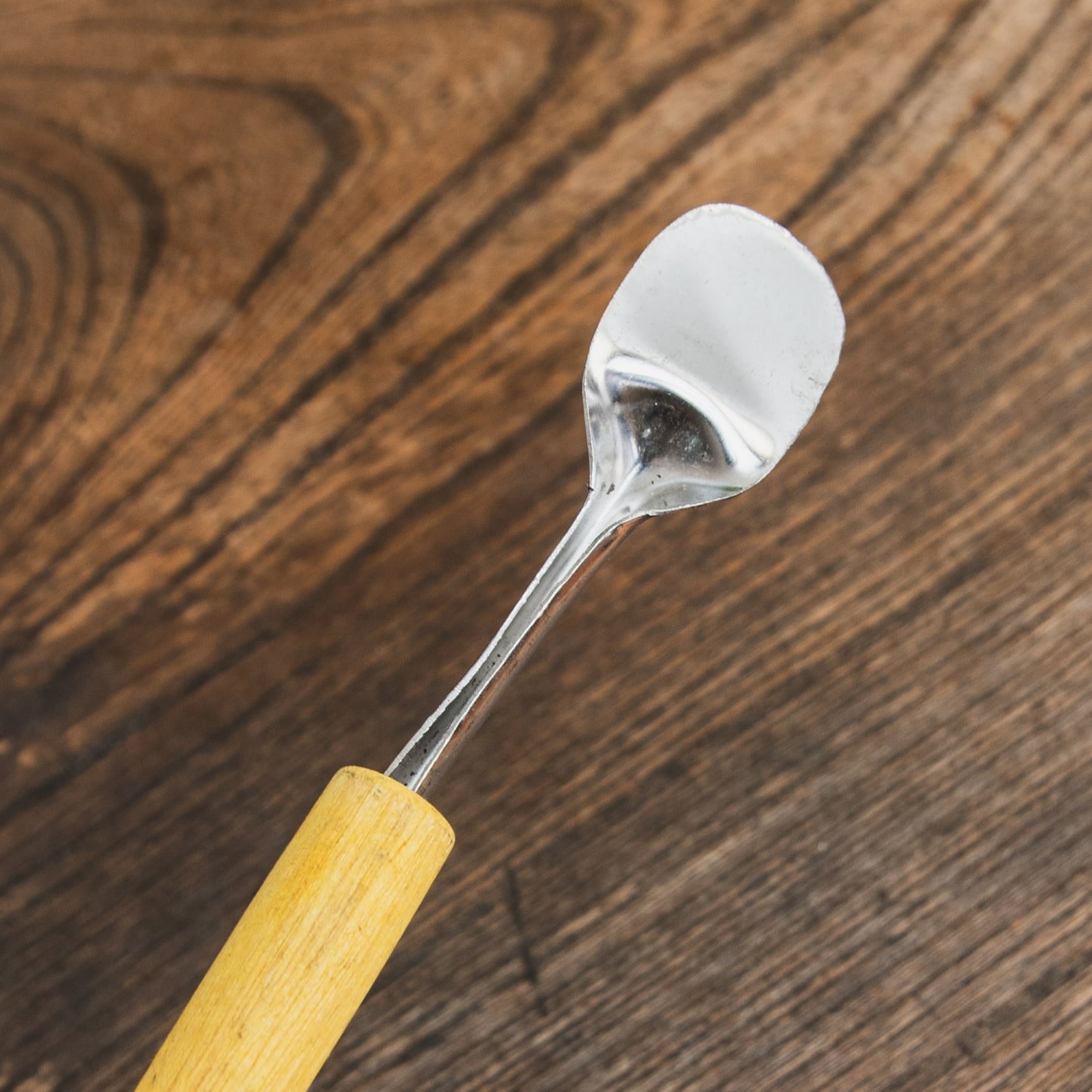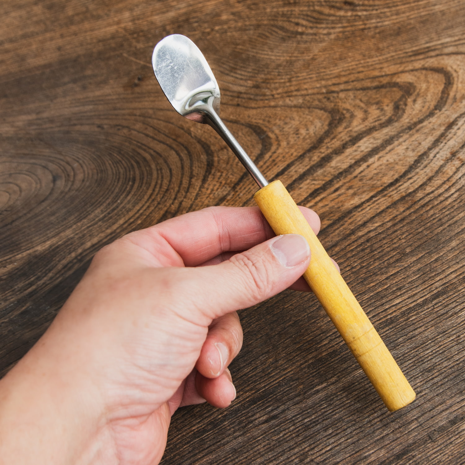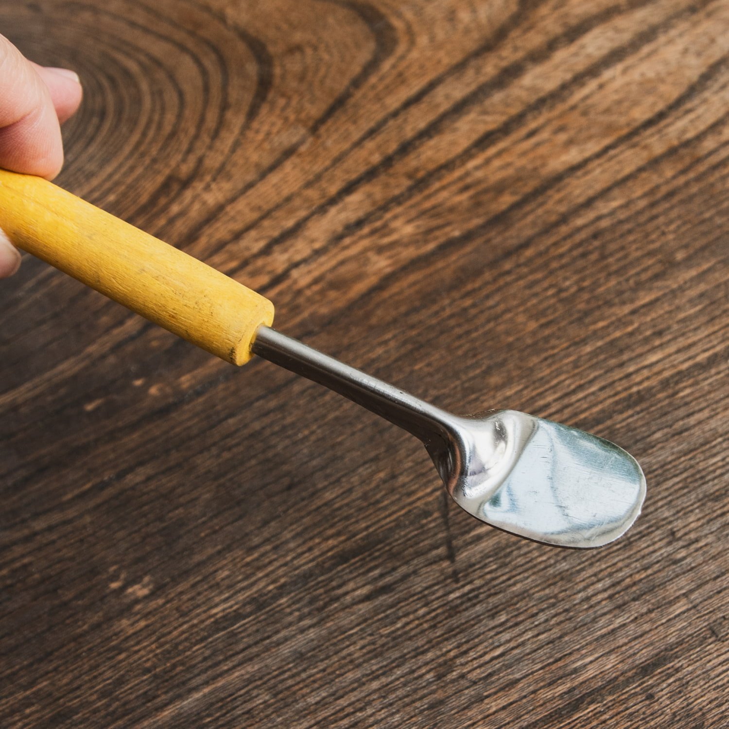 焼き型でアペムを焼いたあと、この小さなスパチュラを使って生地を返したり、型からすくい上げます。ヘラの部分はステンレス製で熱に強く、柄は木製で持ちやすい仕様。シンプルながら現地の屋台や家庭では欠かせない道具です。