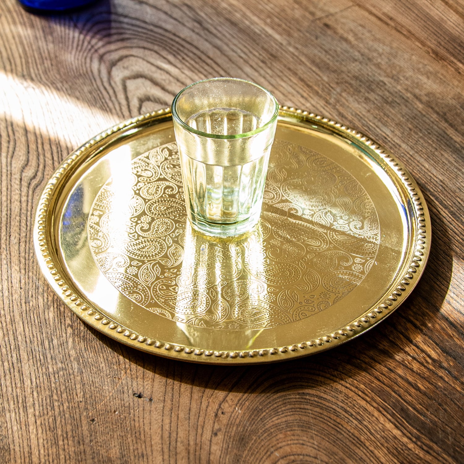 ペイズリー模様が美しい 金色のブラス製ラウンドトレイ 22.5cmの商品写真 2枚目 チャイカップを載せてみた使用例になります。