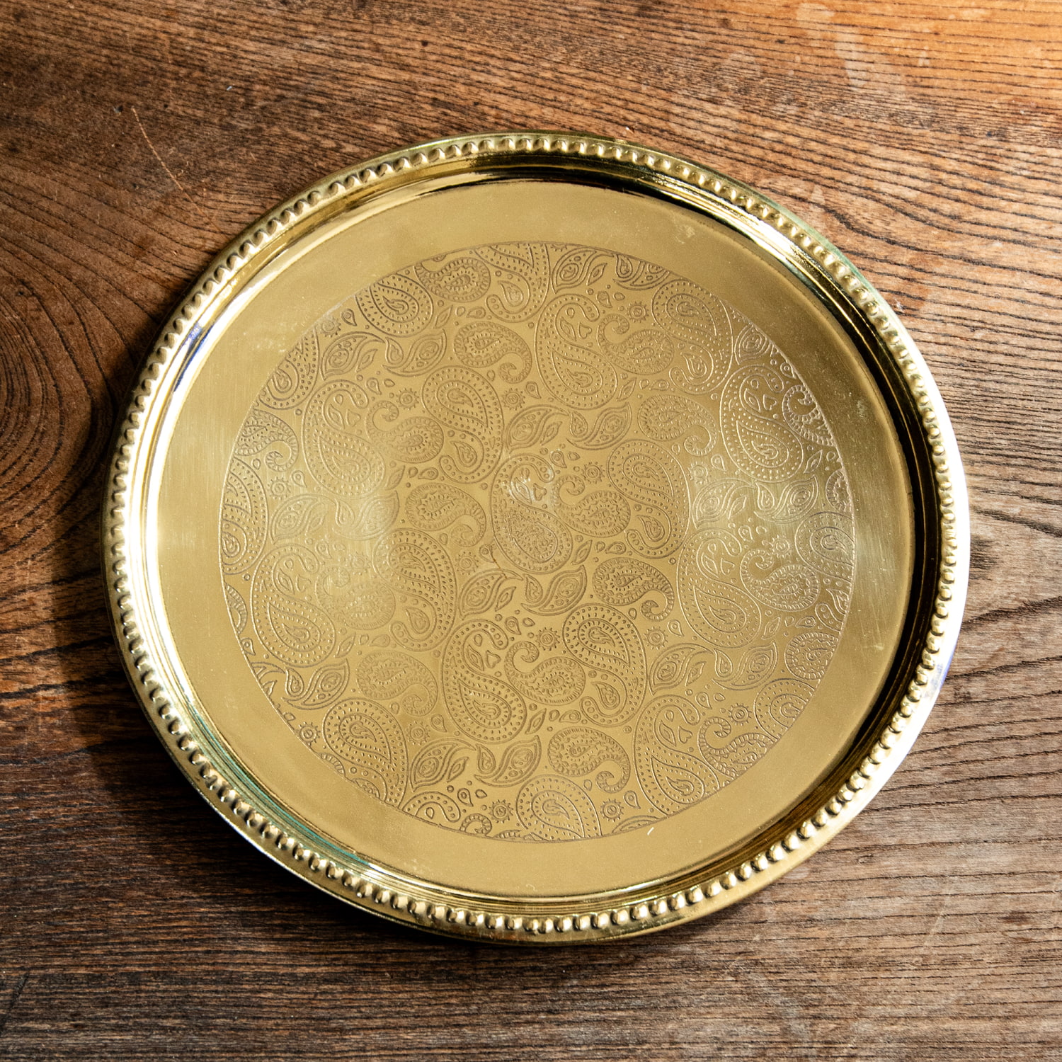 ペイズリー模様が美しい 金色のブラス製ラウンドトレイ 22.5cmの商品写真 3枚目 単体での様子です。