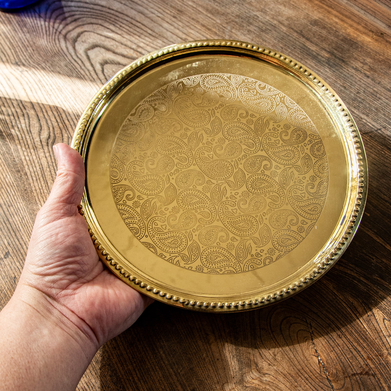 ペイズリー模様が美しい 金色のブラス製ラウンドトレイ 22.5cmの商品写真 6枚目 これくらいのサイズ感になります。