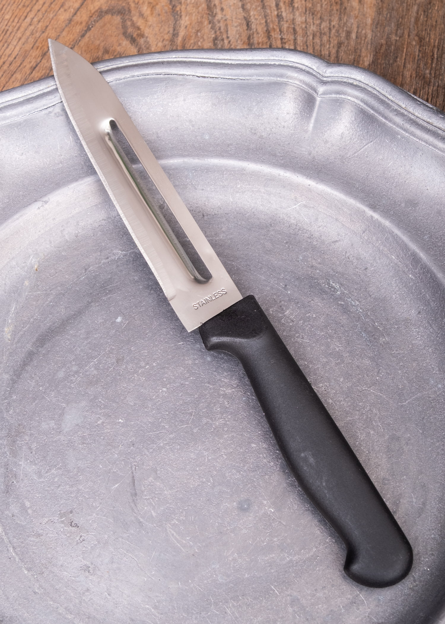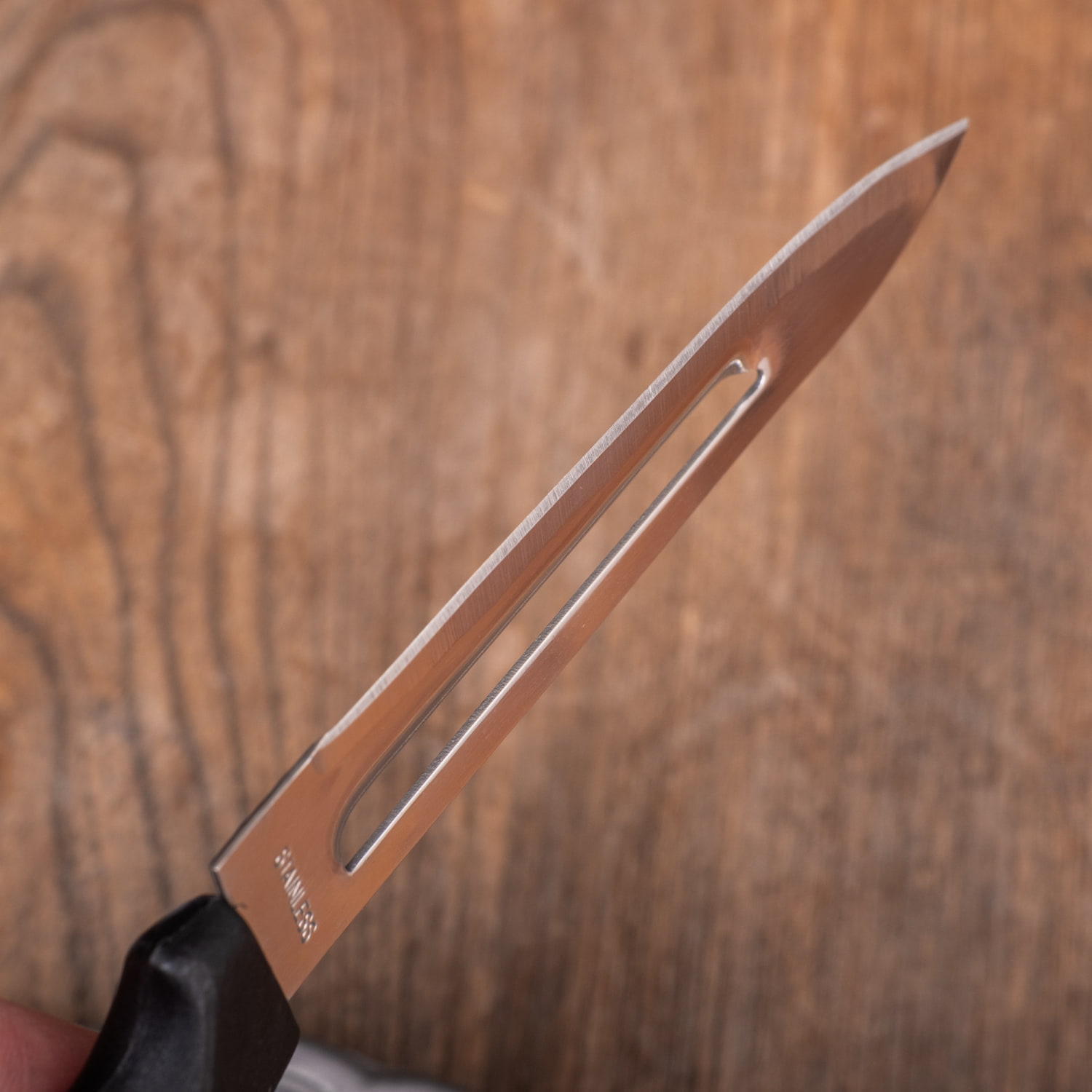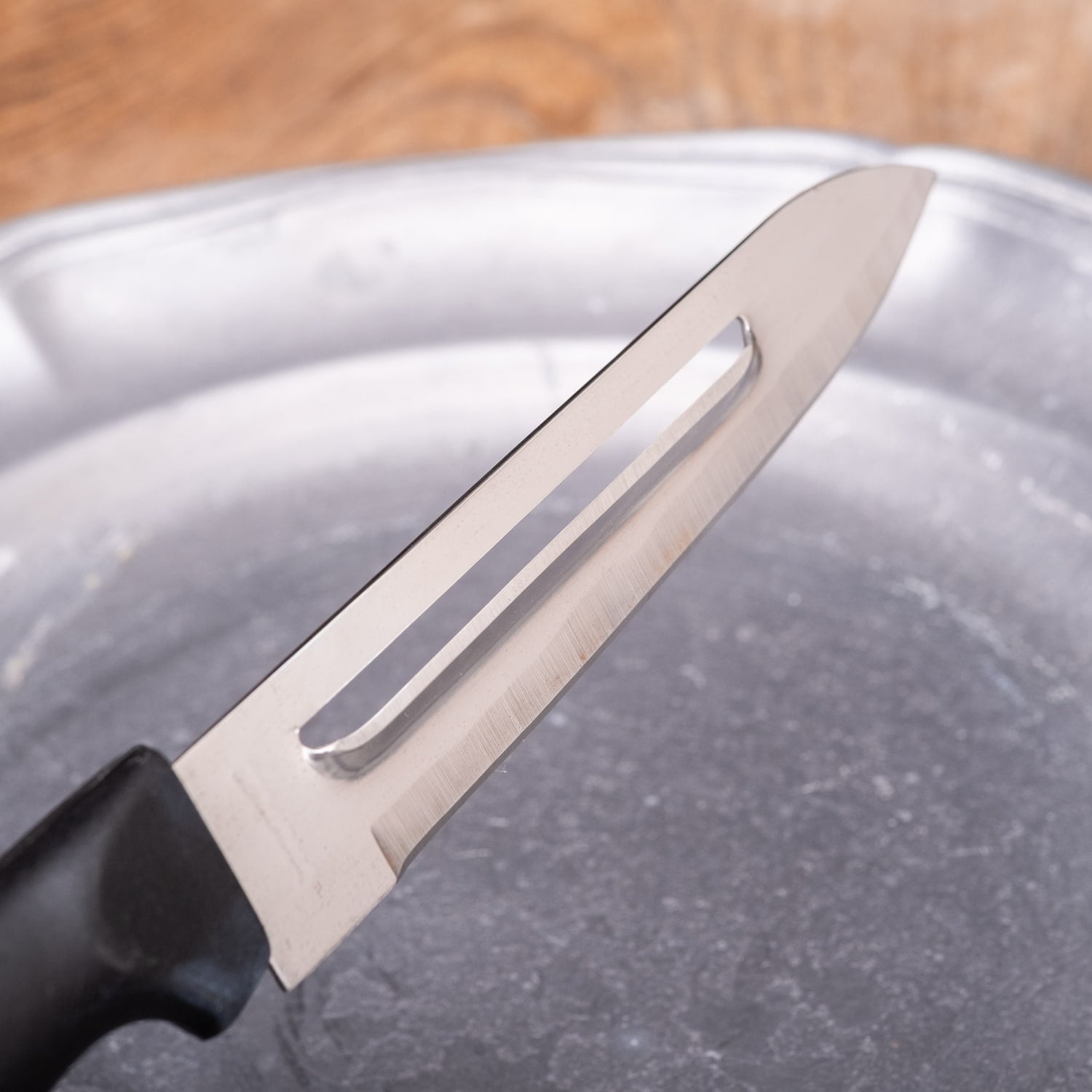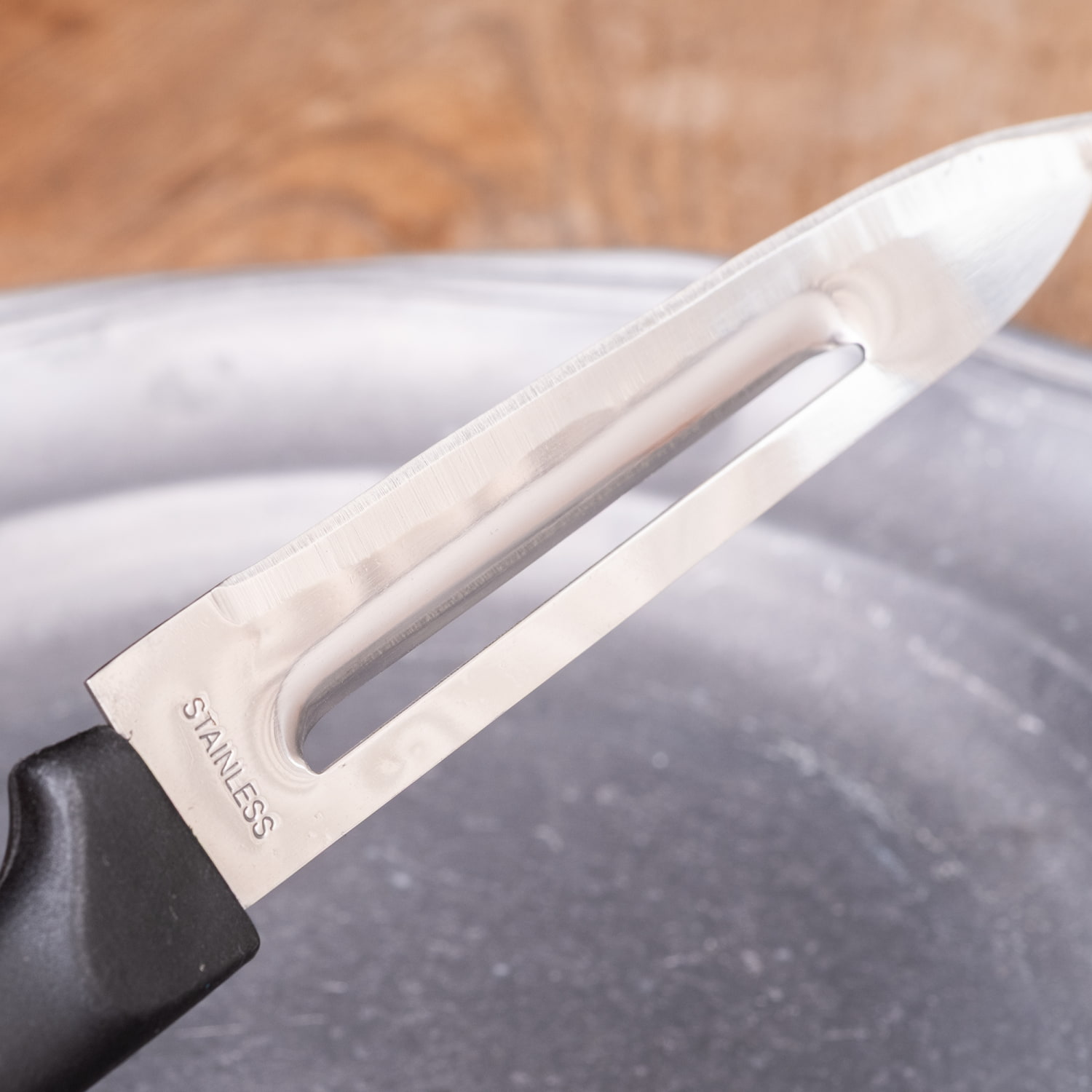 このナイフの特長は、刃の中央にある細長い穴の部分。ここがピーラーとして使えるため、にんじんやじゃがいも、大根などの皮むきにも便利です。ナイフとピーラーを持ち替えずに使えるので、下ごしらえもスムーズに進みます。■一本で2通りに使える実用性