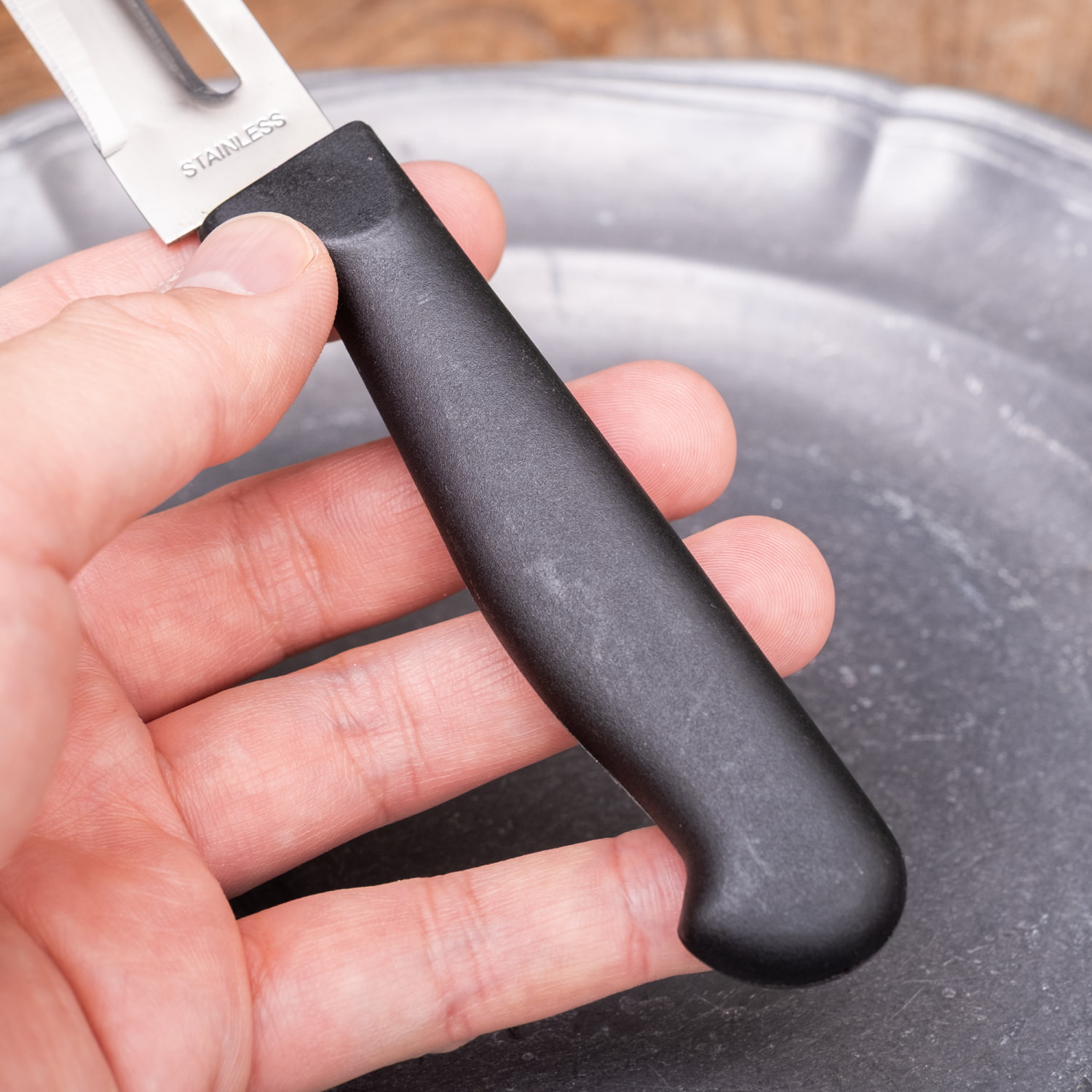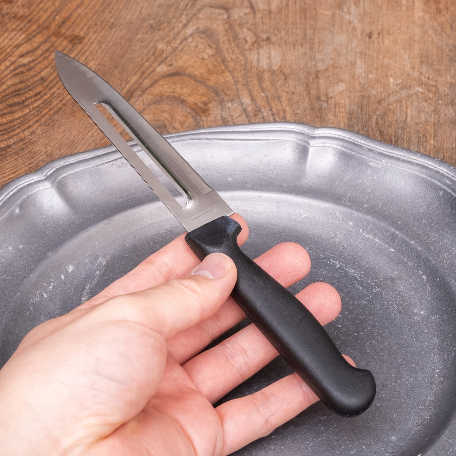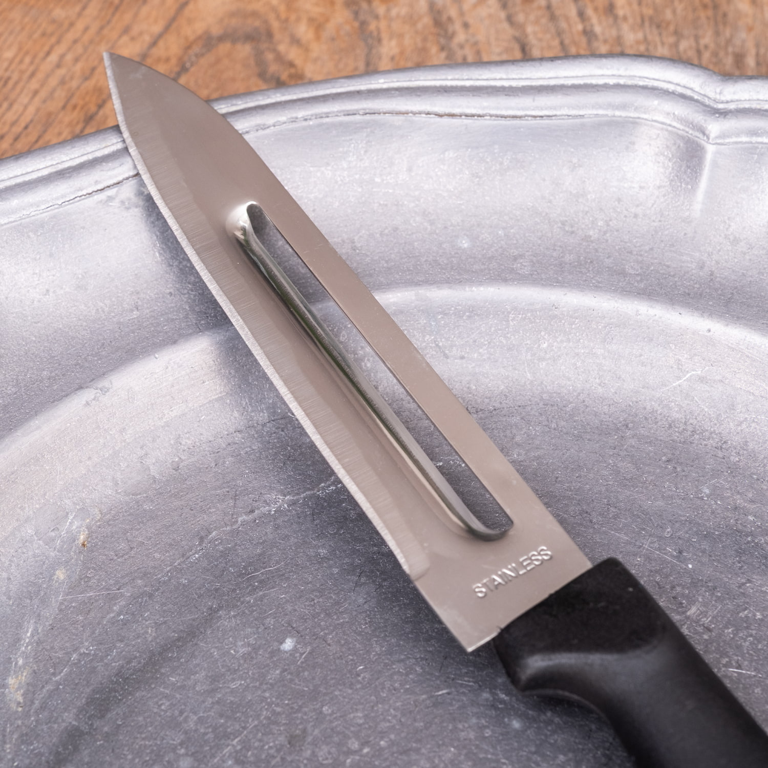 タイのキッチンからやってきた、ナイフとピーラーの機能をひとつにまとめたキッチンナイフです。シンプルな小型ナイフですが、中央の細長い穴の部分がピーラーになっており、これ一本で「切る」と「むく」の両方に使えます。無駄のないつくりと、気軽に使える実用性が魅力です。■果物や野菜のカットに使いやすいサイズ感
