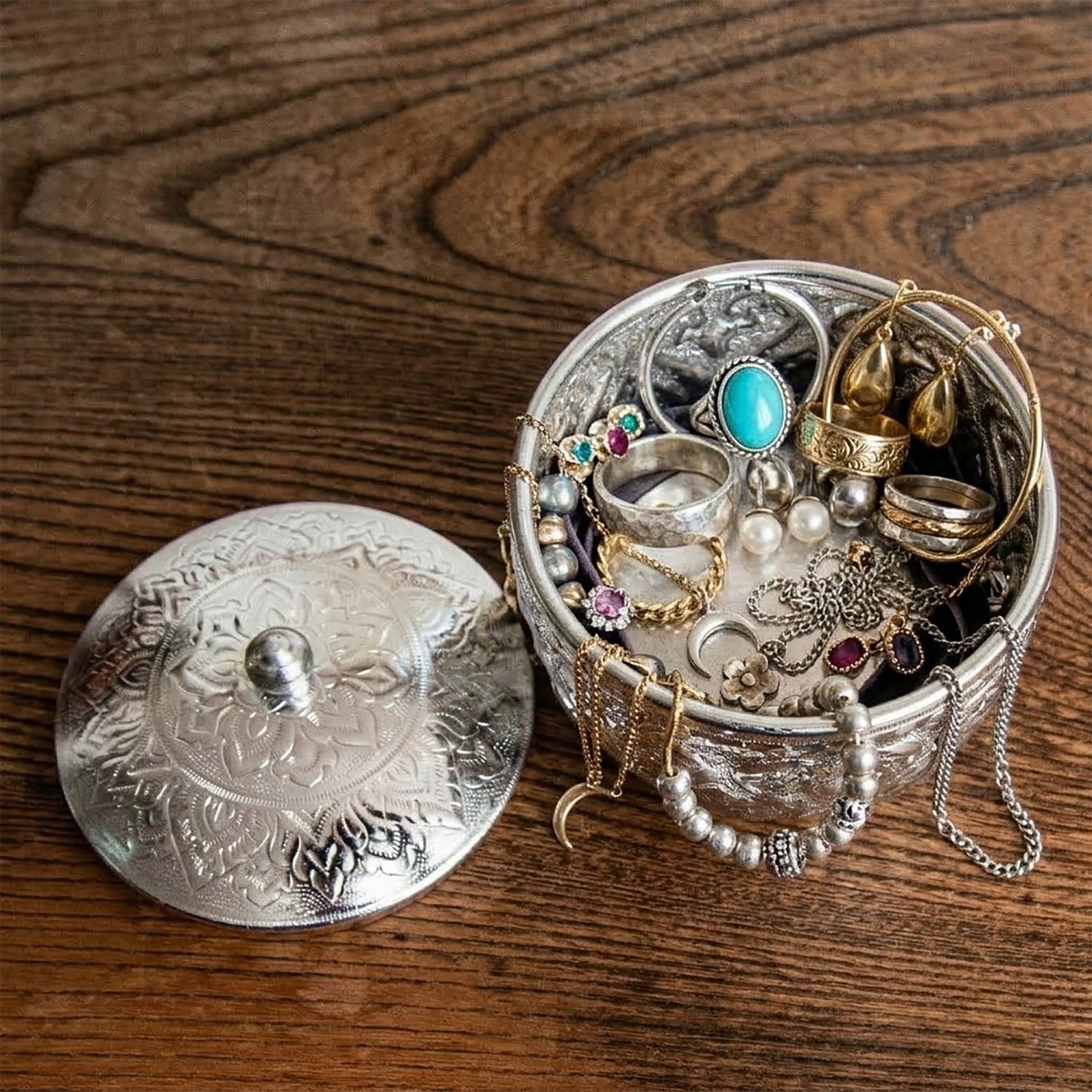 錆びにくく、割れる心配もないため、洗面周りなどの水場でも安心してお使いいただけます。指輪や腕時計などのアクセサリートレイとして使えば、アルミの柔らかなシルバーカラーが中身を引き立ててくれます。クリップや印鑑など散らかりがちなデスク小物の定位置にしたり、蓋を開けてポプリやサシェを忍ばせて香りを楽しむインテリアにするのもおすすめです。