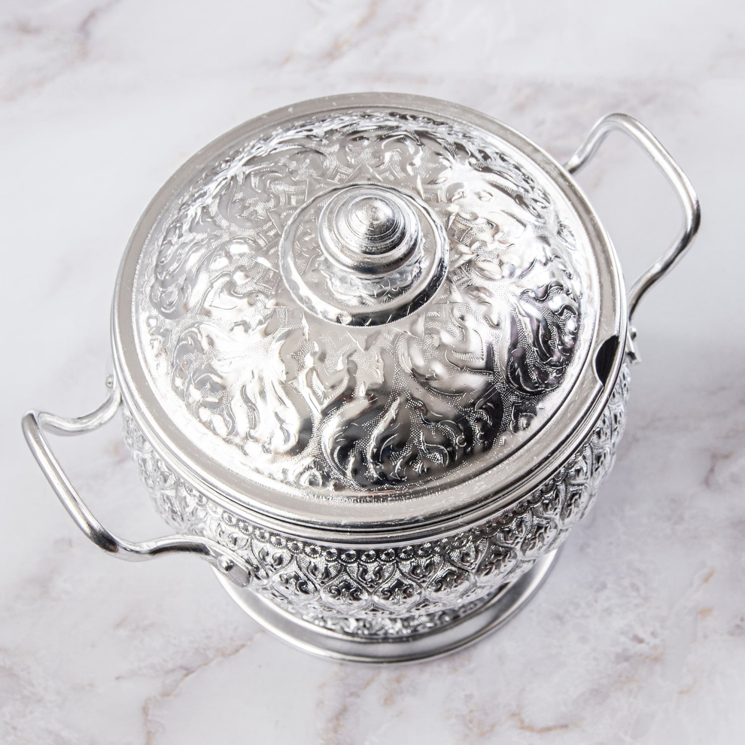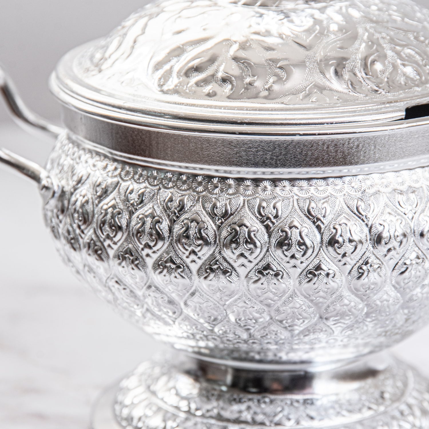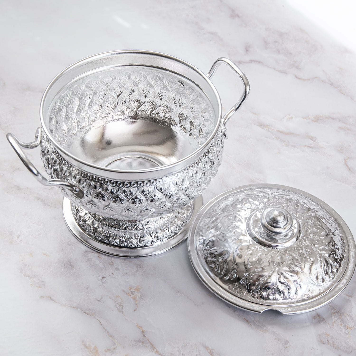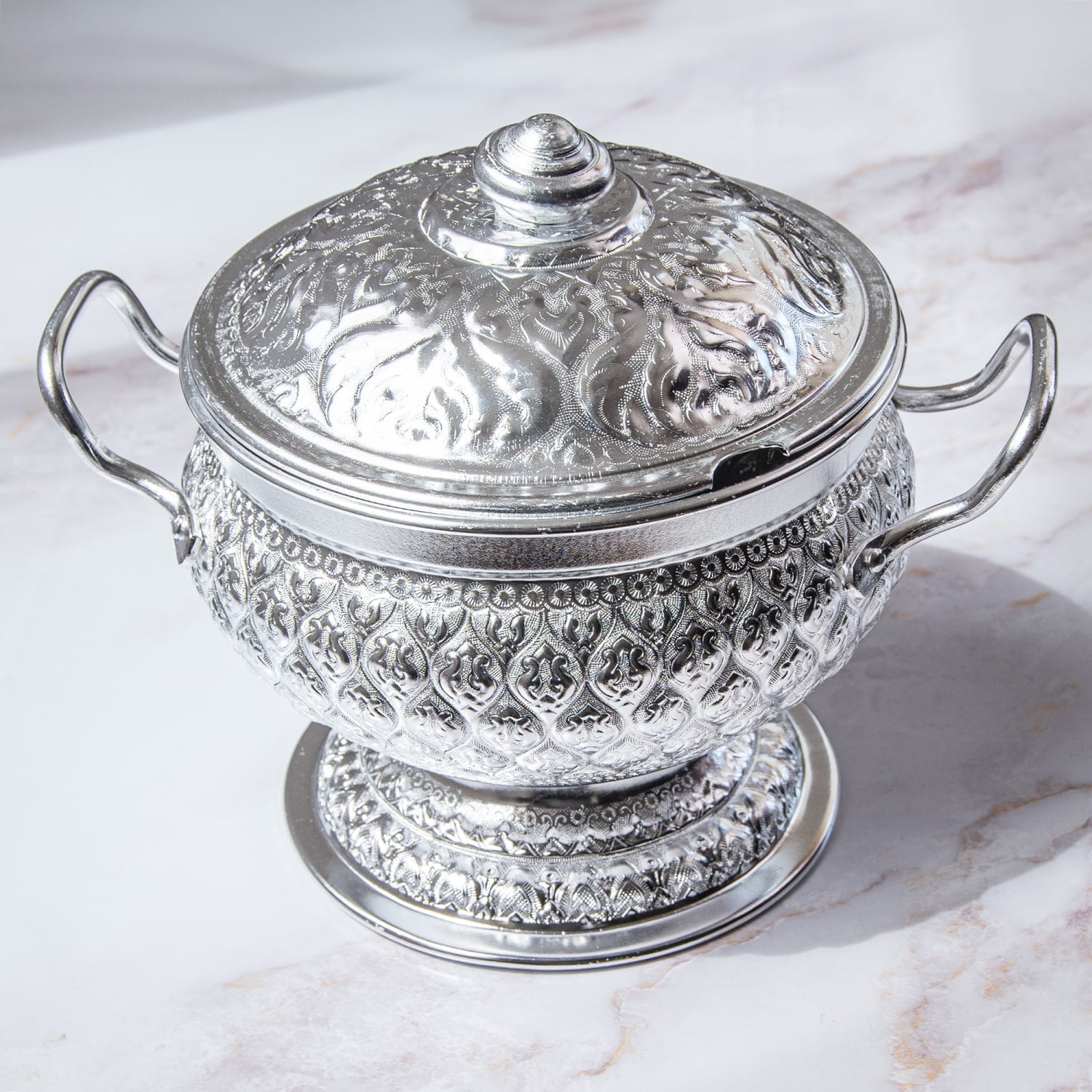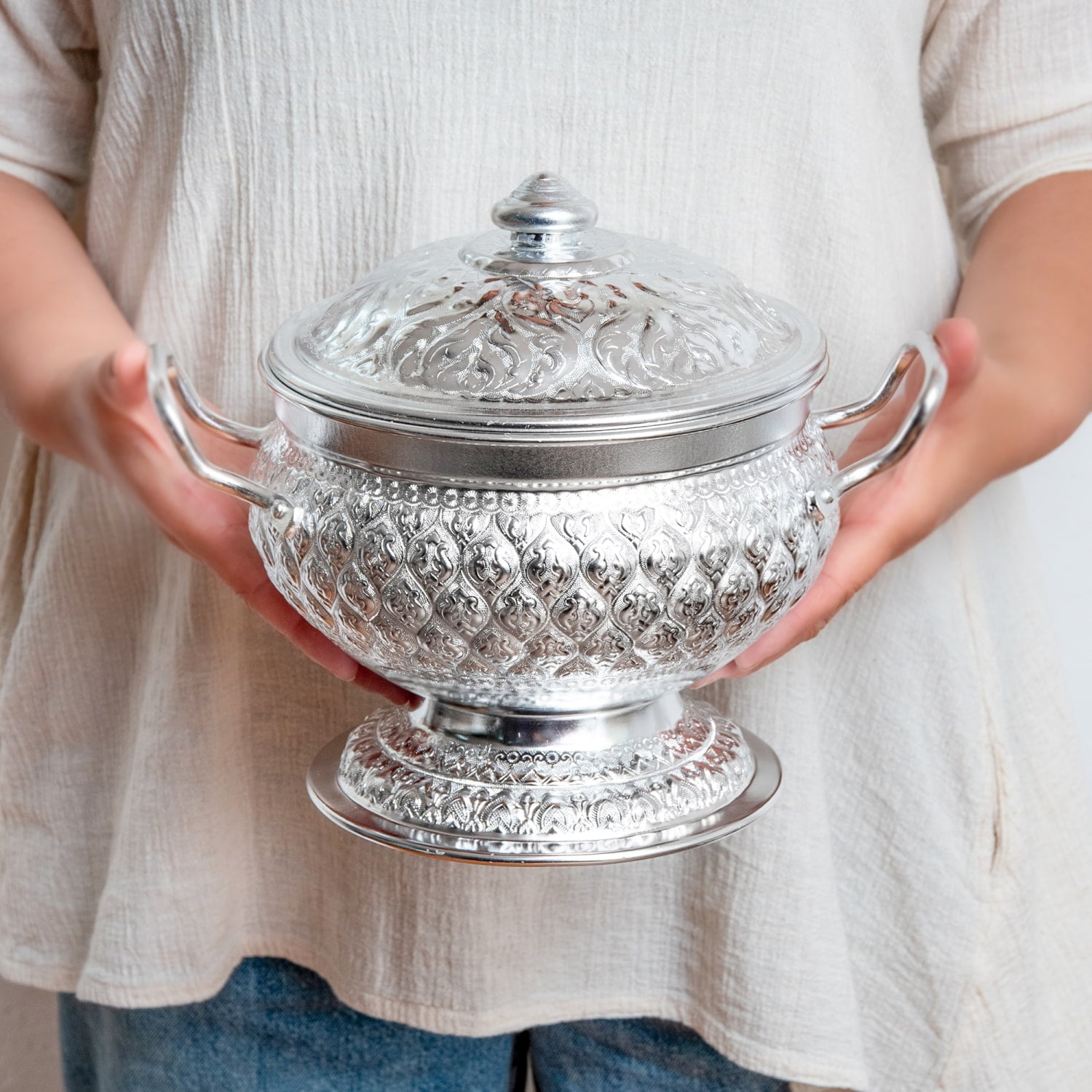 タイの寺院装飾や伝統工芸を思わせる、細やかなエンボス模様が美しいアルミ製ボウル。光を受けるたびに模様の陰影が浮かび上がり、食卓にぐっと華やかな雰囲気を添えてくれます。蓋付き・脚付きのデザインで、普段のご飯やスープも少し特別な一品に見せてくれます。■ライスにもスープにも使える万能食器