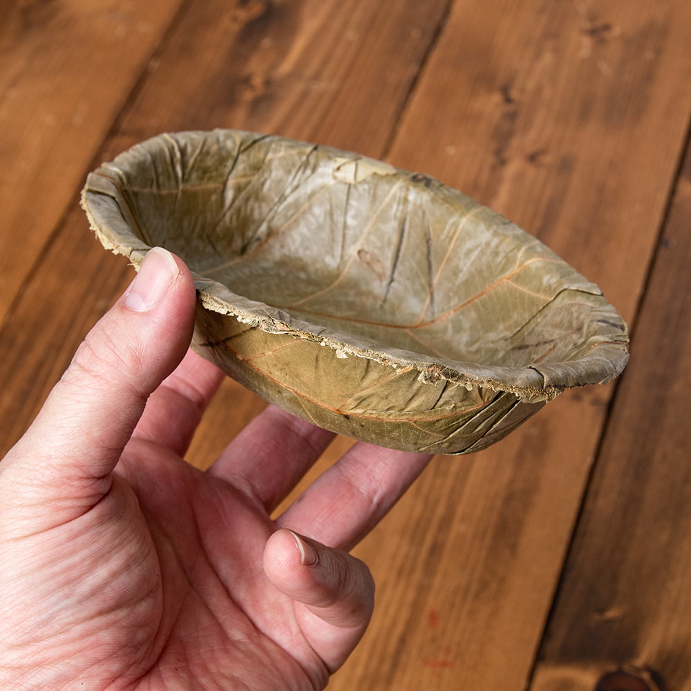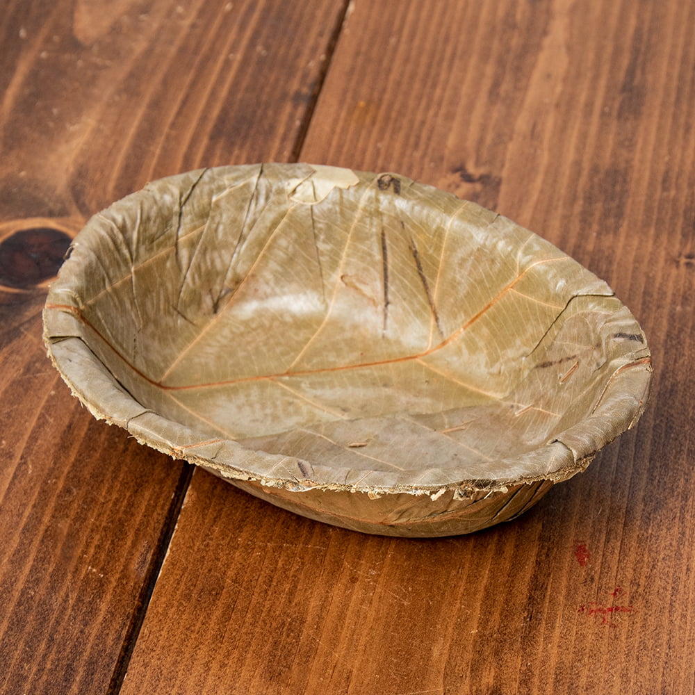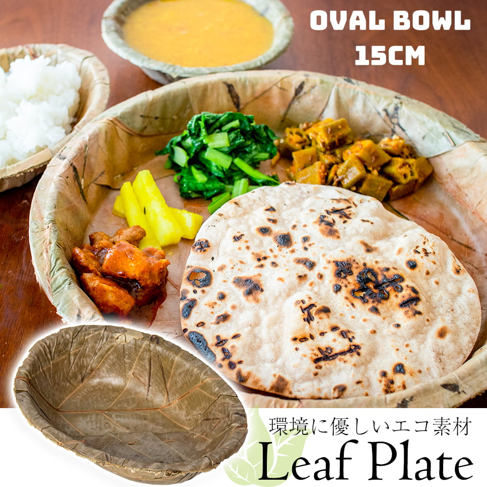 ライスやチキンカレーなどを盛り付けるのにちょうど良さそうな、小ぶりのオーバルボウルです。■木の葉で作られたエコなお皿