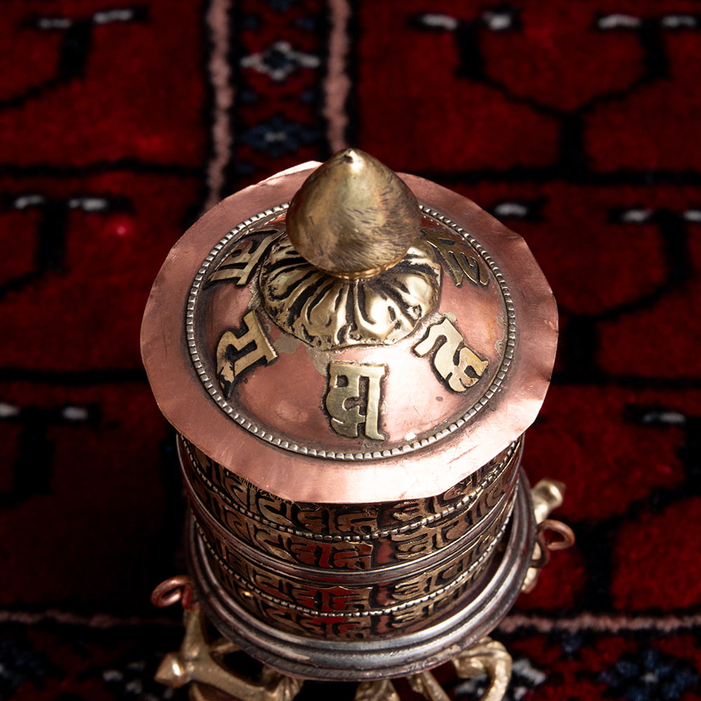 こちらは、卓上タイプ。マニ車の側面のマントラも美しく、インテリアとしてもお使いいただけます。マニの脚はドルジェ(ヴァジュラ・金剛杵)となっており、数あるマニ車を取り揃えた当店の中でも、珍しいデザインとなっております。
