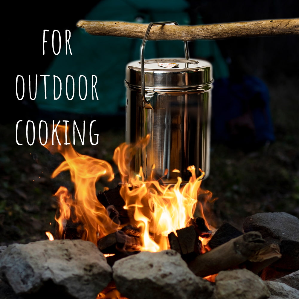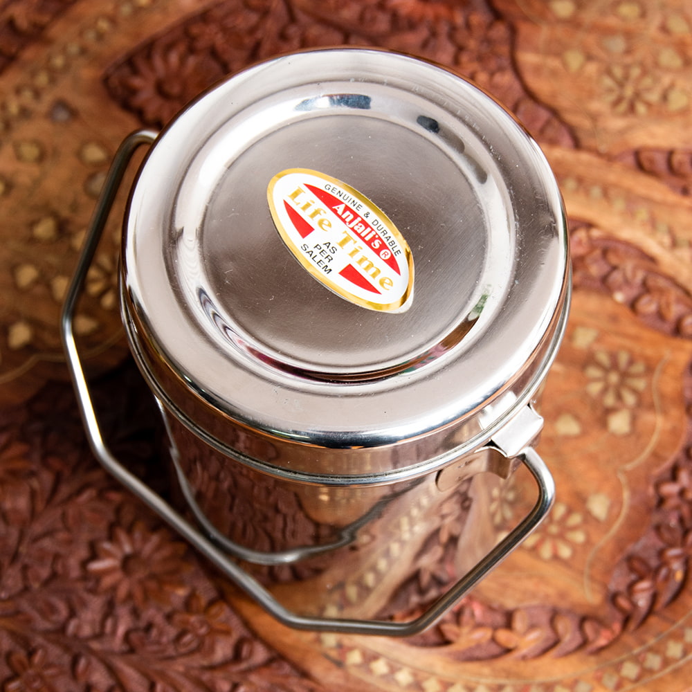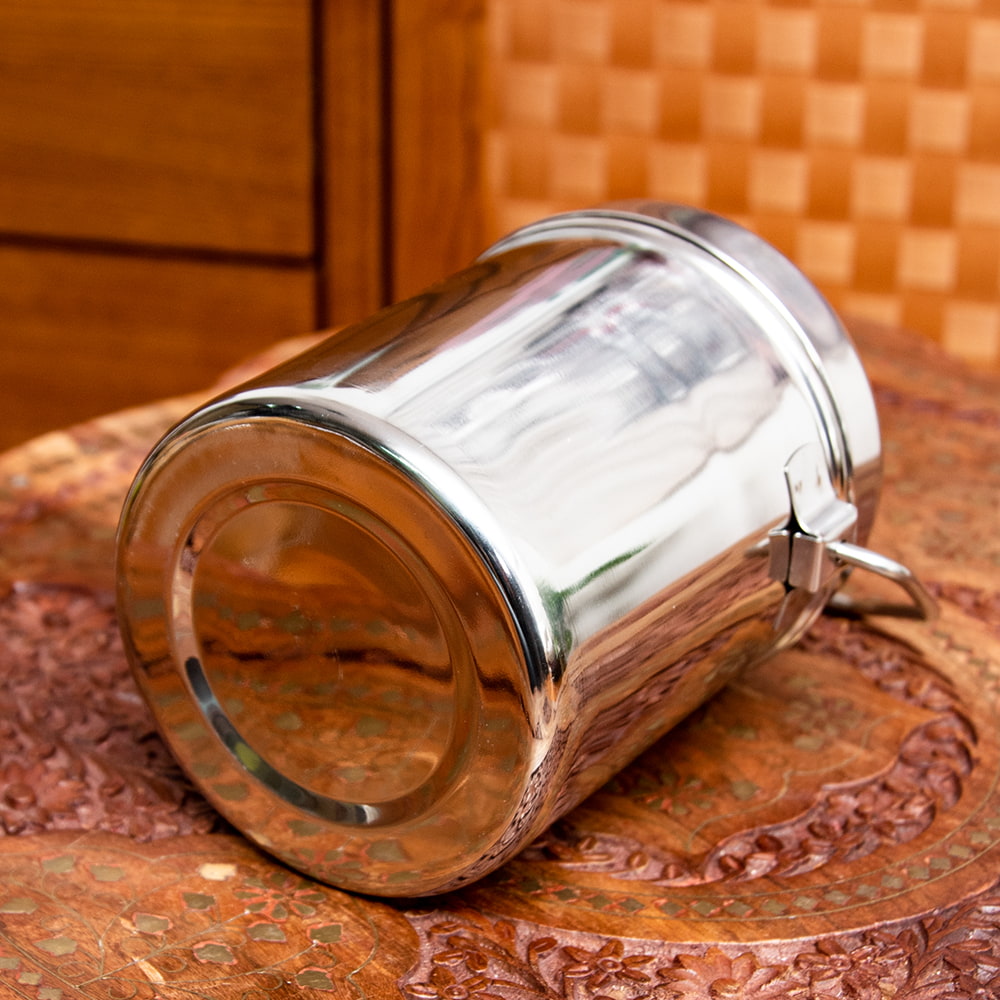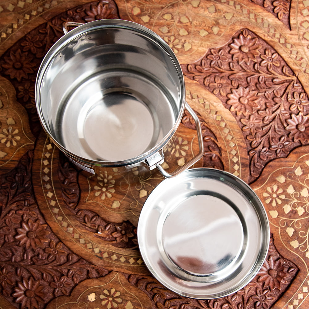 インド現地では「ミルクポット」という名前で使われているのですが、ステンレスに程よい厚みがありキャンプなどにもオススメです。シンプルかつ見た目も良い上、汎用性が高いので、様々な料理を作ることができます。さらにループハンドルがあるので、トライポッドで簡単に吊るせます。 サイズ感も、詰めたお弁当を出先で温めたり、スープを作ったりするのにちょうど良い大きさです。もちろんキャンプ以外でも、日常でご飯の運搬やフードストッカーなどの用途にもご使用いただけます。