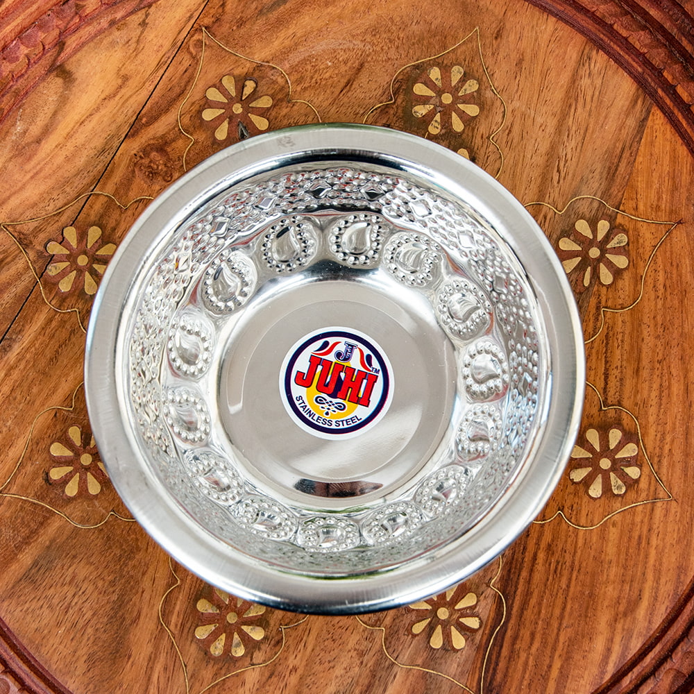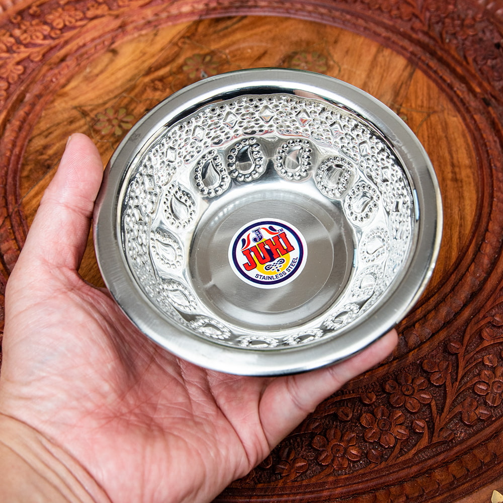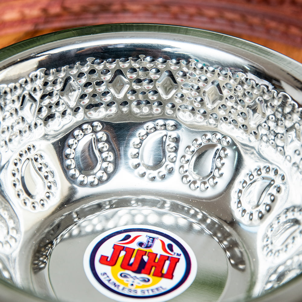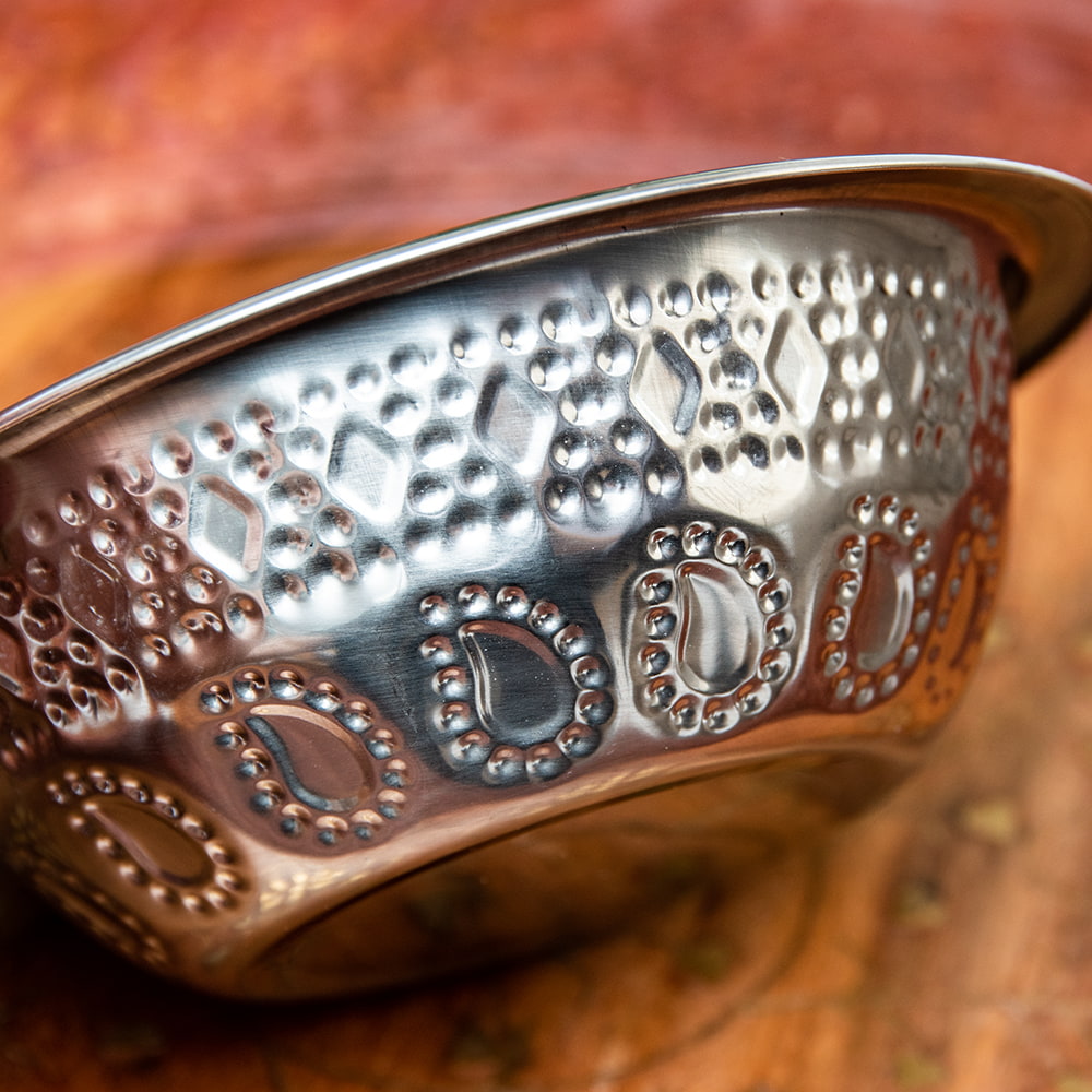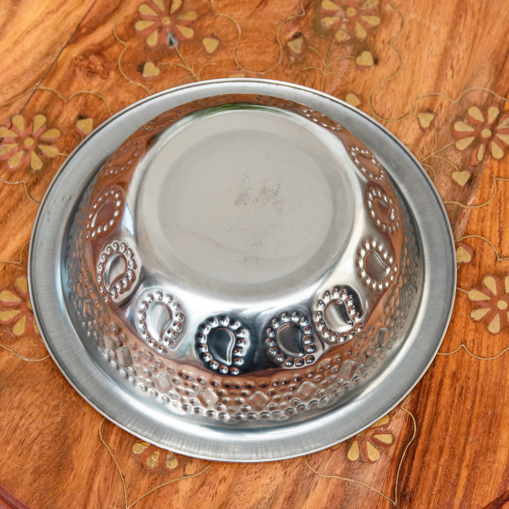 インドならではの美しいペイズリー模様の装飾がデコボコのエンボスになって入っている美しいアルミのお皿。シンプルながらもインドを感じることができます!アルミ独特の光沢感が美しく、手で触れるとエンボスの凹凸を感じることができて、その凹凸には滑り止めの効果もあります。