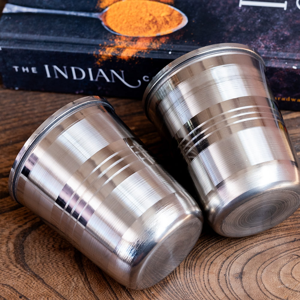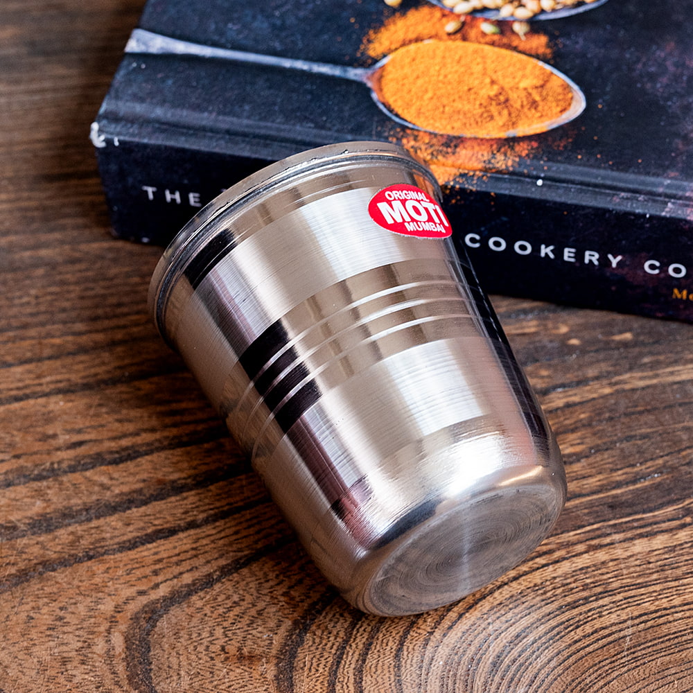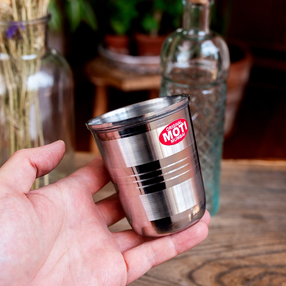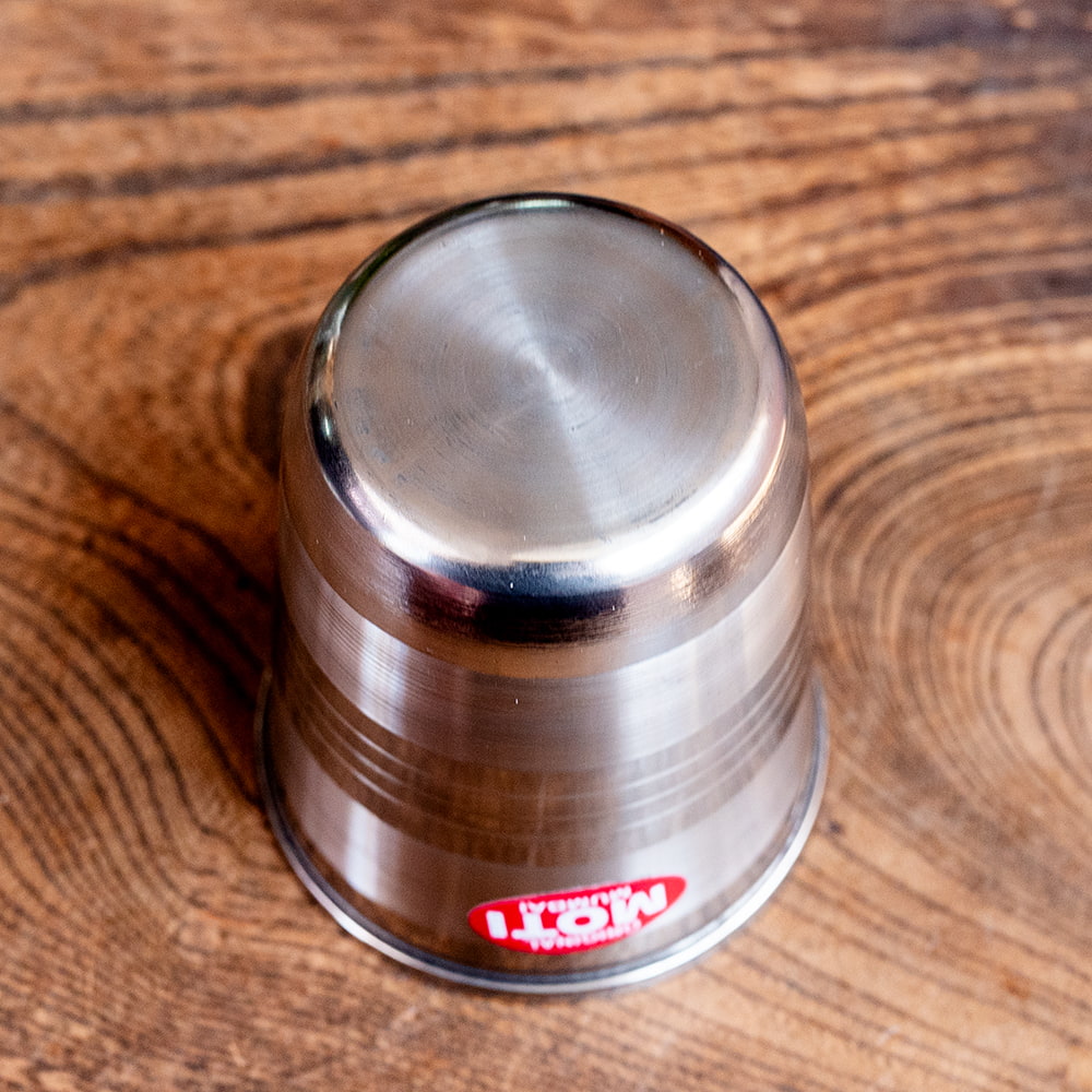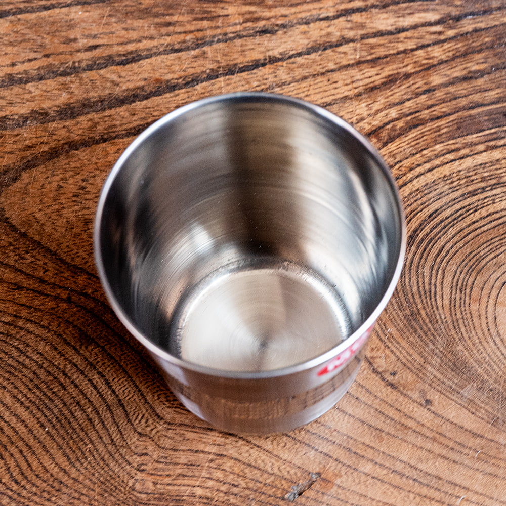 ステンレスで出来たコーヒー・チャイカップです。小ぶりなコップですが、インドで使われているチャイカップとしては大き目の部類に当たります。シンプルな一品ですが、これでミルクティーを飲めば、すっかりチャイ気分。長く使っていただける一品です。