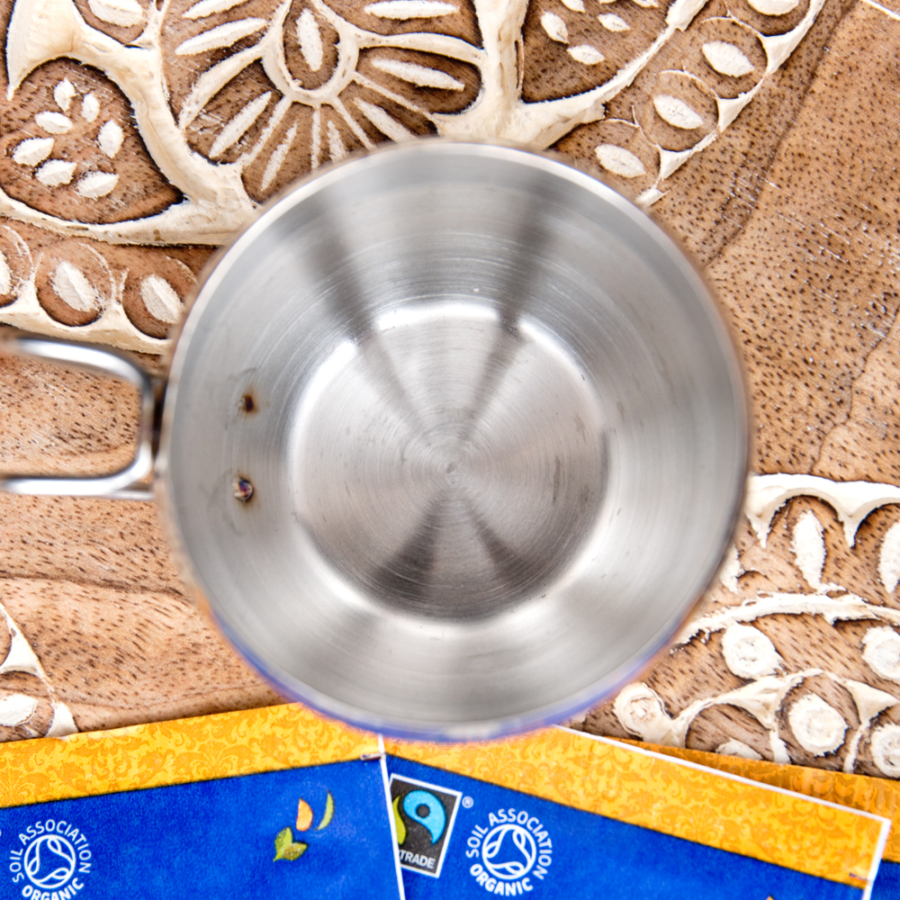 インドの雰囲気が素敵な、チャイやコーヒーを楽しむのに最適なマグカップです。シンプルな一品ですが、これでミルクティーなどを飲めば、すっかりチャイ気分。長く使っていただける一品です。金属製なので飲み物がよく冷え(温まり)、美味しく飲み物を味わうことができます。