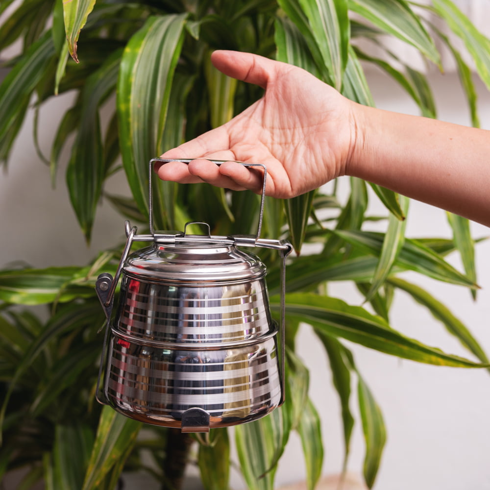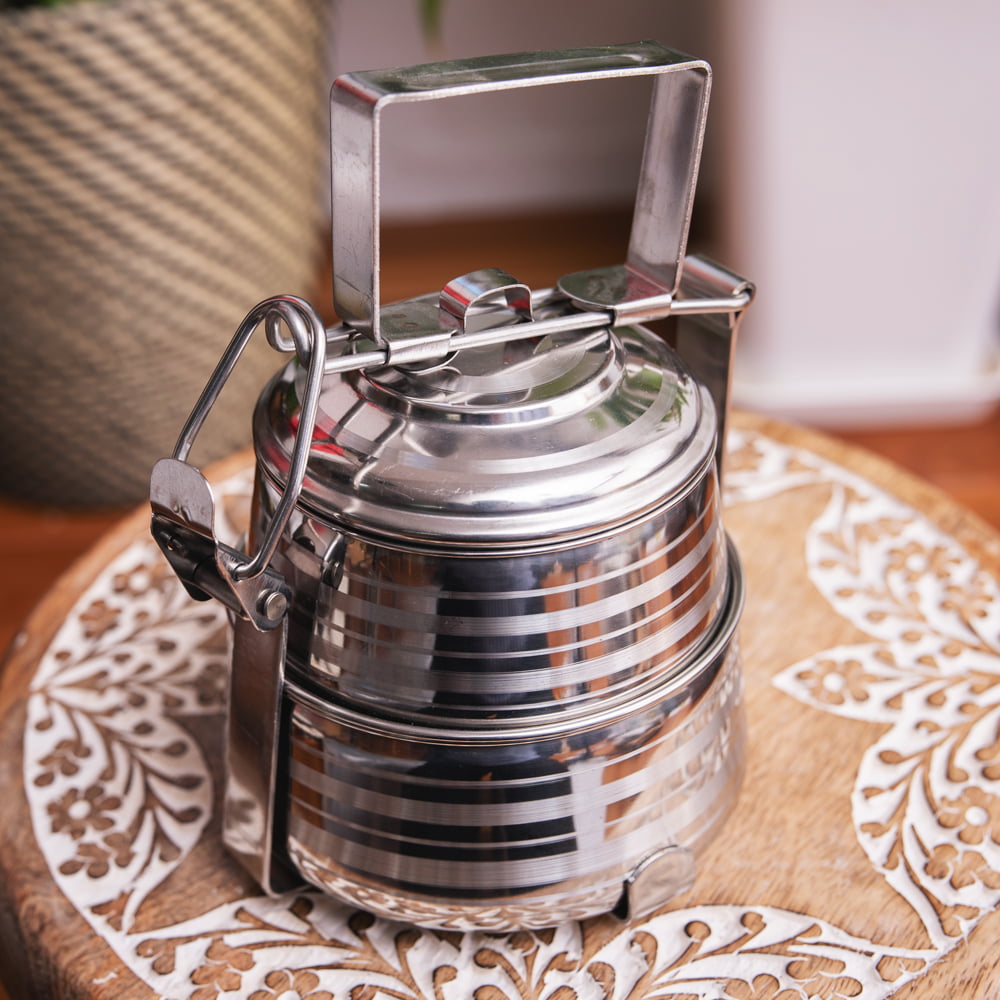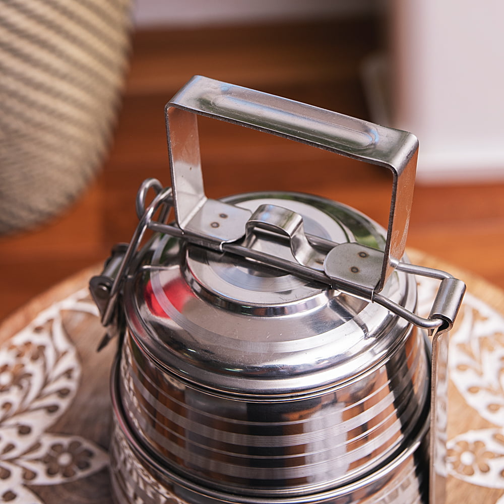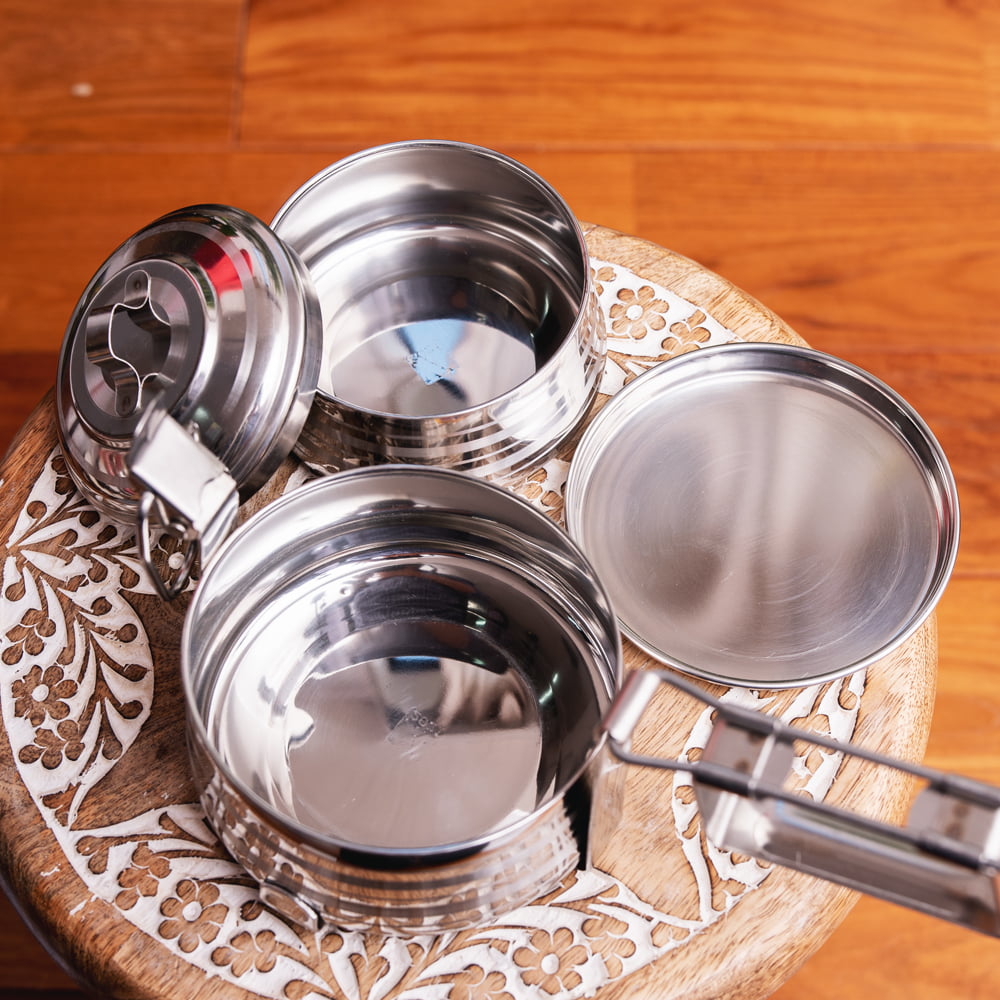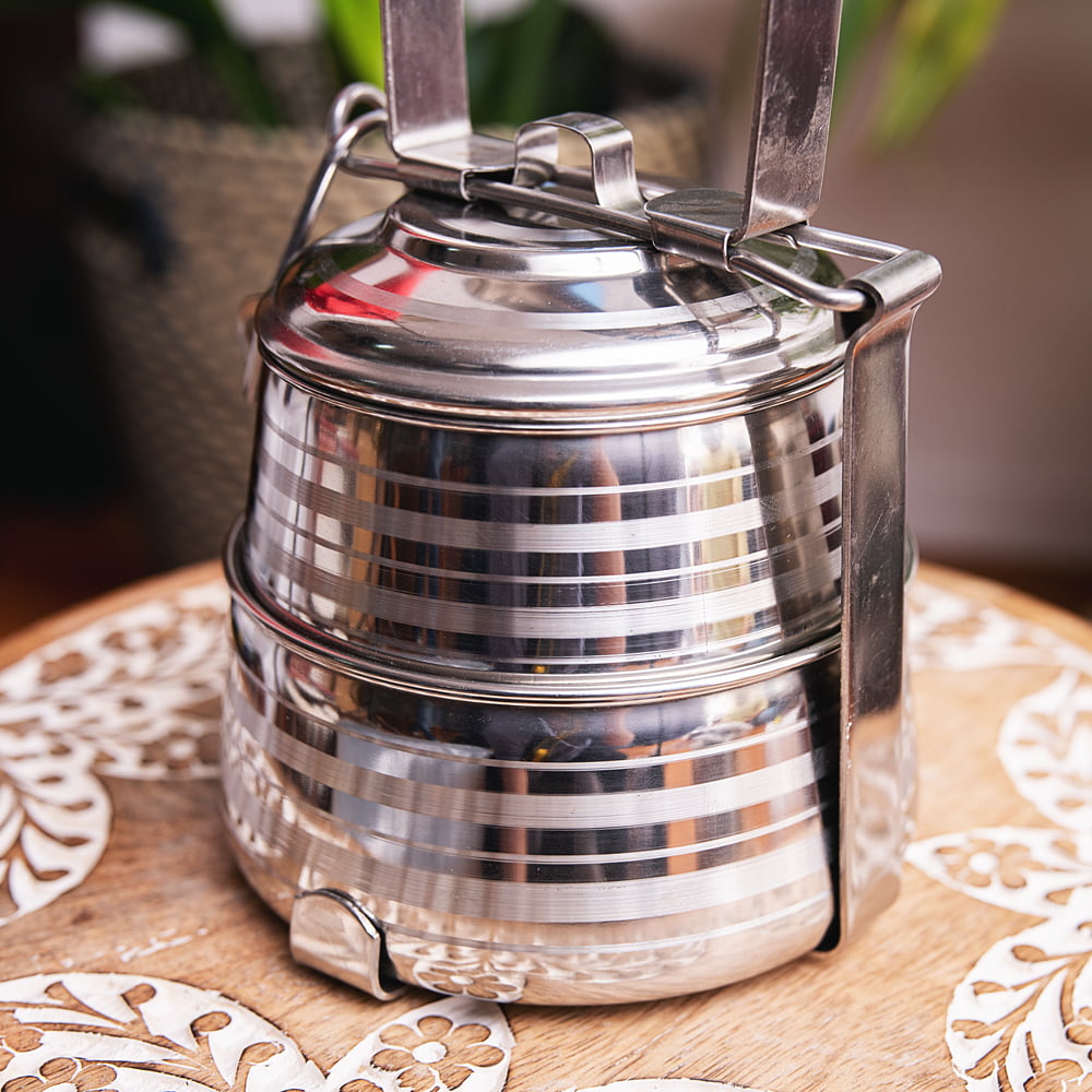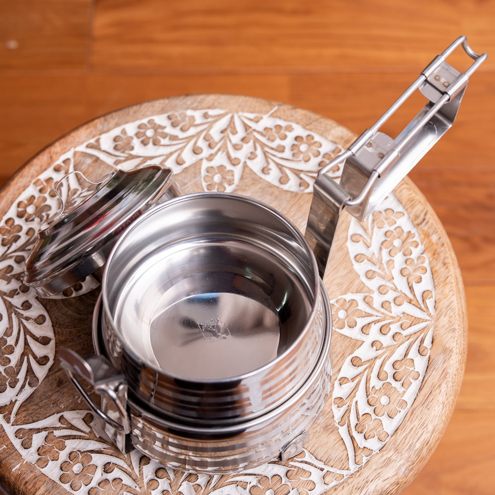 「カレーなどを入れても漏れない」といわれるインドの不思議な弁当箱。下段にご飯、上に汁気のあるカレーなどを入れて使用します。 ちなみに、汁物が漏れづらいのは一番上の段のみで、中・下段は漏れやすいので、汁物は必ず上段に入れてご使用ください。ティラキタの実験では、水を入れてさかさまにすると最初は少し雫が垂れますが、その後まったく漏れなくなりました。水蒸気がシールの代わりになるのだと思います。ただ、日本の製品のようにパッキンが入って気密性になっている訳ではありませんので、逆さまにして振ったりはしない方がいいかと思います。