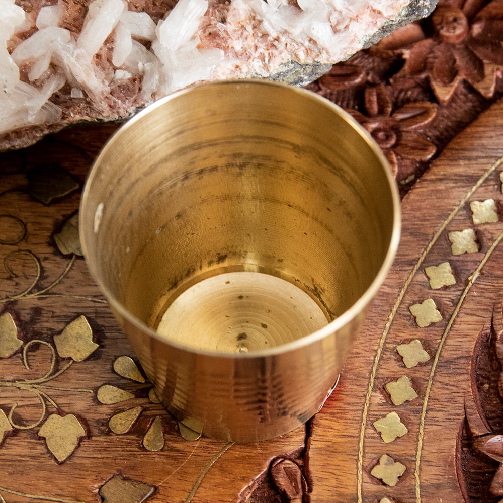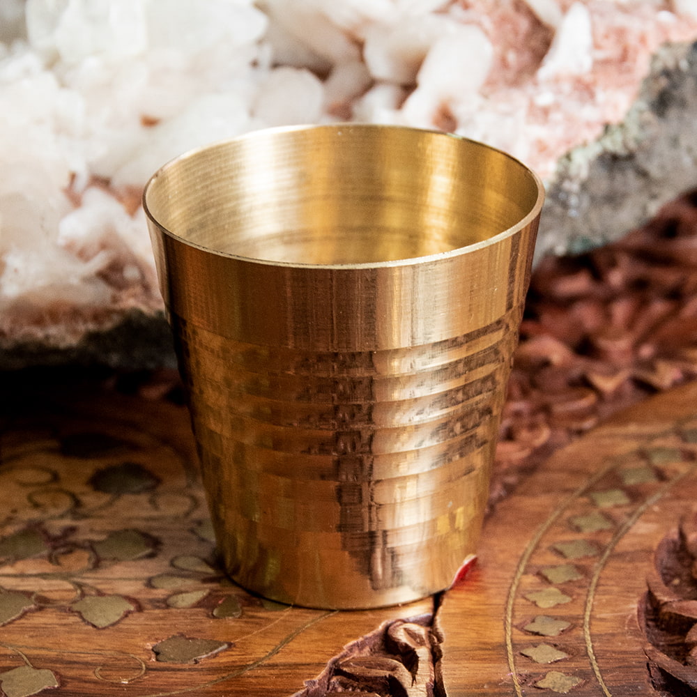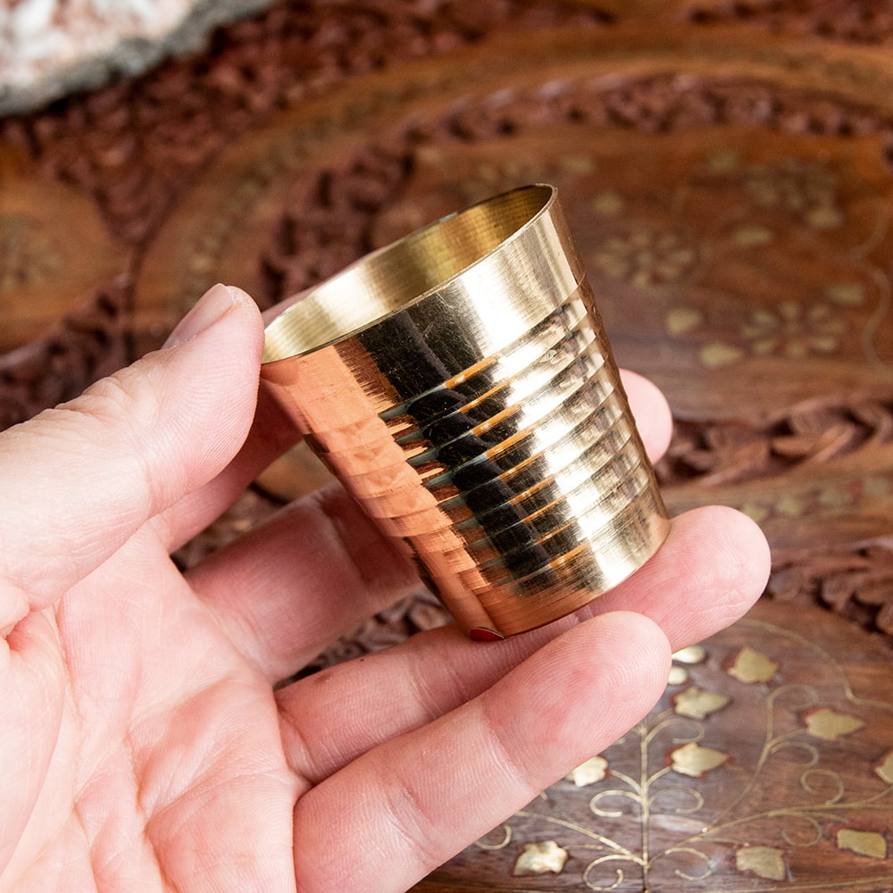 インド現地では礼拝を行う時にガンジス河の水を入れたり、神様への捧げ物の容器として主に使用されるブラスのカップです。古来よりインドではブラスは高級な金属とされ、仏像を作るのに使われたり、宗教用品にはほぼ必ず銅か、ブラスが使われてきました。手のひらに収まる小ぶりな、かわいらしいサイズ感のブラスカップ。模様として入っている横ラインは持つときの滑り止めにもなり、見た目の美しさと実用性を兼ねています。