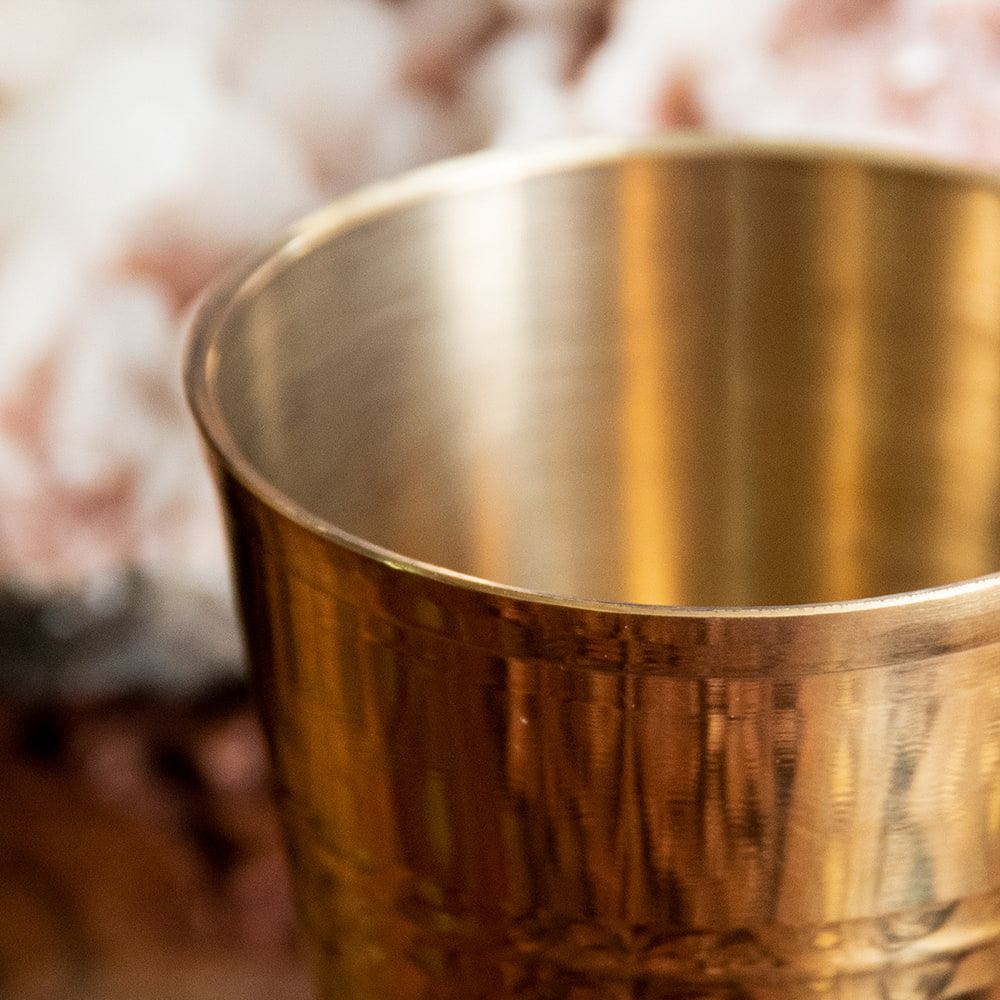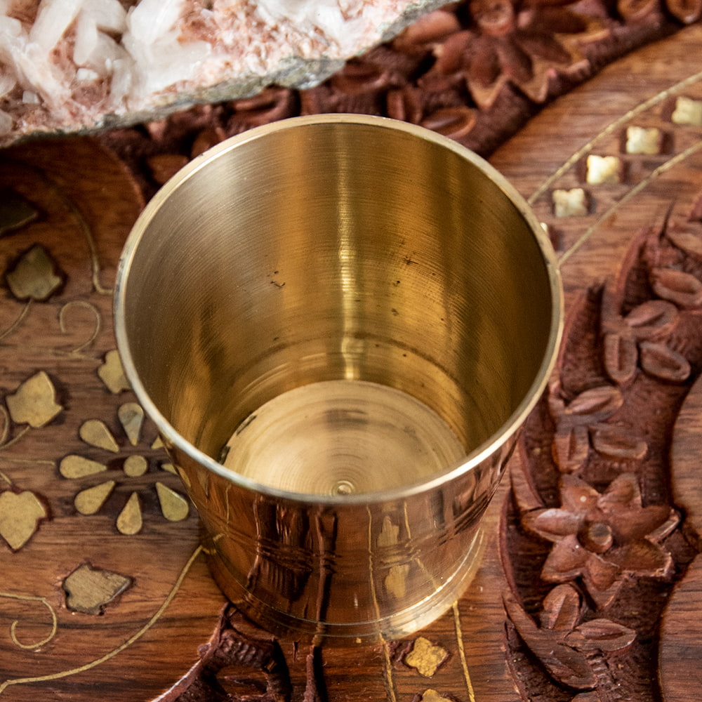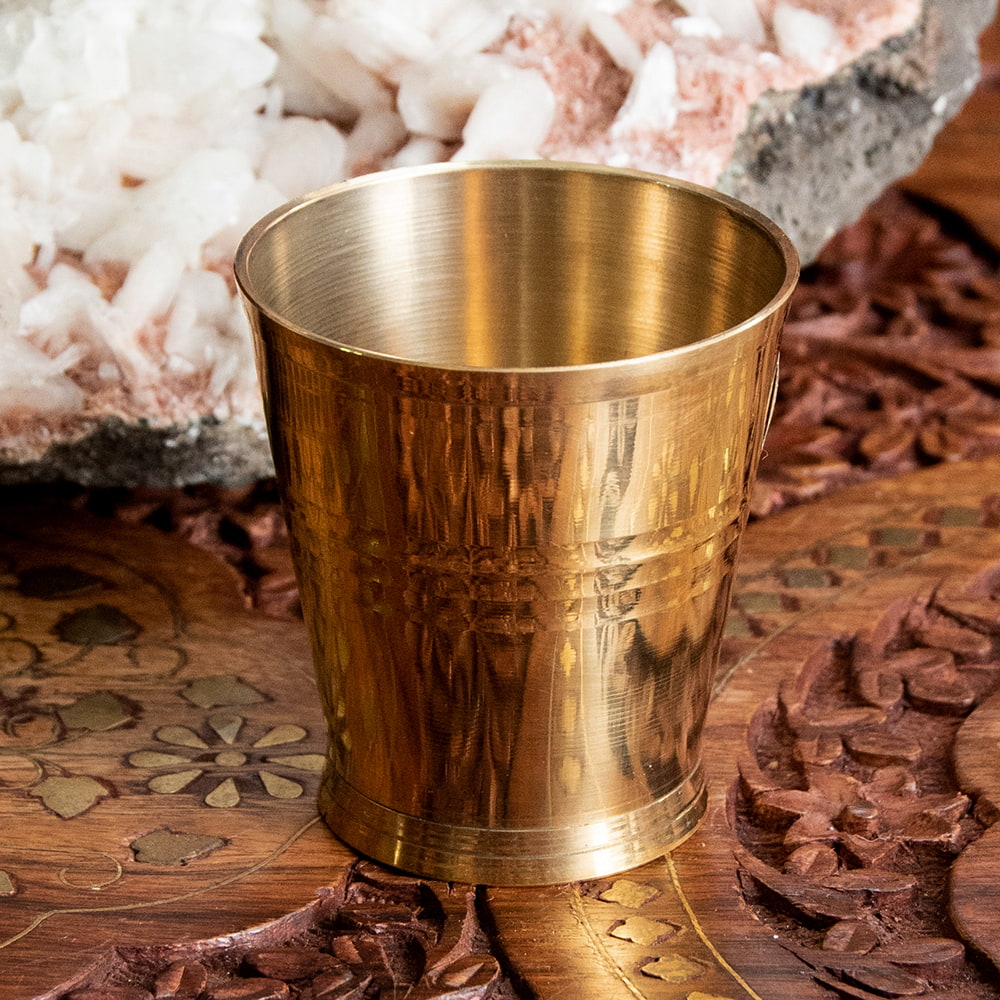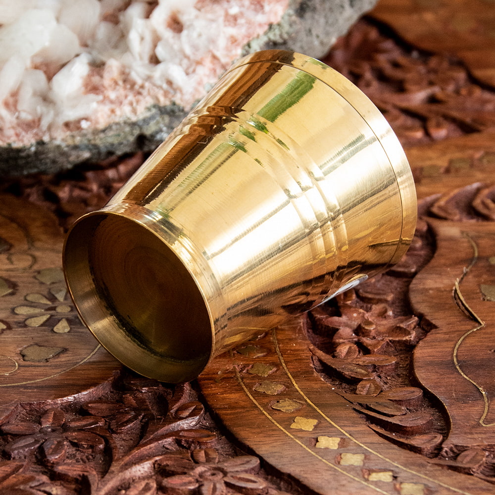 インド現地では礼拝を行う時にガンジス河の水を入れたり、神様への捧げ物の容器として主に使用されるブラスのカップです。古来よりインドではブラスは高級な金属とされ、仏像を作るのに使われたり、宗教用品にはほぼ必ず銅か、ブラスが使われてきました。手のひらに収まる小ぶりな、かわいらしいサイズ感のブラスカップ。模様として入っている横ラインは持つときの滑り止めにもなり、見た目の美しさと実用性を兼ねています。