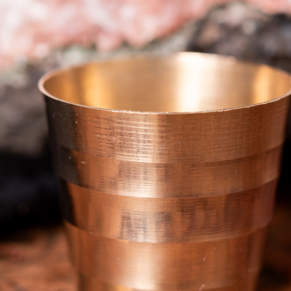 インド現地では礼拝を行う時にガンジス河の水を入れたり、神様への捧げ物の容器として主に使用されるブラスのカップです。古来よりインドではブラスは高級な金属とされ、仏像を作るのに使われたり、宗教用品にはほぼ必ず銅か、ブラスが使われてきました。手のひらに収まる小ぶりな、かわいらしいサイズ感のブラスカップ。模様として入っている横ラインは持つときの滑り止めにもなり、見た目の美しさと実用性を兼ねています。
