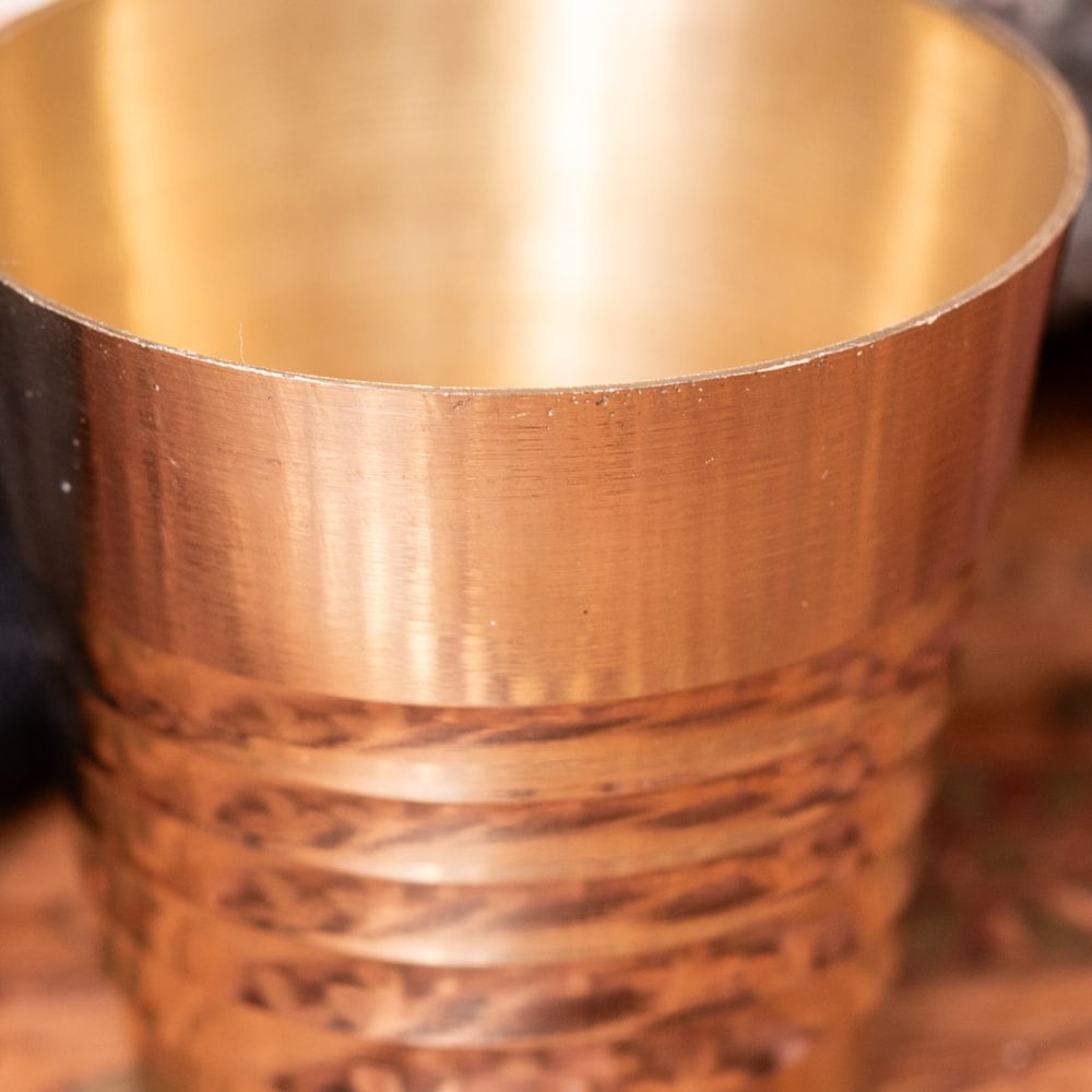 インド現地では礼拝を行う時にガンジス河の水を入れたり、神様への捧げ物の容器として主に使用されるブラスのカップです。古来よりインドではブラスは高級な金属とされ、仏像を作るのに使われたり、宗教用品にはほぼ必ず銅か、ブラスが使われてきました。手のひらに収まる小ぶりな、かわいらしいサイズ感のブラスカップ。模様として入っている横ラインは持つときの滑り止めにもなり、見た目の美しさと実用性を兼ねています。