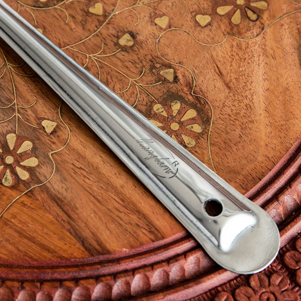 インドから届いた大スプーンです。日本ではこんな大きなサイズのスプーン、なかなかみかけませんね。穴あきですので汁物には向きませんが、サブジやバスマティライス、ビリヤニなどをサーブするのにぴったりのサイズ感です。揚げ物をすくい上げるときにも役立ちそうです。使いやすい形ですので色々なお料理をサーブするときに使える便利な一品ですね。持ちての部分に穴が開いているのでS字フックなどに掛けられるのも嬉しいところです。