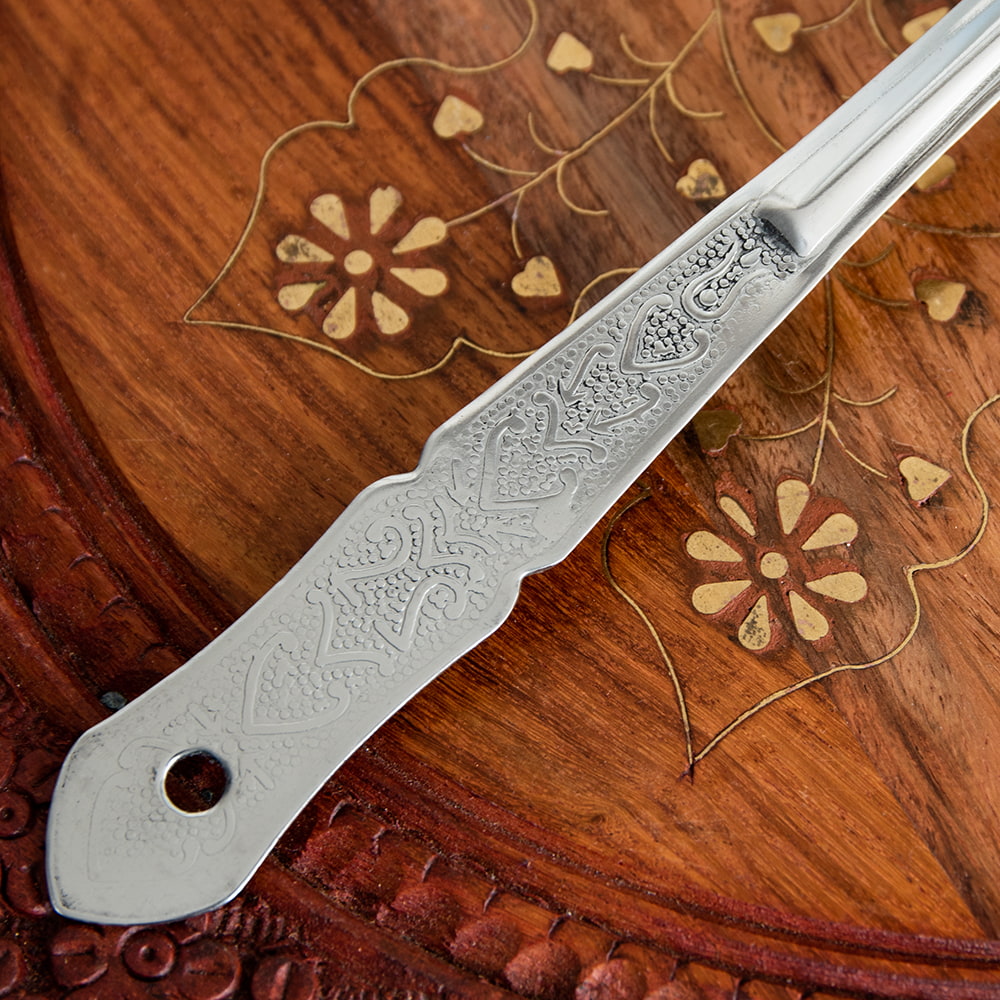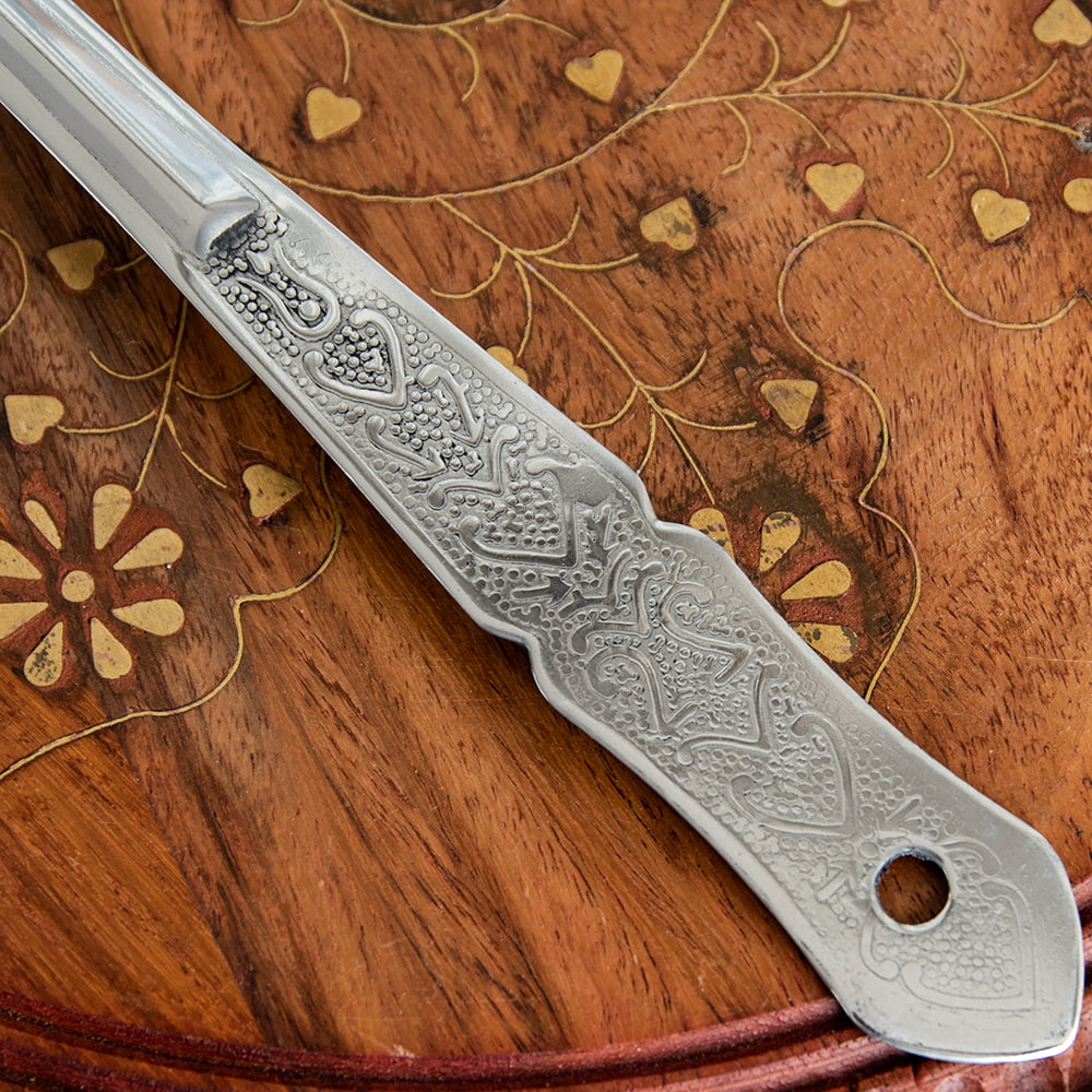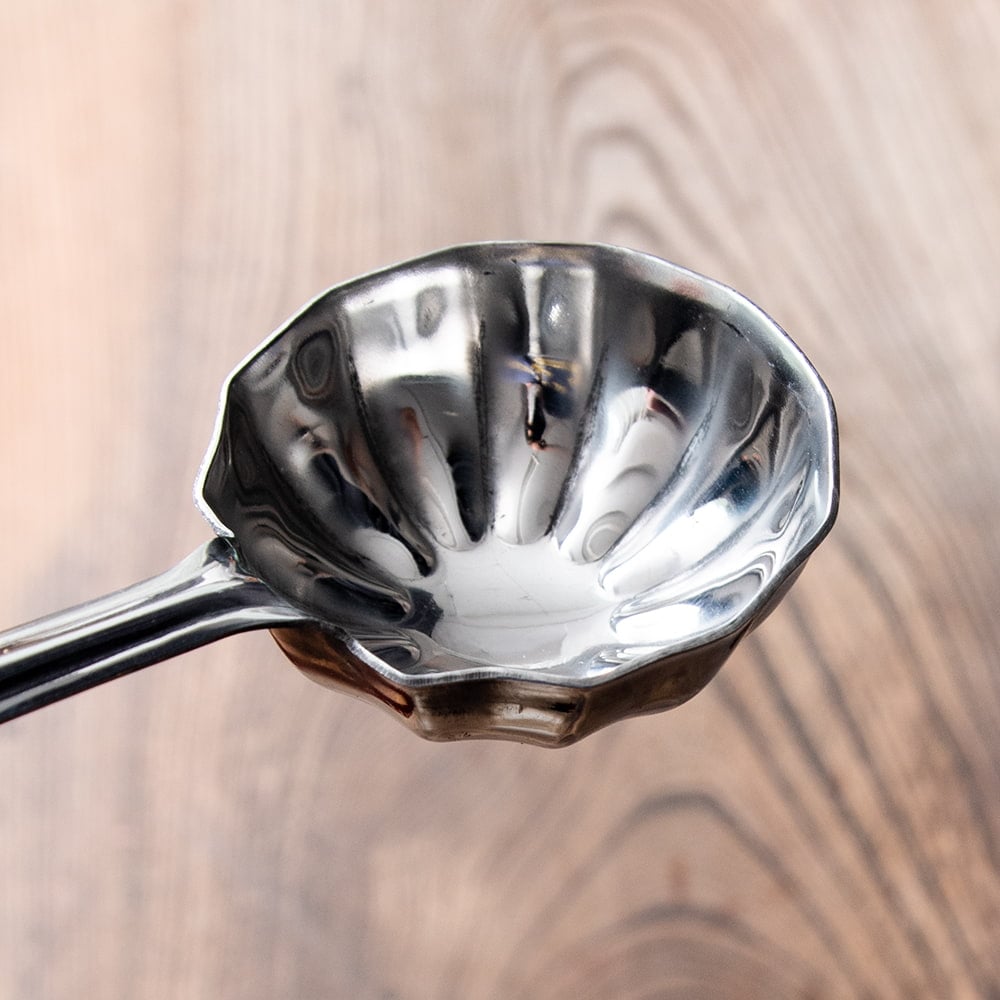 インドから届いたレードルです。スプーン部分が花形になっていて、レトロカワイイデザインです。日本ではこんな形のレードル、なかなかみかけませんね。深みがあるので、ダールやジョル、カレー類など汁気の多い料理をサーブするのに使い勝手が良さそうです。持ちての部分に穴が開いているのでS字フックなどに掛けられるのも嬉しいところです。しっかりしたステンレス製で長くお使いいただける品です。