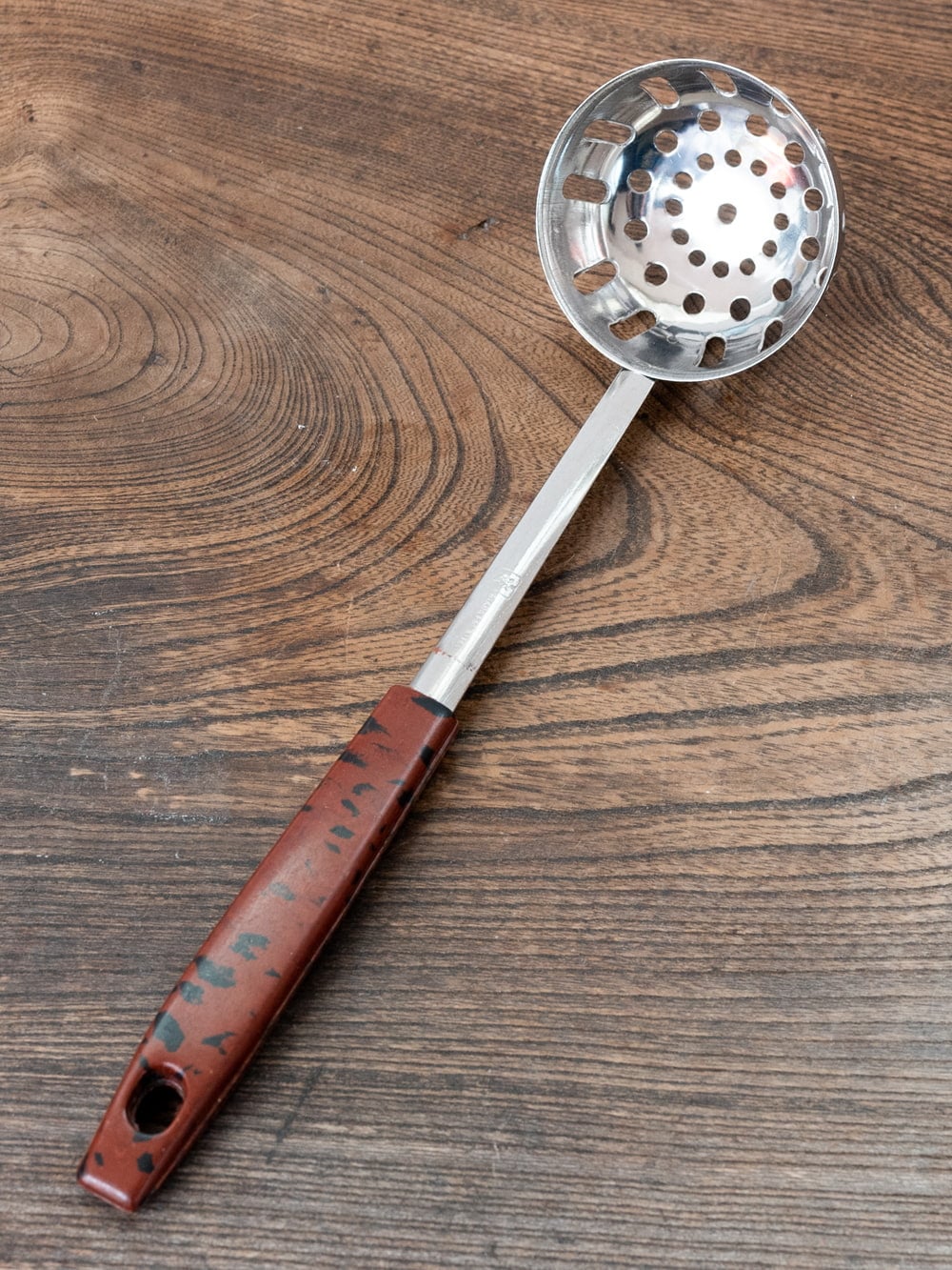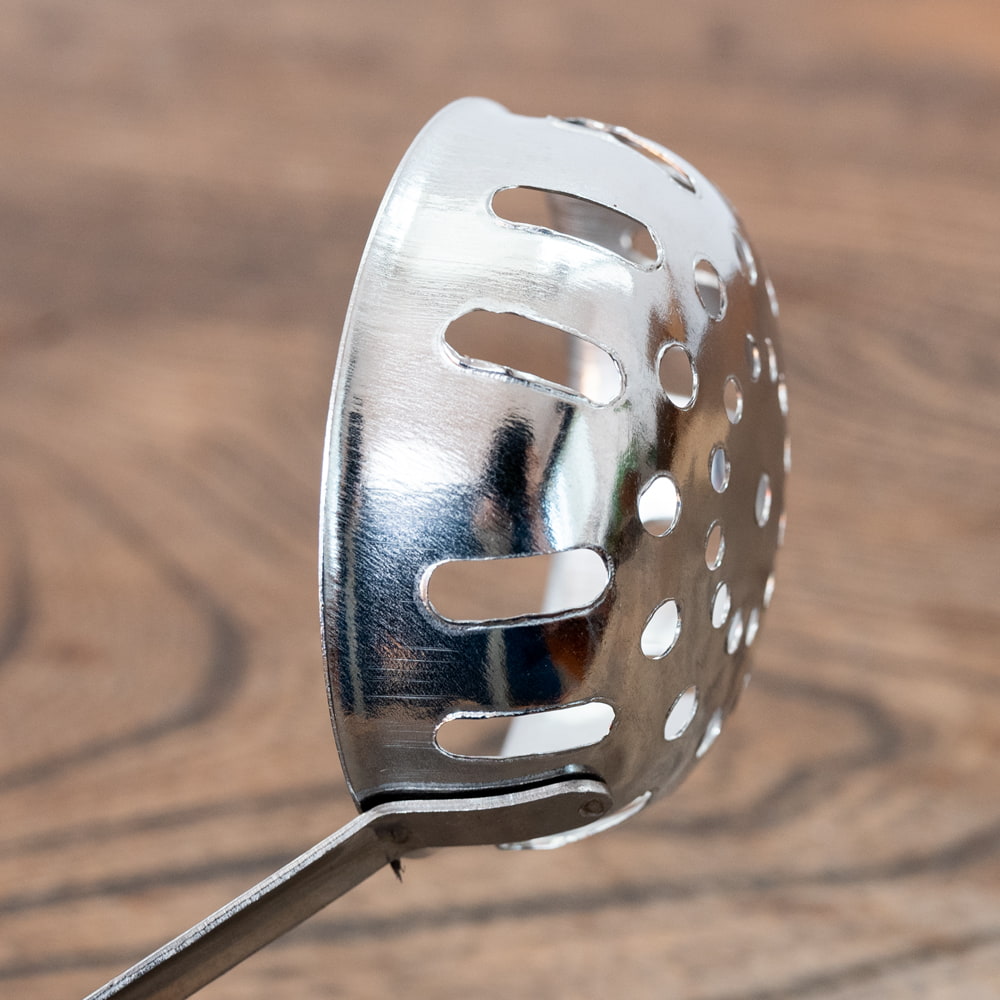 タイの屋台やキッチンなどで使われている穴あきお玉です。現地では、タイスキ鍋などで使われています。特徴的なのが深さ。普通のお玉よりも深いので、お鍋から具材を取り出しやすく、とっても便利。持ちて部分は、プラスチックになっているので、熱さが伝わらず使いやすいです。タイ料理、アジア料理だけではなく、さまざまな料理へオススメ。日本のご家庭や飲食店さんなどでも、日常的に活躍してくれそうです。