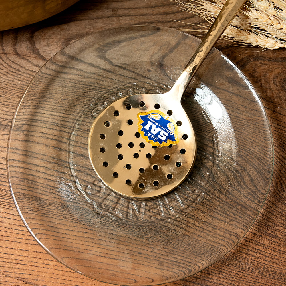 日本では中々お目にかかれない、真鍮製の調理器具です。おたま…というには深さがやや物足りませんので、炒めもの時に使ったり、料理を取り分けたりするのに良さそうなサイズ感になります。インドでは、「パニプリ」を揚げた時に油の中からすくい出す時に使っています。