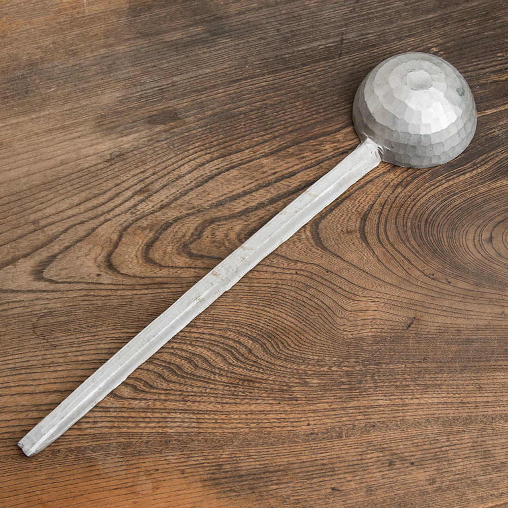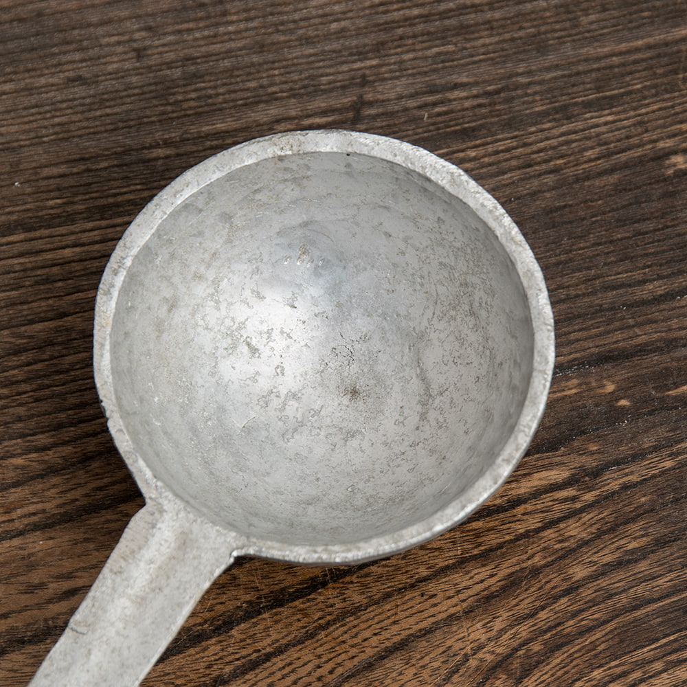 ネパールで見つけたアルミのお玉です。お世辞にも美しいとは言えないめちゃくちゃワイルドなネパール現地仕様…というか現地過ぎる! 珍しいモノ好きなティラキタスタッフが大喜びで仕入れてきちゃいました。日本に帰ってきてネパール人スタッフのサラダちゃんに聞いてみると、ネパールの田舎・地方の方では定番のアイテムなのだとか。ダール(豆のスープ)を扱うのにぴったりなのだそうです。アルミだから錆びないし、柄がとても長いので鍋に入れたままでも持ち手が熱くなりすぎない便利なアイテムとのこと。そう言われてみるとたしかに使いやすいのかも…!