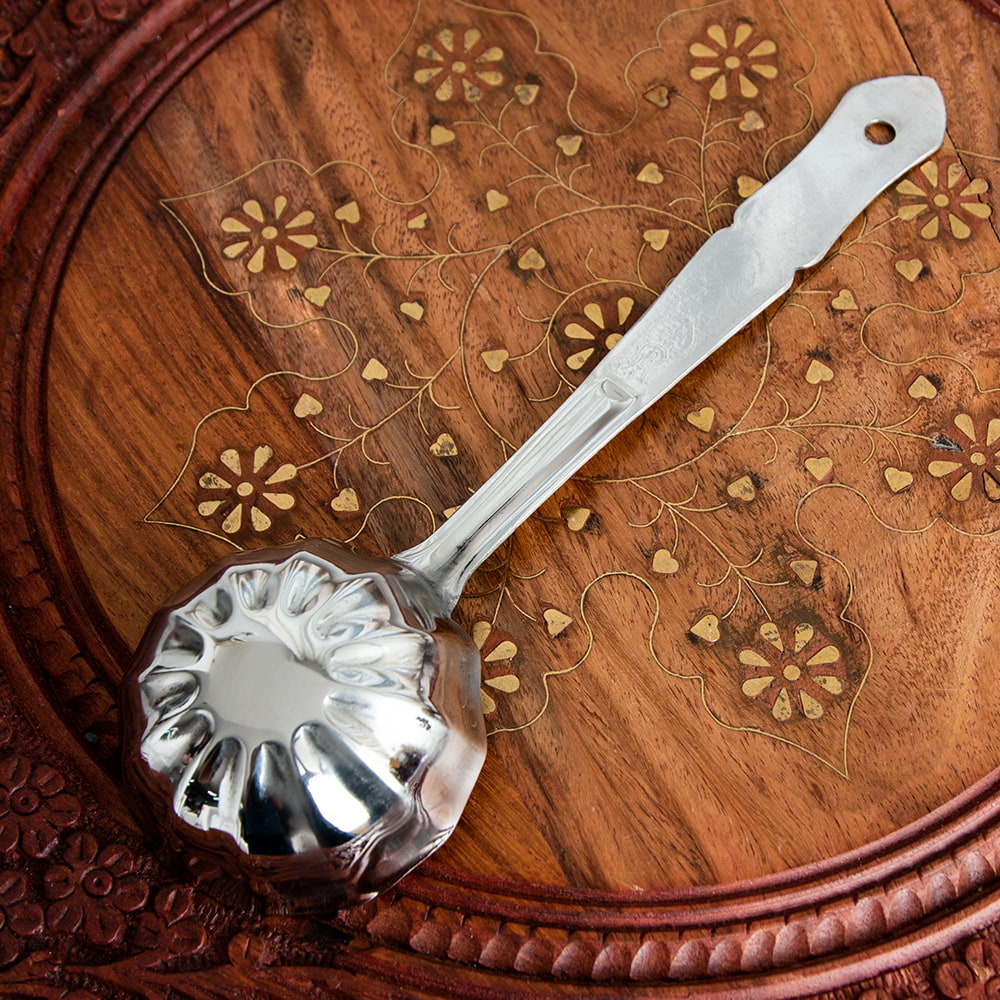 インドから届いたレードルです。スプーン部分が花形になっていて、レトロカワイイデザインです。日本ではこんな形のレードル、なかなかみかけませんね。深みがあるので、ダールやジョル、カレー類など汁気の多い料理をサーブするのに使い勝手が良さそうです。持ちての部分に穴が開いているのでS字フックなどに掛けられるのも嬉しいところです。しっかりしたステンレス製で長くお使いいただける品です。