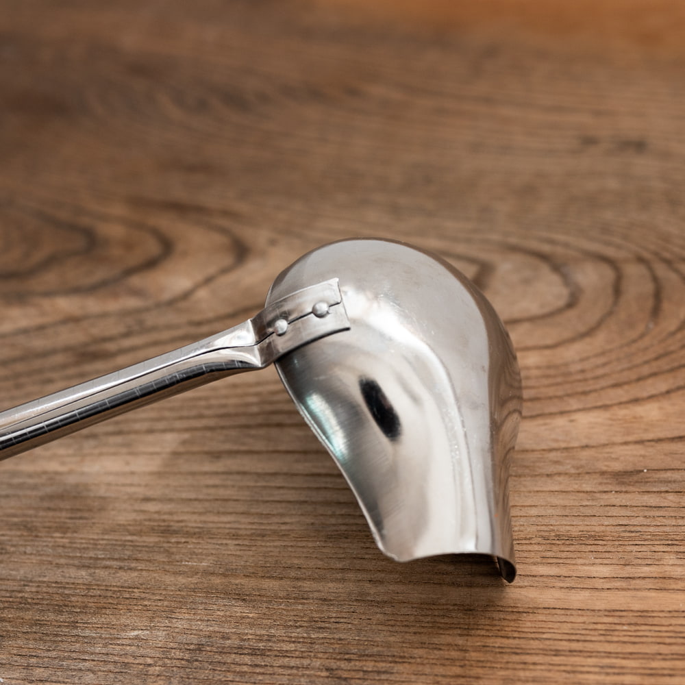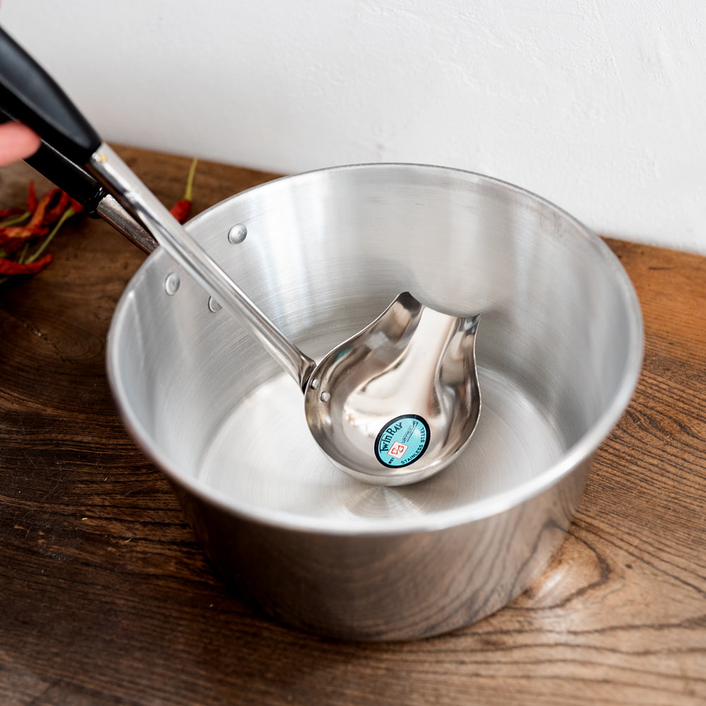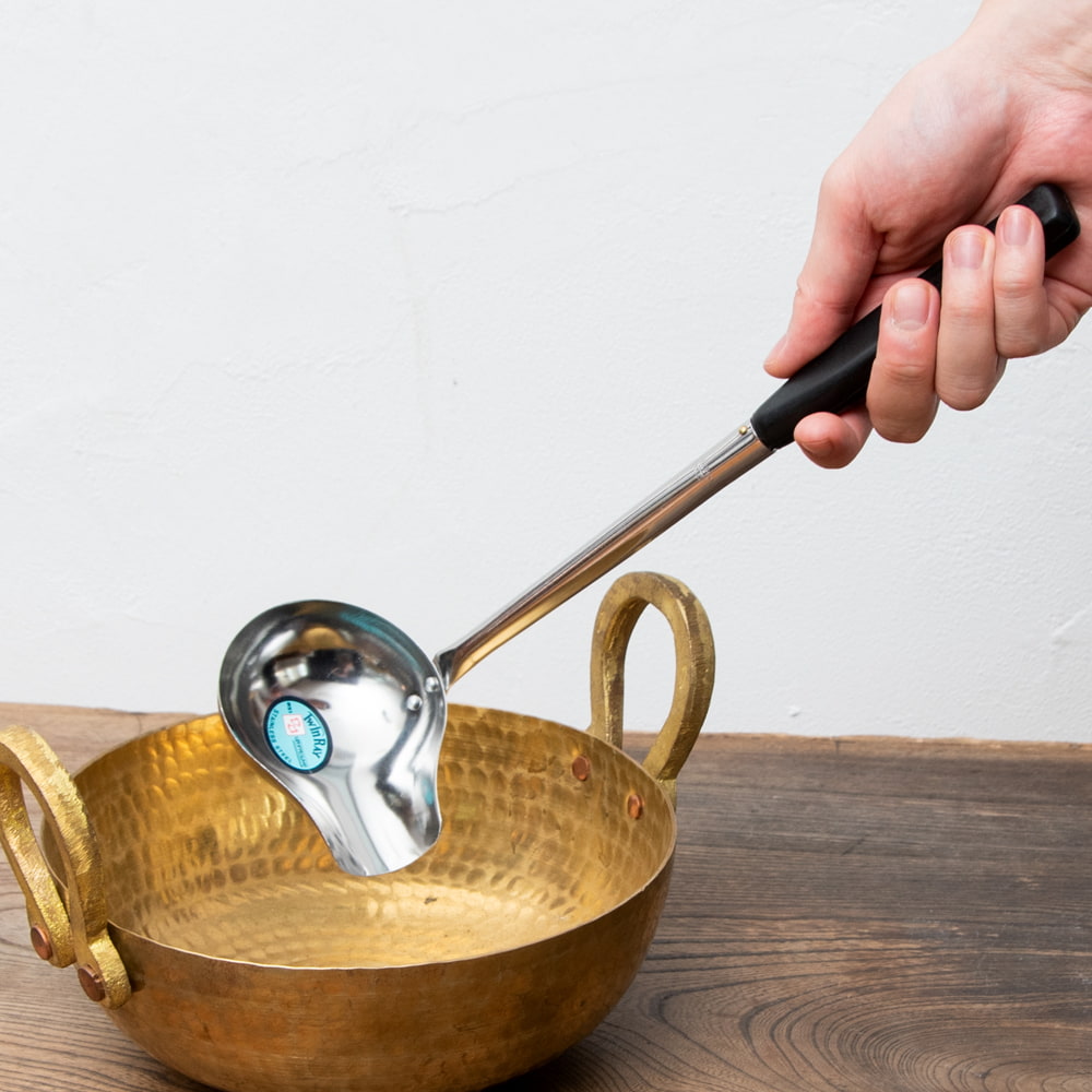 タイの屋台やキッチンなどで使われている横口レードルです。お鍋の中をかき混ぜたり、スープ類をよそう際、液体調味料をすくったりと幅広くお使いいただけます。持ちて部分は、プラスチックになっているので、熱さが伝わらず使いやすいです。レードルが横に広がっていて、注ぎ口のある横口レードルなので、スープなどの汁ものが注ぎやすく実用的で便利!