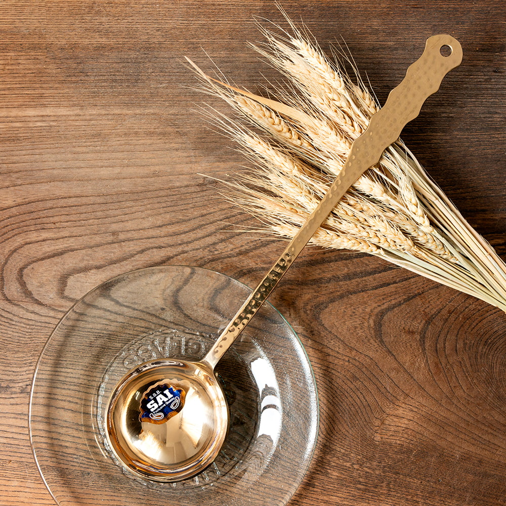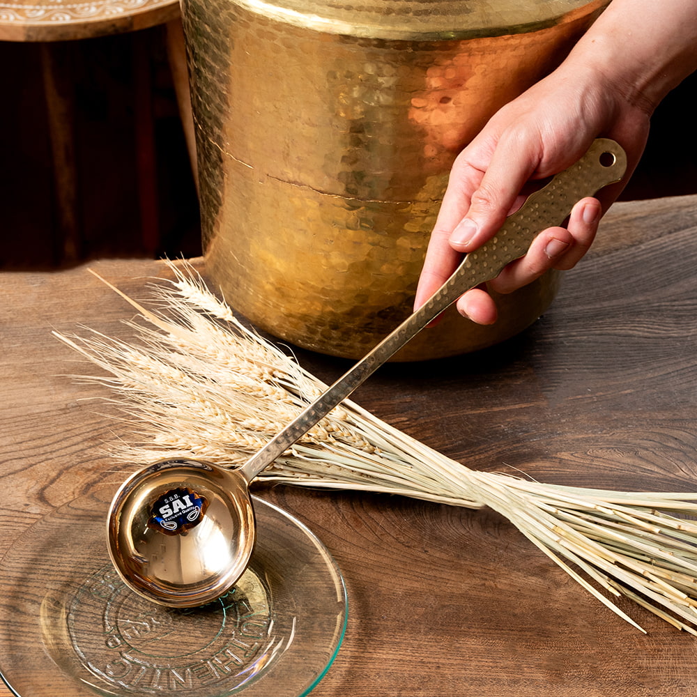 日本では中々お目にかかれない、真鍮製のおたまです。大きな鍋でも安心な長い柄が特徴的です。インドではカレーや大皿料理を取り分けるときに使っています。