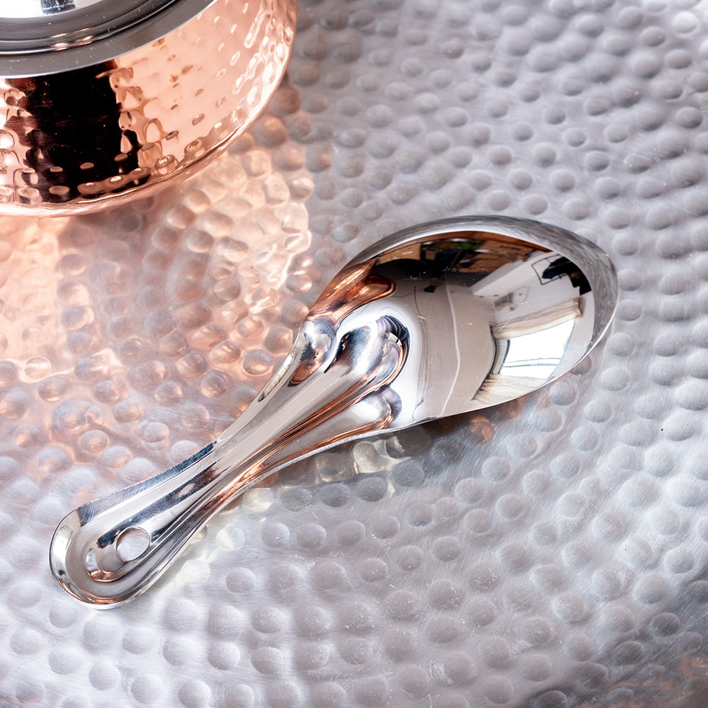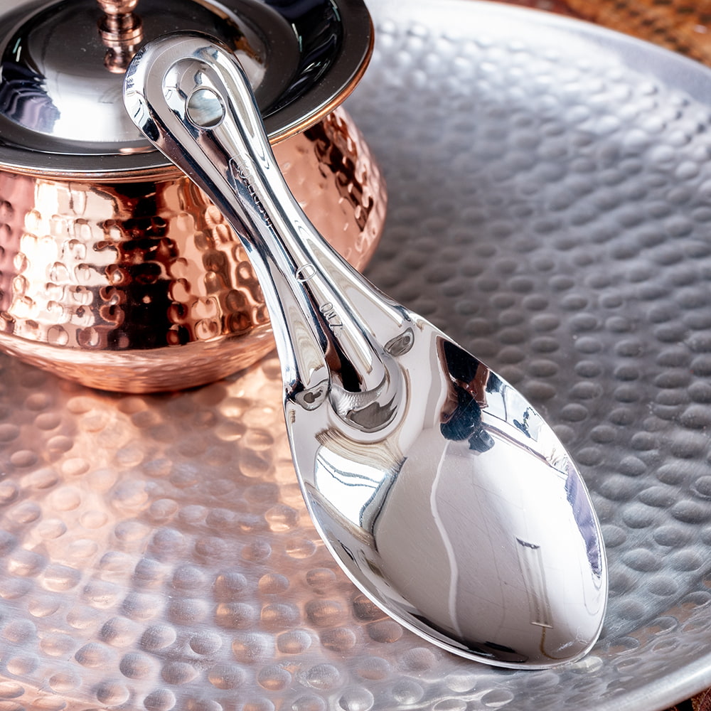 インドからやってきたサービングスプーンです。インド版しゃもじとして、主にご飯物を取り分けるときなどに使われています。インド定番のステンレス製で丈夫な作り。見た目はスタイリッシュでおしゃれなフォルムです。インド料理を食べるときの、ライスやビリヤニの取り分けに活躍しそうです。もちろんインド料理以外にも、パエリアなどさまざまなお料理の取り分けにご使用いただけます。