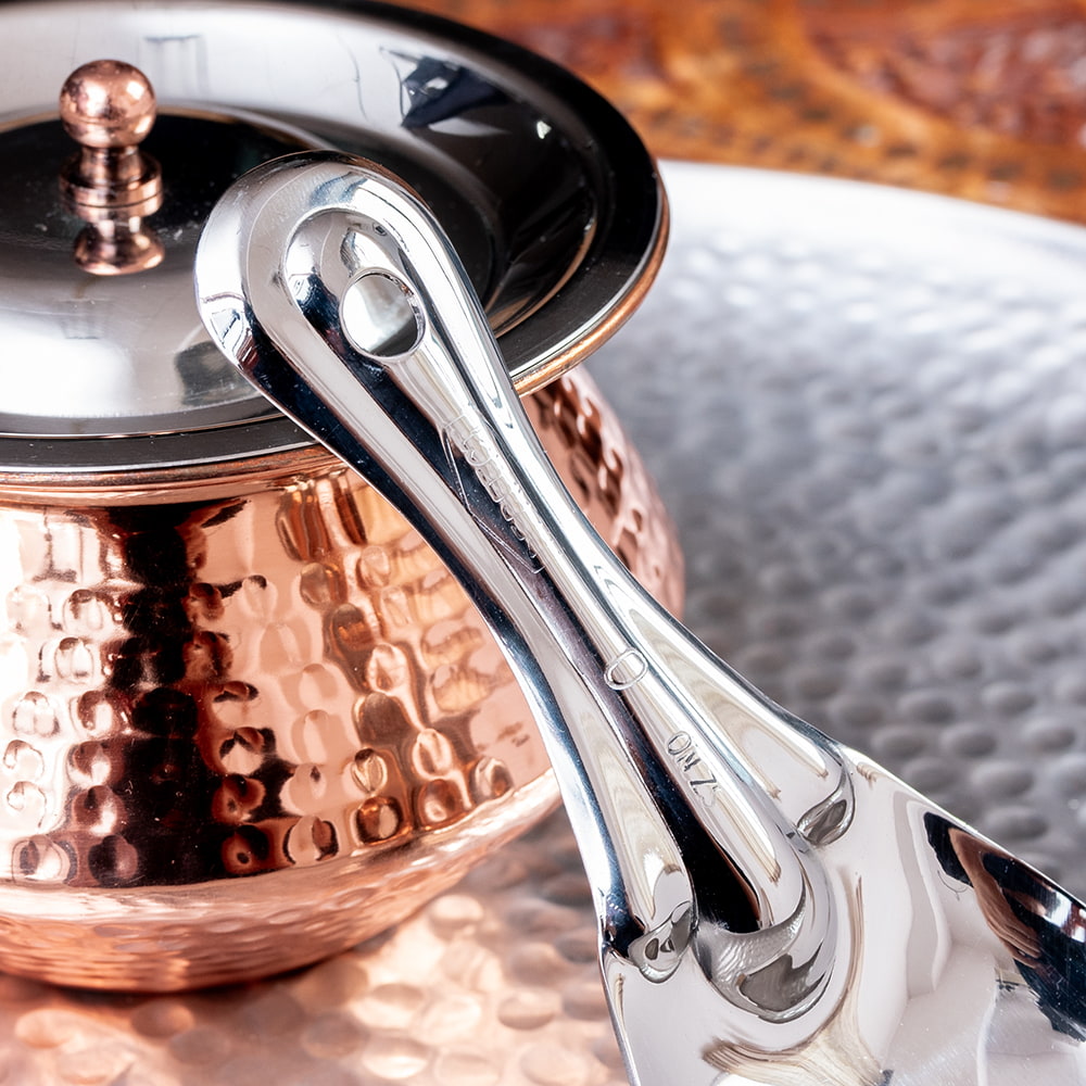 | おことわり | インド製品の為、小キズや若干の凹み等がございます。部分的にグレーの跡がございますが、研磨剤の残りです。よく洗ってからご使用ください。また、ハンドメイド品の為、スプーンの角度には個体差がございます。予めご了承くださいませ。 |