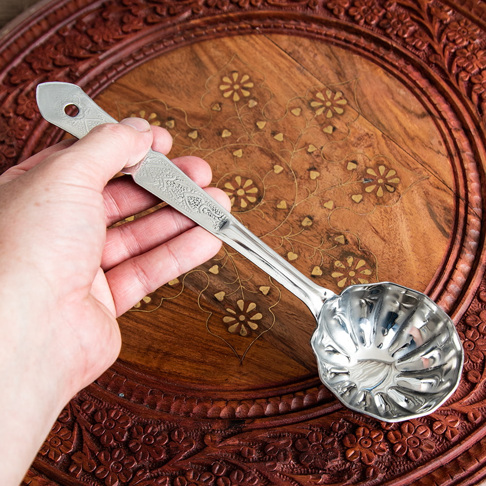 インドから届いたレードルです。スプーン部分が花形になっていて、レトロカワイイデザインです。日本ではこんな形のレードル、なかなかみかけませんね。深みがあるので、ダールやジョル、カレー類など汁気の多い料理をサーブするのに使い勝手が良さそうです。持ちての部分に穴が開いているのでS字フックなどに掛けられるのも嬉しいところです。しっかりしたステンレス製で長くお使いいただける品です。