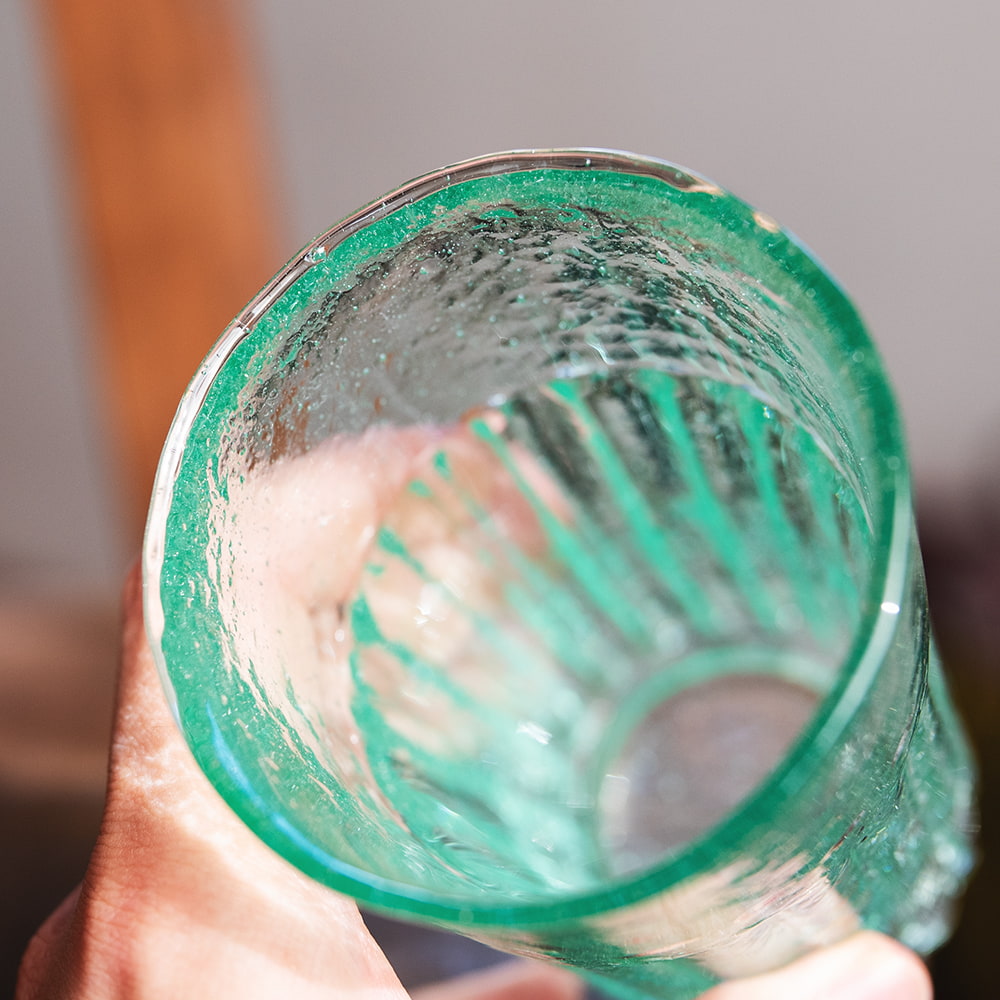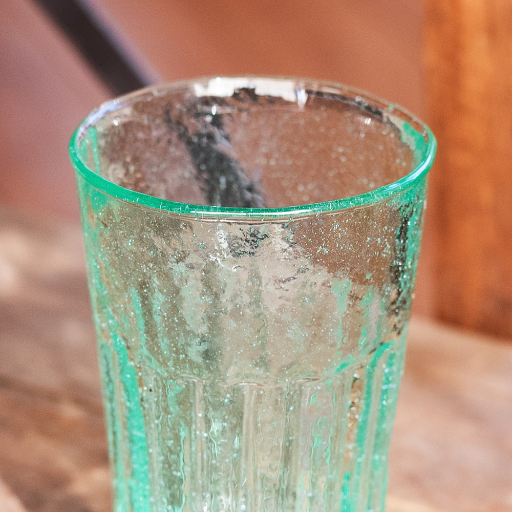 そんなビア・ホイの魅力をさらに引き立てるのが、このビア・ホイグラスです。ティラキタスタッフも、ハノイを訪れると、必ずビア・ホイを飲みに行きます。そしてビア・ホイにはこのグラスが欠かせません。厚みのあるガラスで作られたこのグラスは、夏のハノイの気候の中でも冷えたビールの温度を保ちやすく、手にしっくり馴染むサイズ感も魅力的。酔っ払っていても倒れにくい、ずっしりとした安定感があります。厚みのあるガラス、無骨でラフな仕上げ。緩やかに歪んだ形状と、少し不均一なガラスの質感。色合いは薄っすらとした青色や緑色。さらに、気泡が入っていてどこかレトロ感もありとても素敵な見た目をしています。