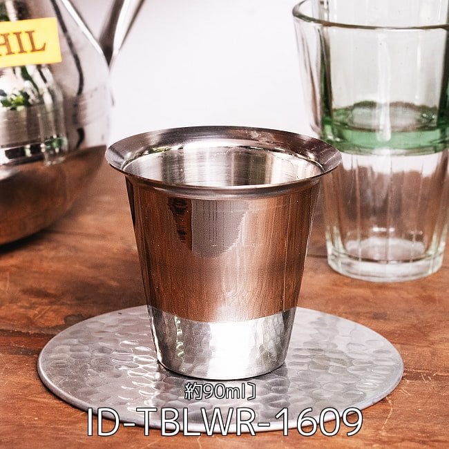 小さなステンレスの南インド式チャイカップ プージャグラス ショットグラスサイズ〔約5.9cm×約6.3cm 約90ml〕(ID-TBLWR-1609)の写真です