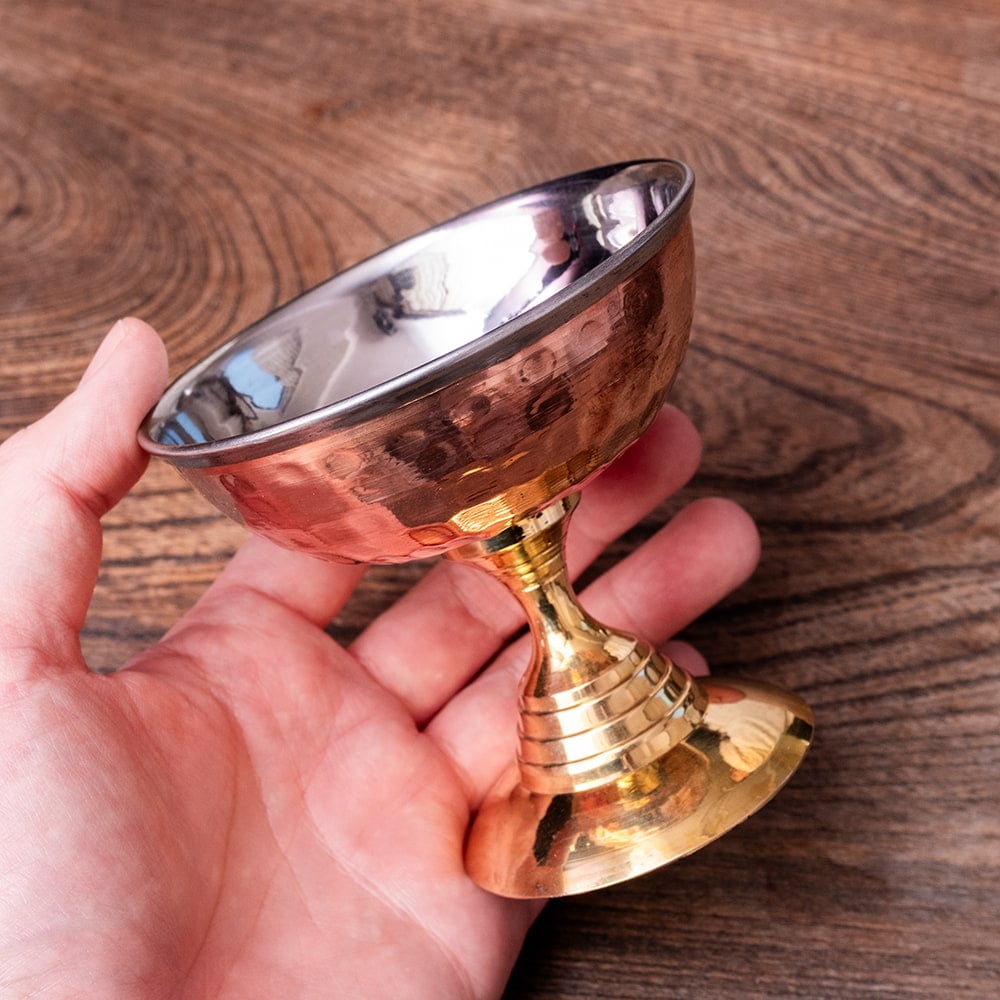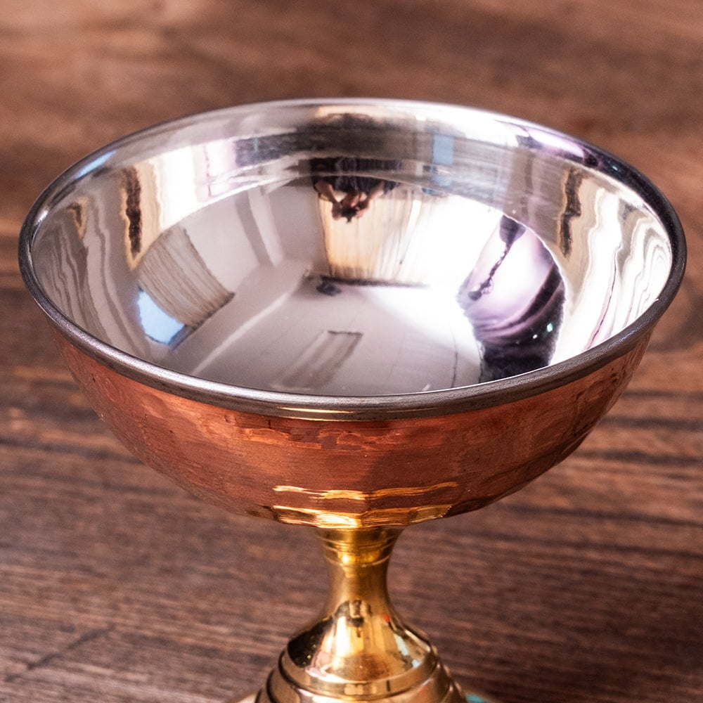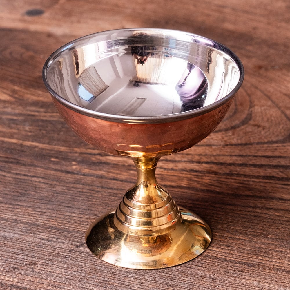 インドのホテルやレストランで実際に使用されている、伝統的なデザートカップです。カップの外側には、手作業による槌目加工が施された銅をあしらい、内側は錆びにくく安心感のあるステンレス仕上げ。そして脚部分には、重厚感のあるブラスを用いています。
