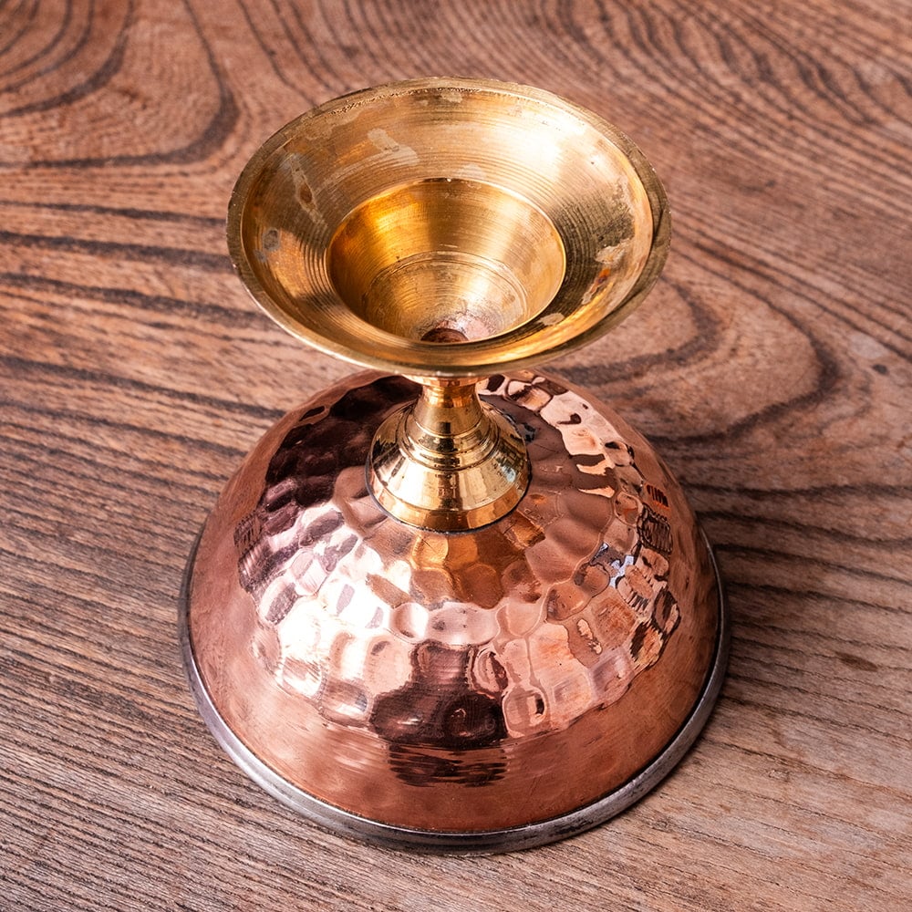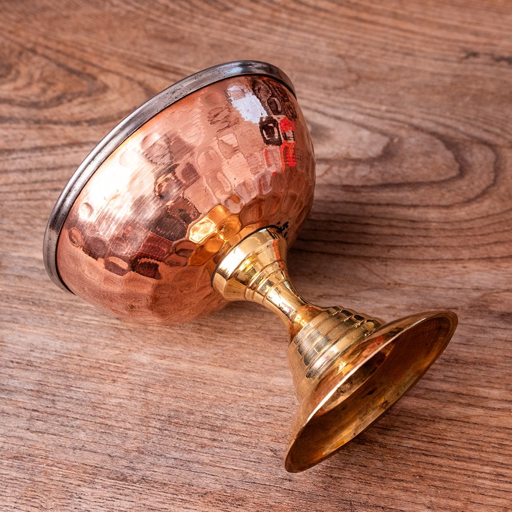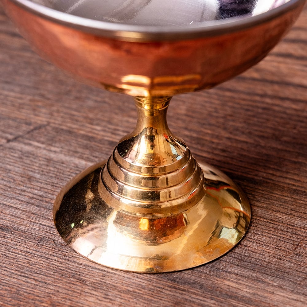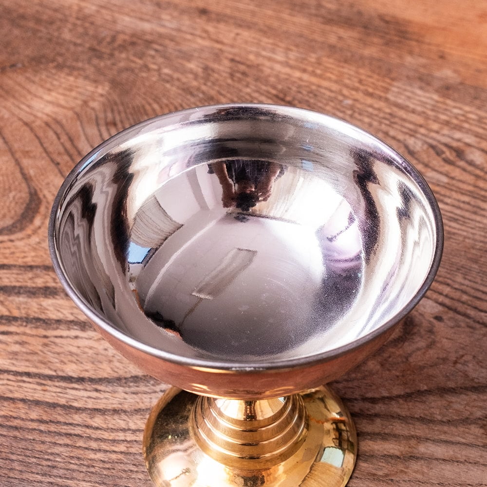 インドのホテルやレストランで実際に使用されている、伝統的なデザートカップです。カップの外側には、手作業による槌目加工が施された銅をあしらい、内側は錆びにくく安心感のあるステンレス仕上げ。そして脚部分には、重厚感のあるブラスを用いています。
