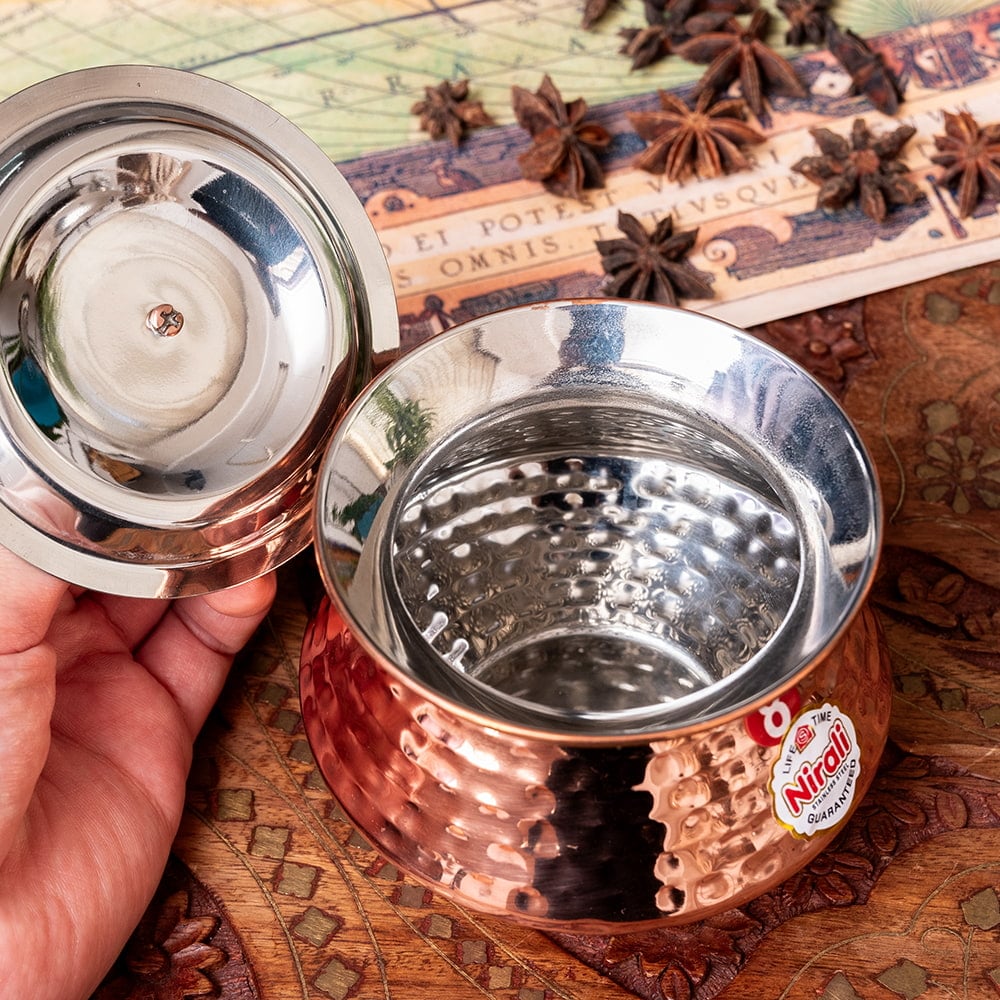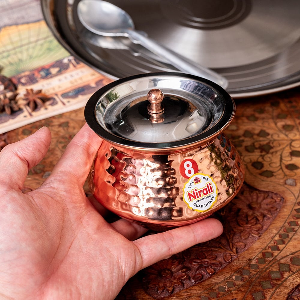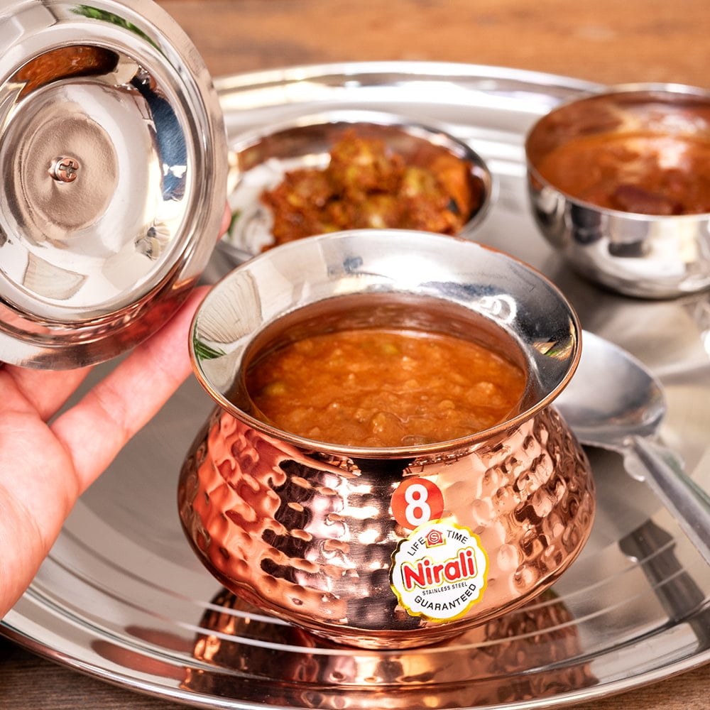 丈夫でニオイ移りが少ないステンレス製。外装は銅でコーティングされております。さらに、槌目仕上げが施されており光の加減で輝き、テーブルを華やかな雰囲気にしてくれます。本場のインド料理の提供用の他、さまざまなお料理の器としてご使用いただけます。