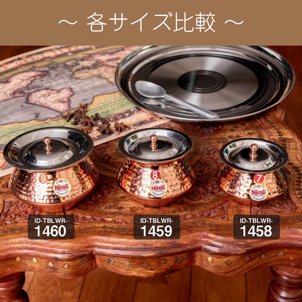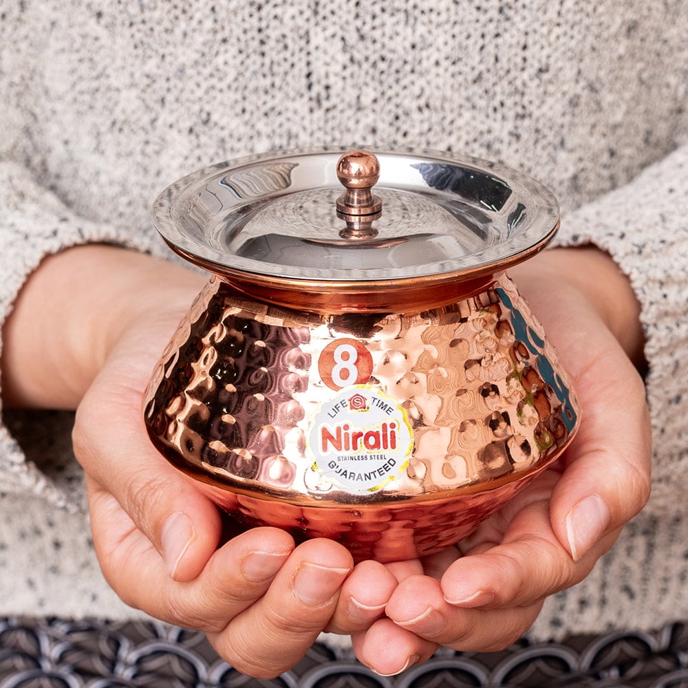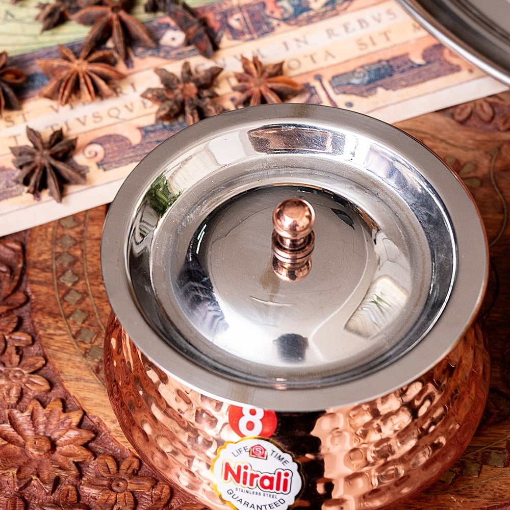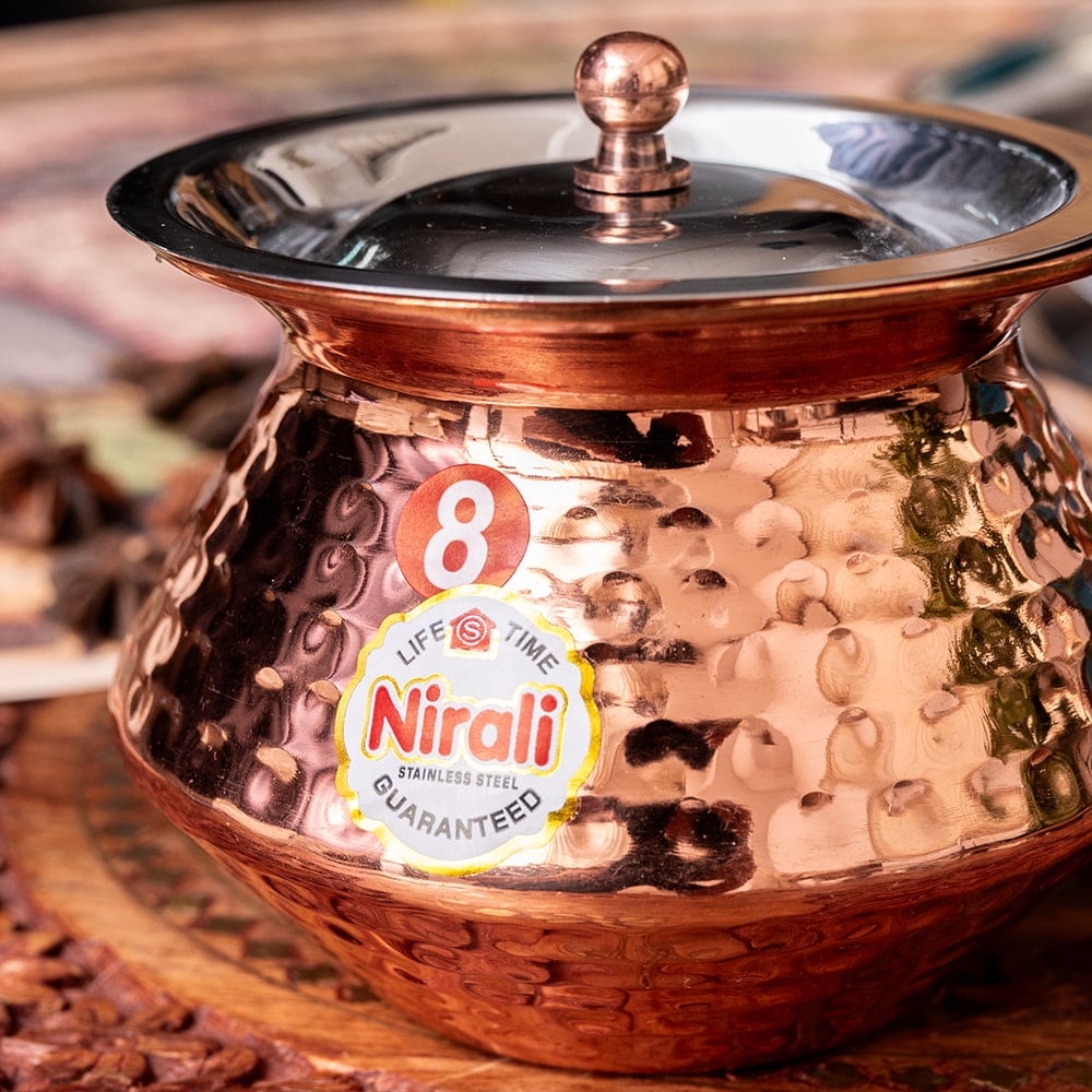 インド伝統の鍋型の器です。大きい物だと、ビリヤニなどの調理用に用いられますが、こちらは別鍋で作ったカレーなどをテーブルに出す際の提供用に使われています。調理用にも使えないことはないですが、基本的にテーブルに並べる器としての用途がおすすめです。■美しい槌目仕上げ