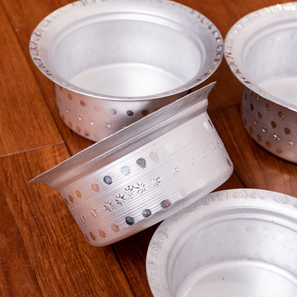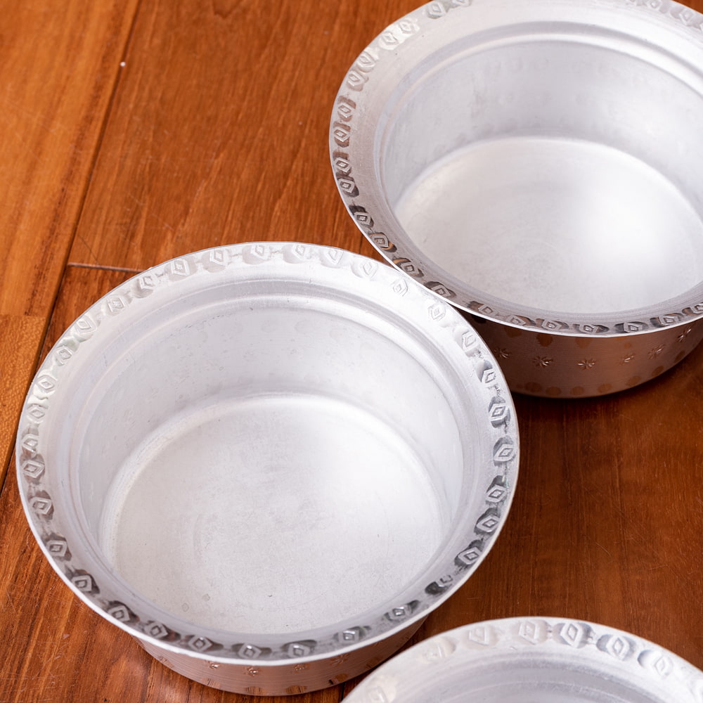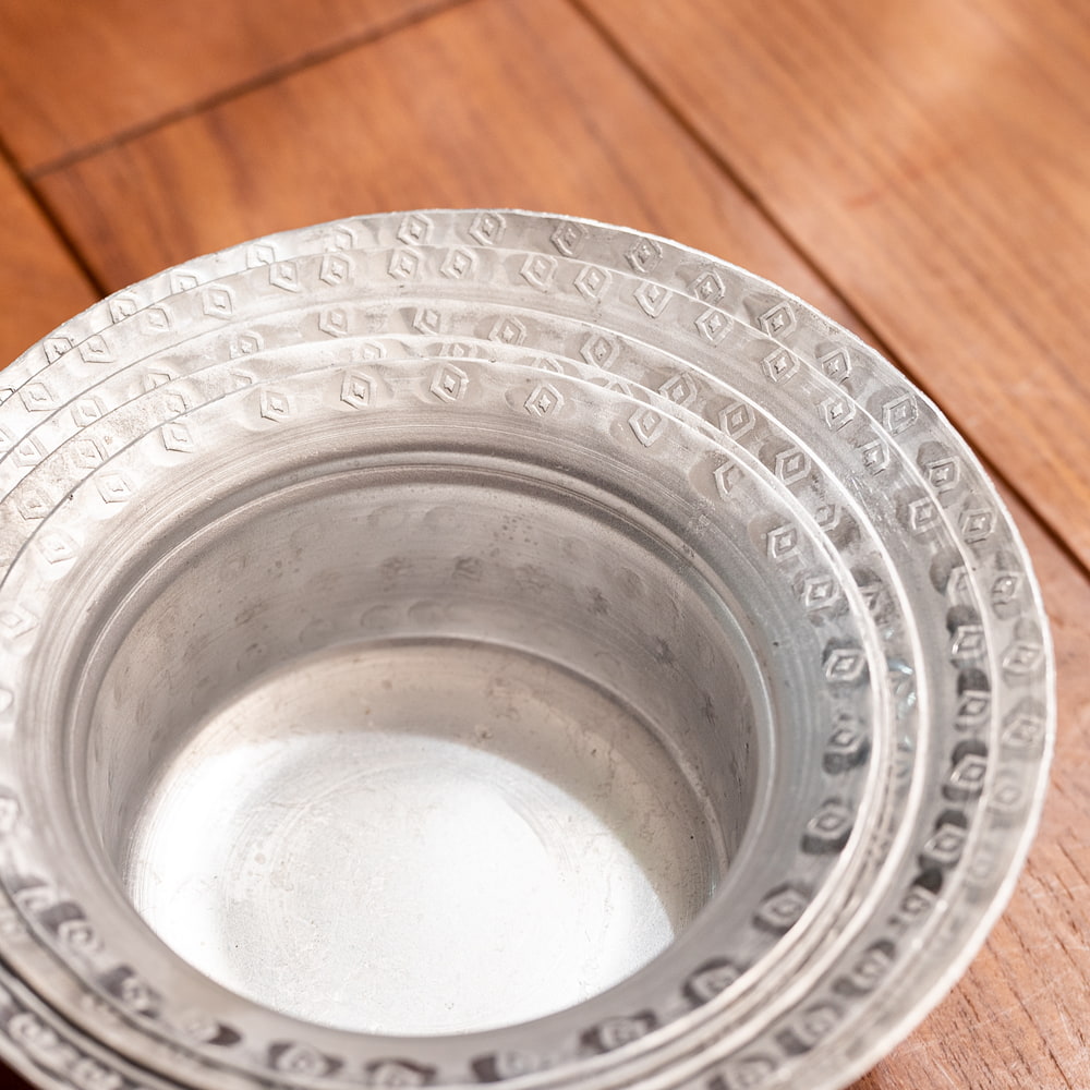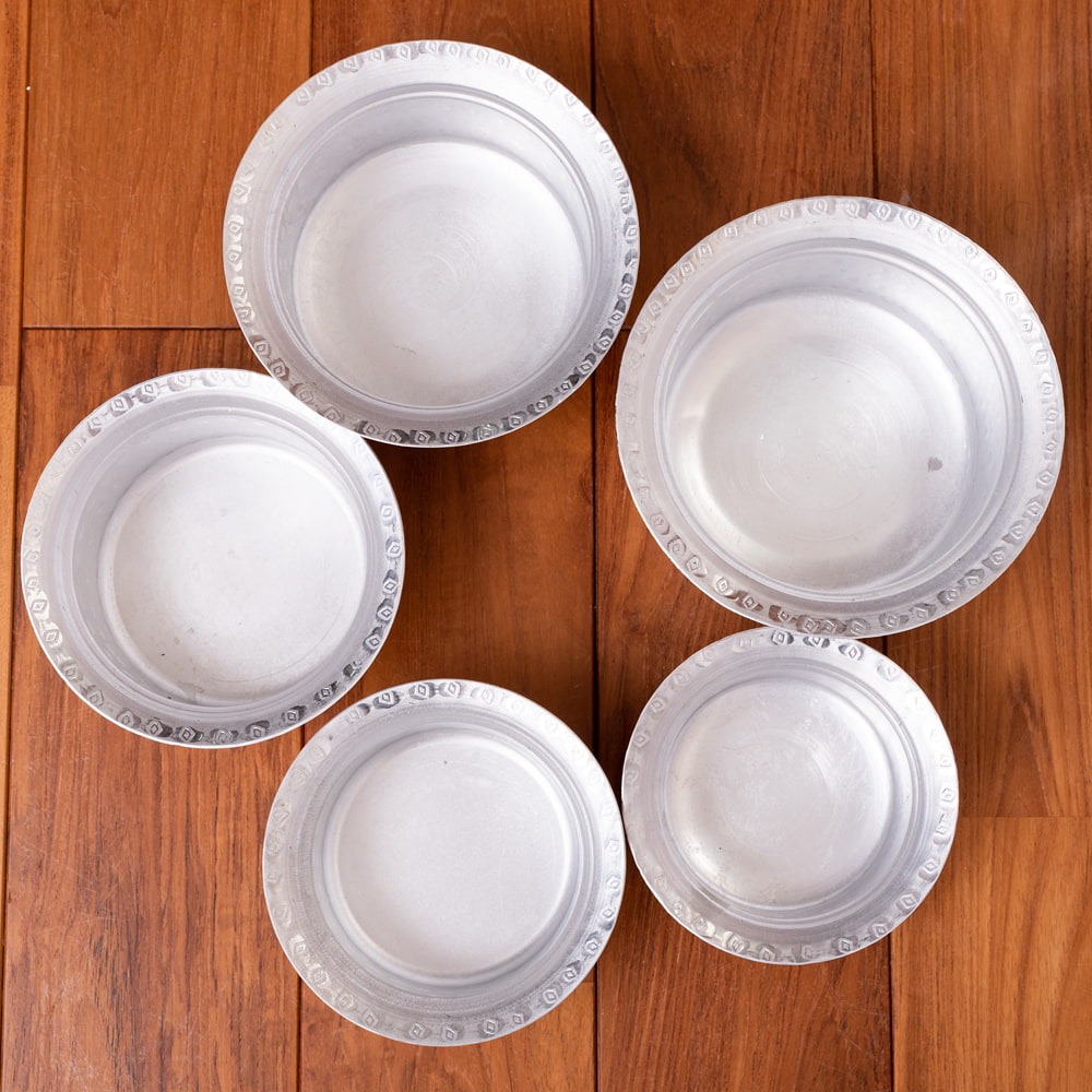 インドからやってきた、アルミ食器5点セットです。深さがあるので、様々な用途にご使用いただけます。カレーやスープ類などの汁物、他にもご飯やオカズ、サラダ類などの食器としておすすめ。アルミ独特の削り出しと、インドらしいアンティーク感漂う無骨なテイストが、とても良い雰囲気の食器です。