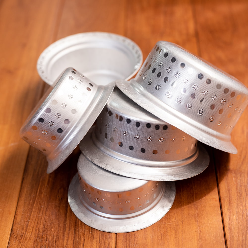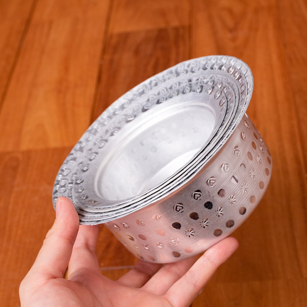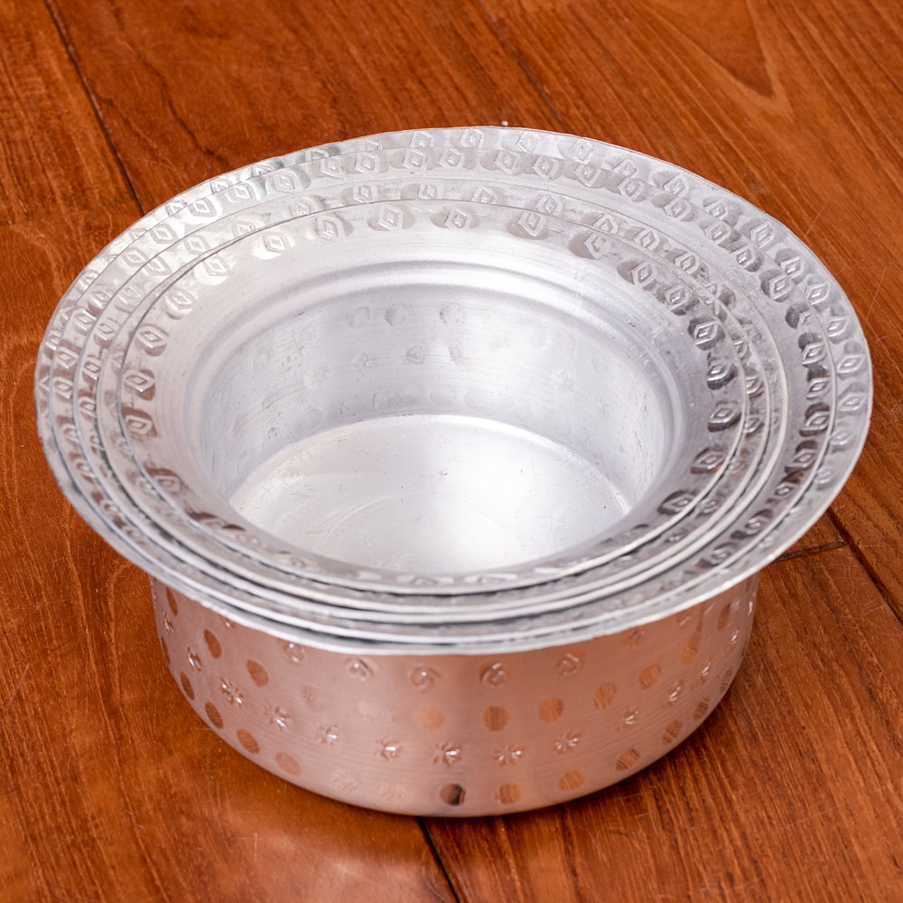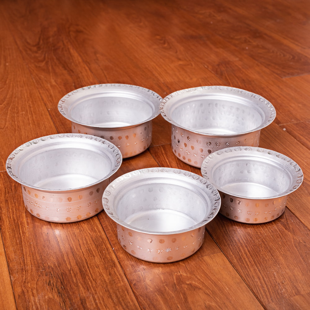 インドからやってきた、アルミ食器5点セットです。深さがあるので、様々な用途にご使用いただけます。カレーやスープ類などの汁物、他にもご飯やオカズ、サラダ類などの食器としておすすめ。アルミ独特の削り出しと、インドらしいアンティーク感漂う無骨なテイストが、とても良い雰囲気の食器です。