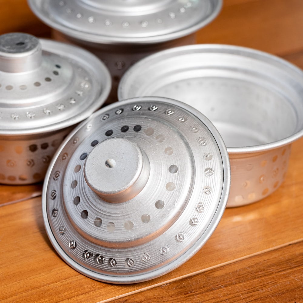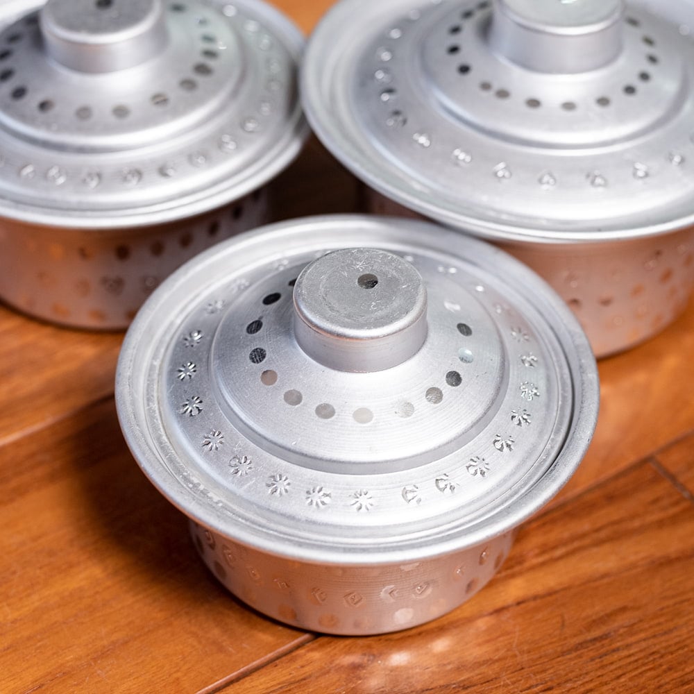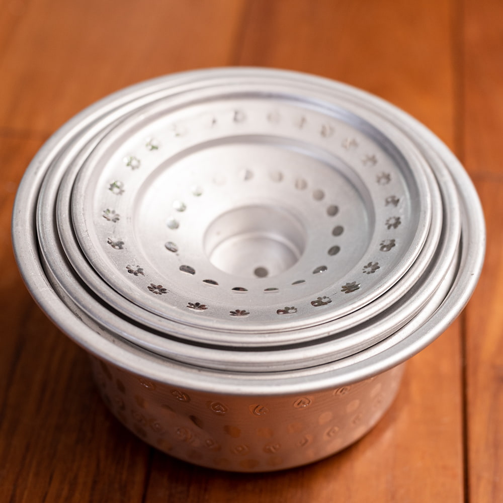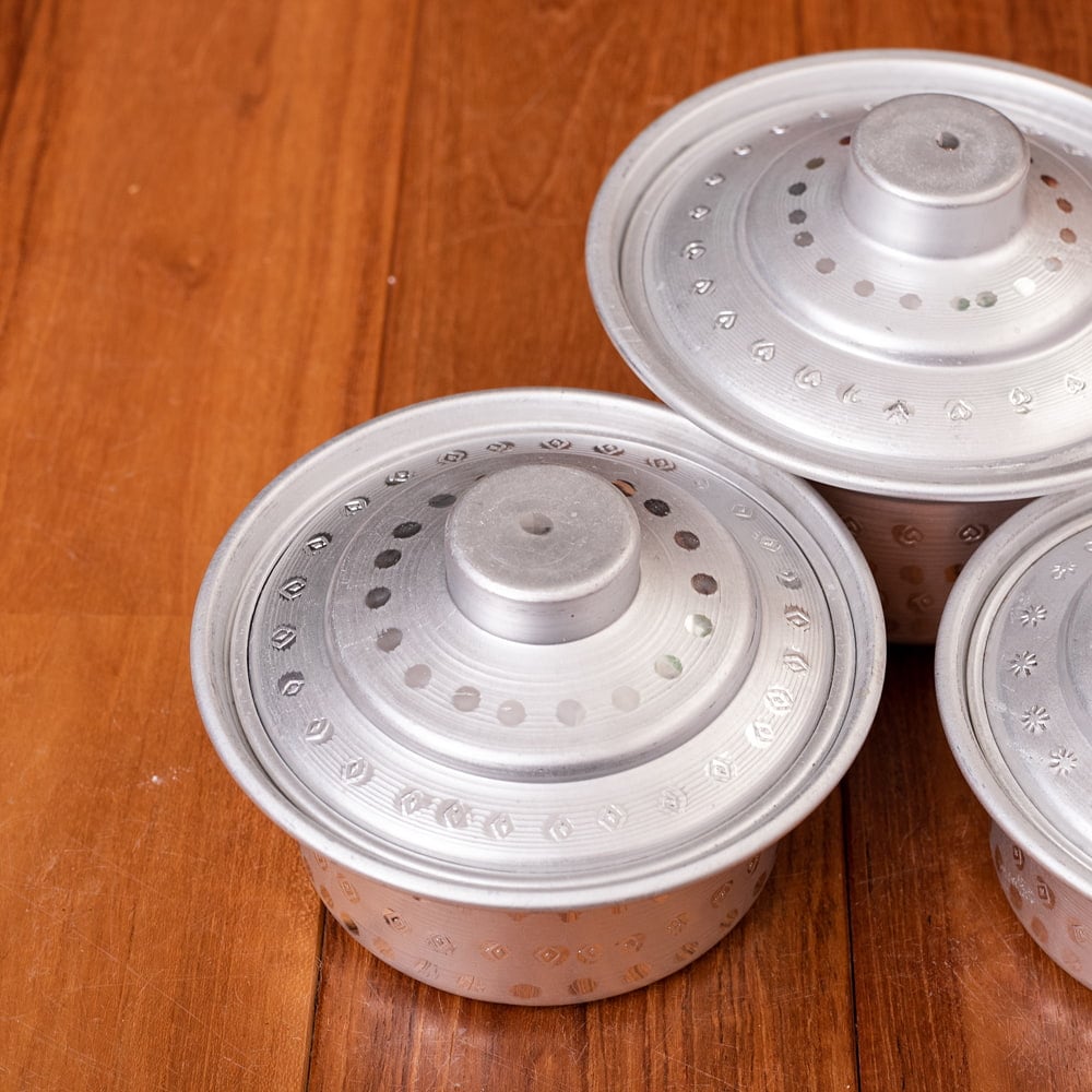 インドからやってきた、蓋付きアルミ食器3点セットです。深さがあるので、様々な用途にご使用いただけます。カレーやスープ類などの汁物、他にもご飯やオカズ、サラダ類などの食器としておすすめ。アルミ独特の削り出しと、インドらしいアンティーク感漂う無骨なテイストが、とても良い雰囲気の食器です。