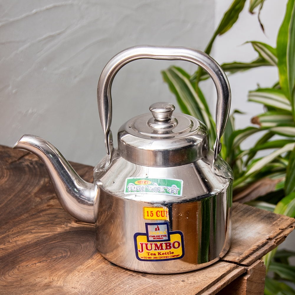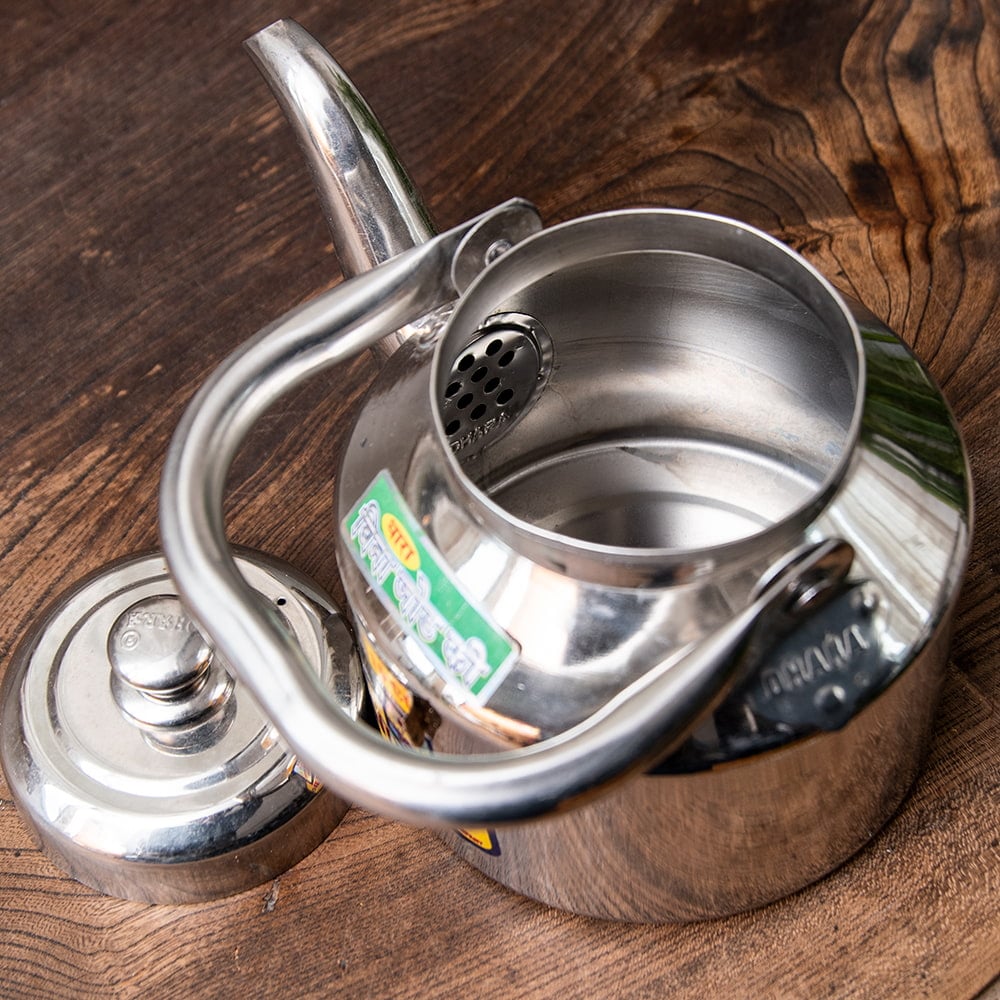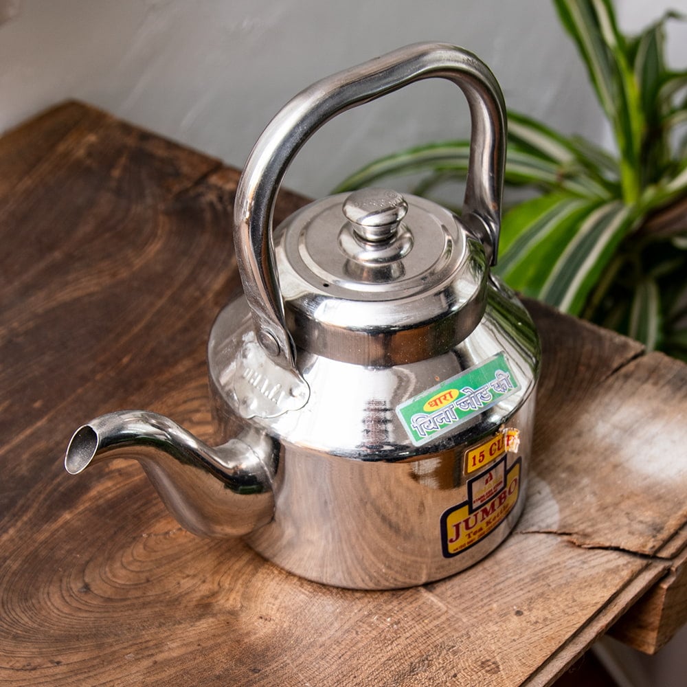 路上のチャイ屋さんがチャイを入れるときに使っているステンレス製のやかんです。コロンとした造形がインドらしくて愛らしさタップリですね。インドのステンレスものとしてはかなり肉厚で、見た目以上にしっかり・ずっしりした印象を与えます。ストリートでのハードな使用に耐えるように作られているのでしょう。こちらは15杯分くらいのチャイ向けのこぶりなタイプのやかんです。見た目は小さいですが家庭用としてはちょうど良いサイズですね。
