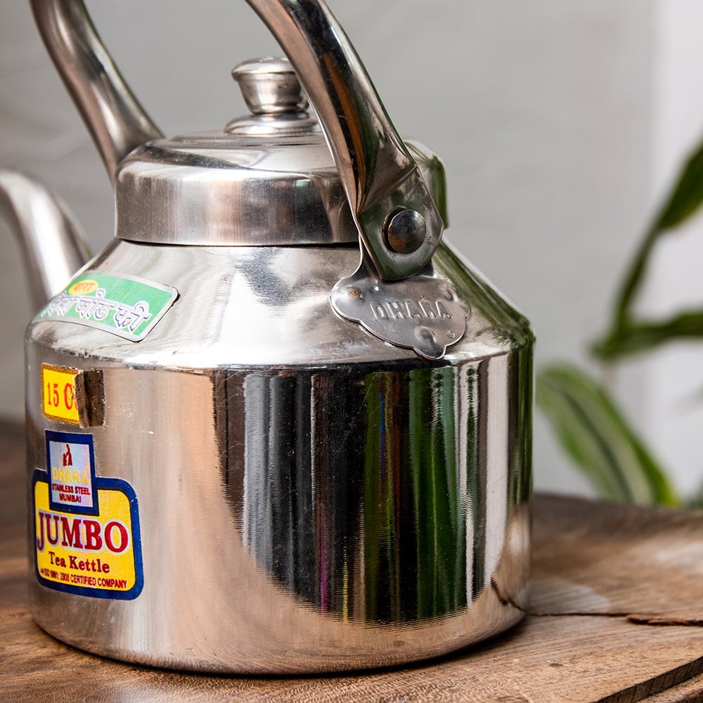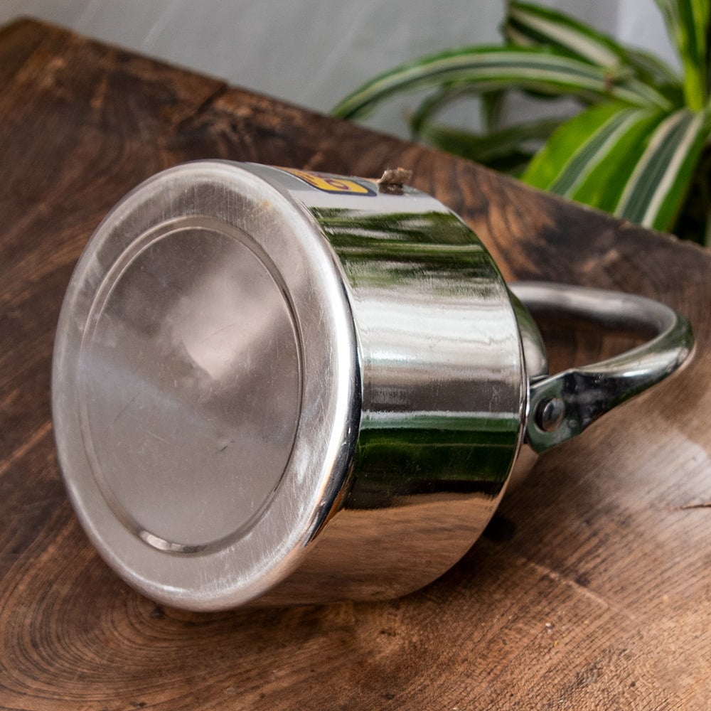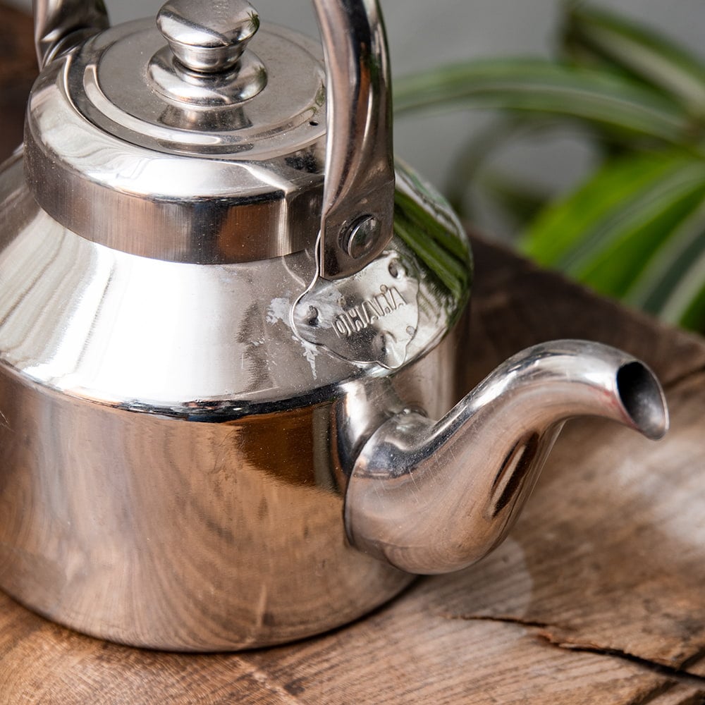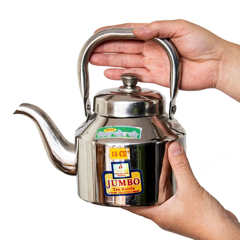 路上のチャイ屋さんがチャイを入れるときに使っているステンレス製のやかんです。コロンとした造形がインドらしくて愛らしさタップリですね。インドのステンレスものとしてはかなり肉厚で、見た目以上にしっかり・ずっしりした印象を与えます。ストリートでのハードな使用に耐えるように作られているのでしょう。こちらは15杯分くらいのチャイ向けのこぶりなタイプのやかんです。見た目は小さいですが家庭用としてはちょうど良いサイズですね。