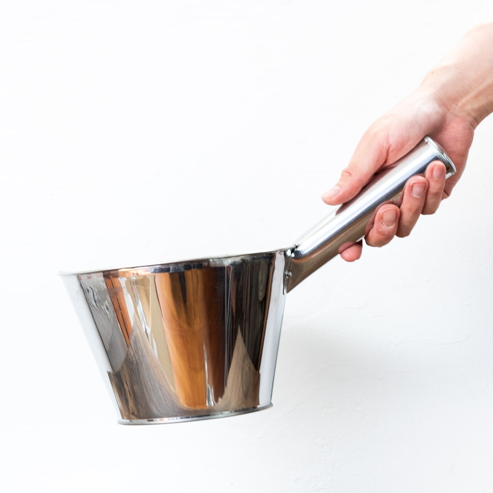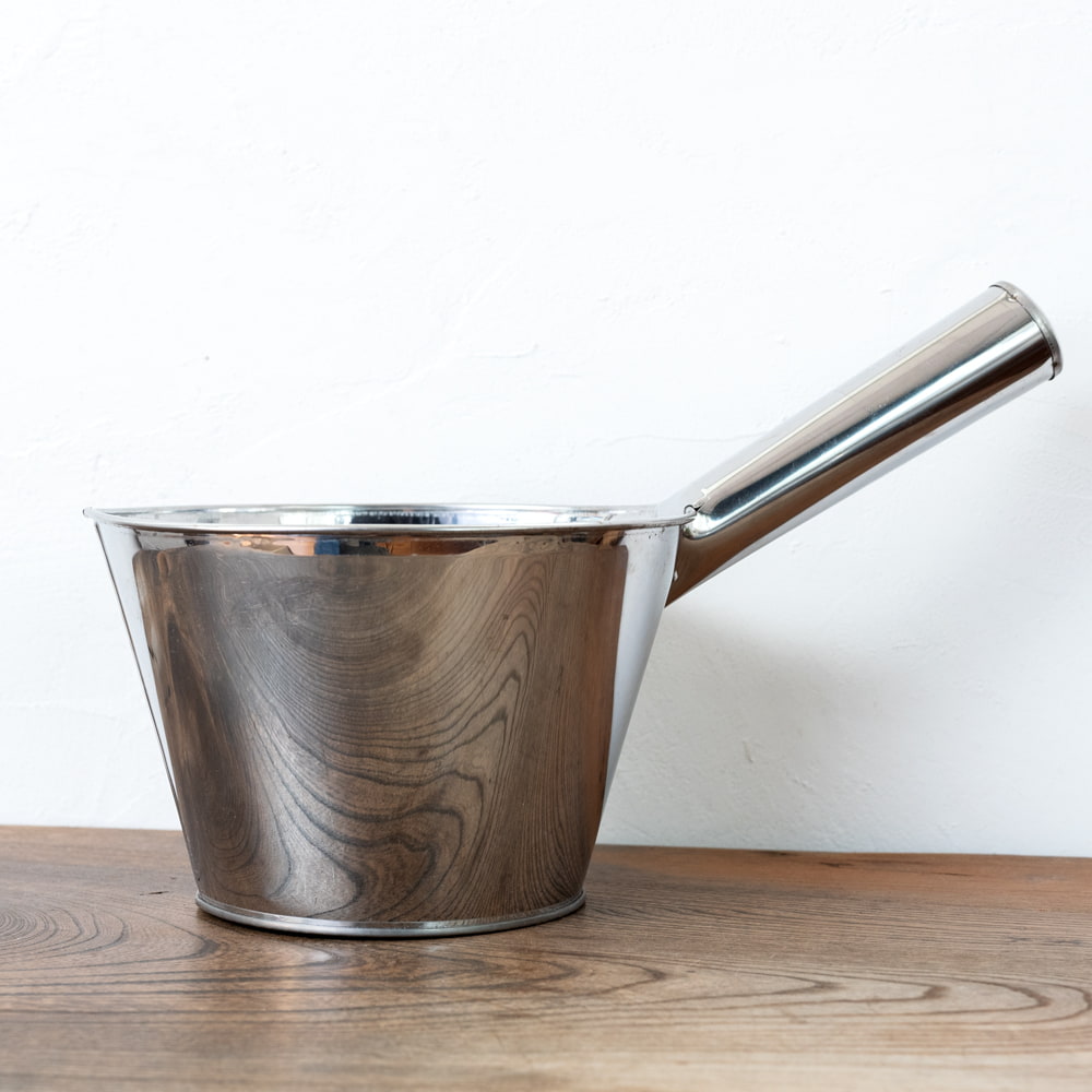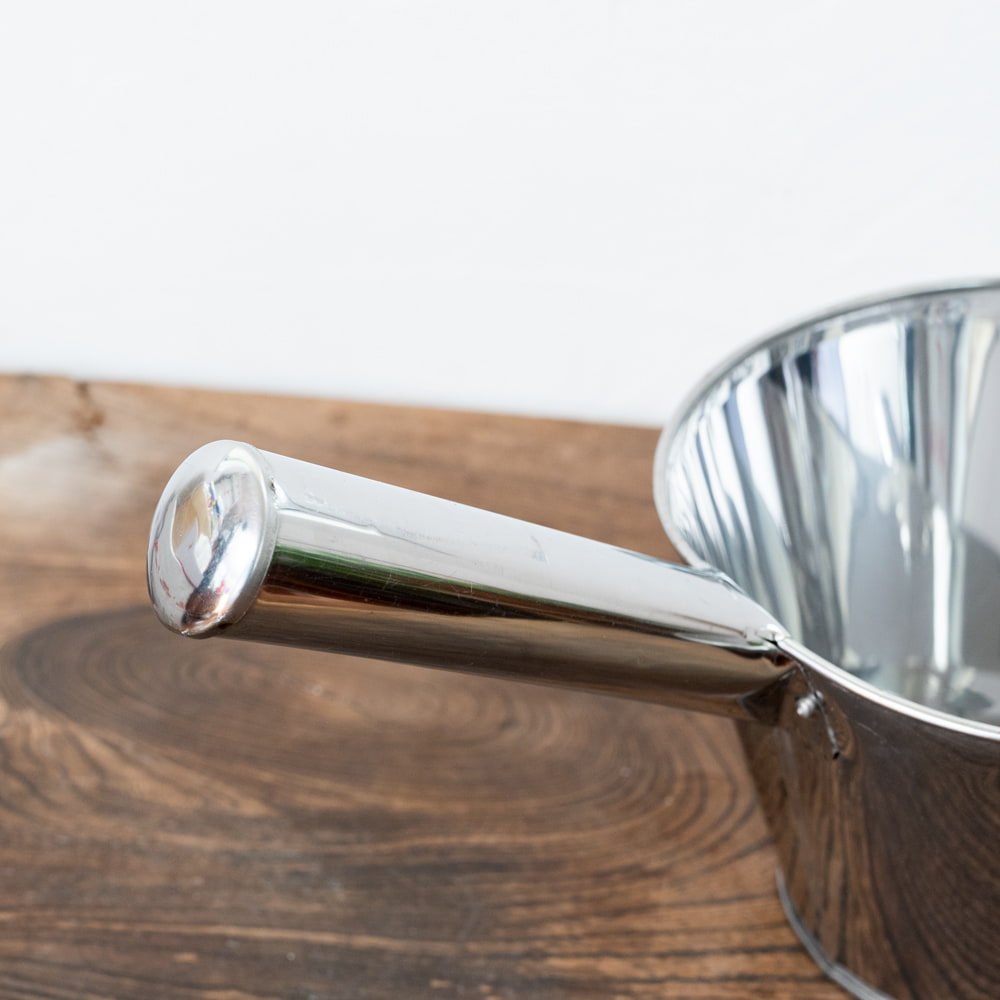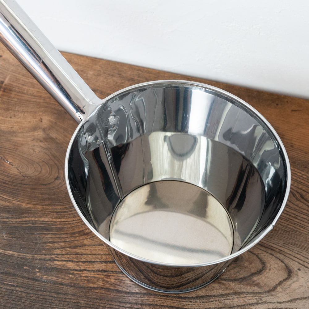 タイの屋台やキッチンなどで使われている大きな柄杓です。現地では、寸胴鍋からスープを移す際などに使用されています。このような特大サイズの柄杓は、なかなか手に入りづらいですね。ステンレス製なので、衛生的で汚れが匂いがつきにくい点も利点です。さまざまな原料の移動などにも使えそうです。